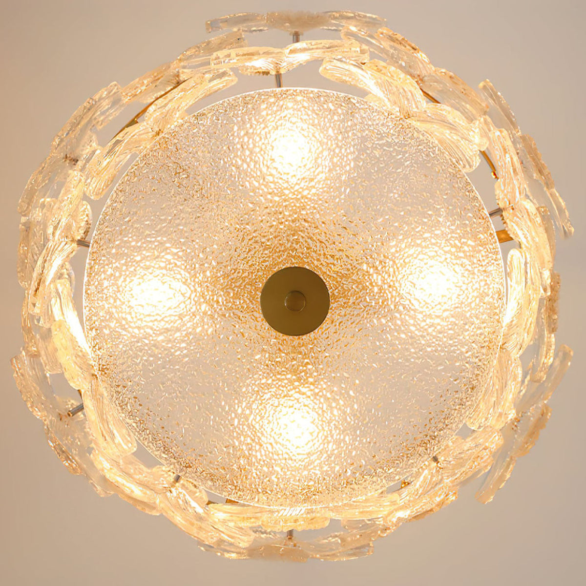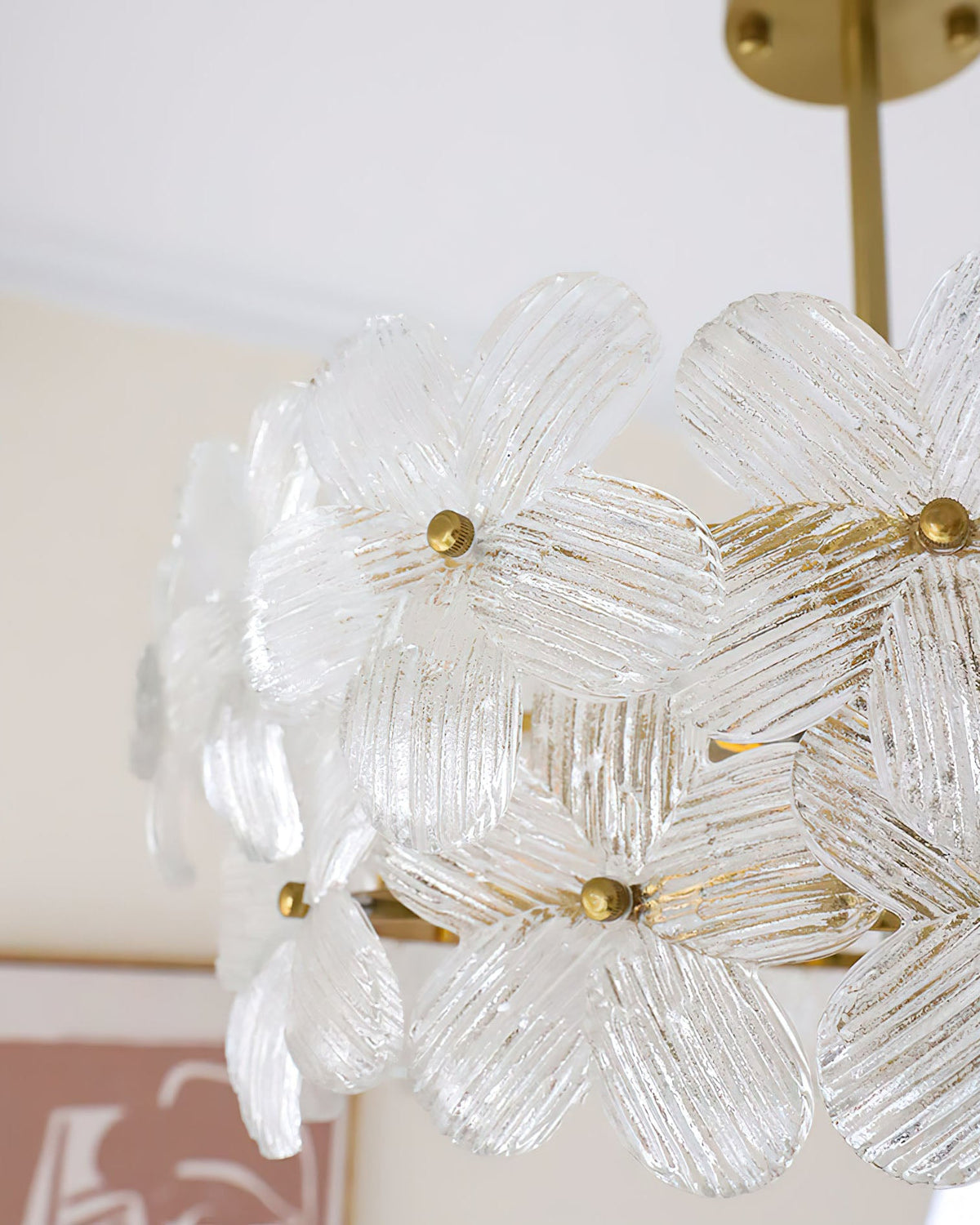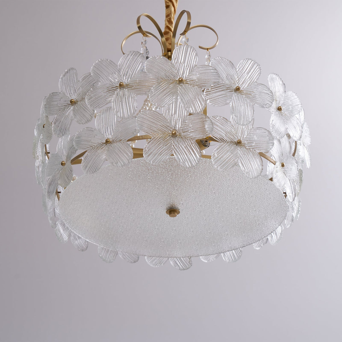 - Crafted from solid brass, the frame offers a rich, elegant metallic luster and a refined texture that promises exceptional durability and corrosion resistance. It is a investment in lasting quality.Each glass lampshade is a marvel, featuring a clear, intricate flower-shaped pattern with excellent light transmittance. The textured glass softly diffuses light, creating a stunning layered glow and unique light and shadow effects on your walls and ceiling.