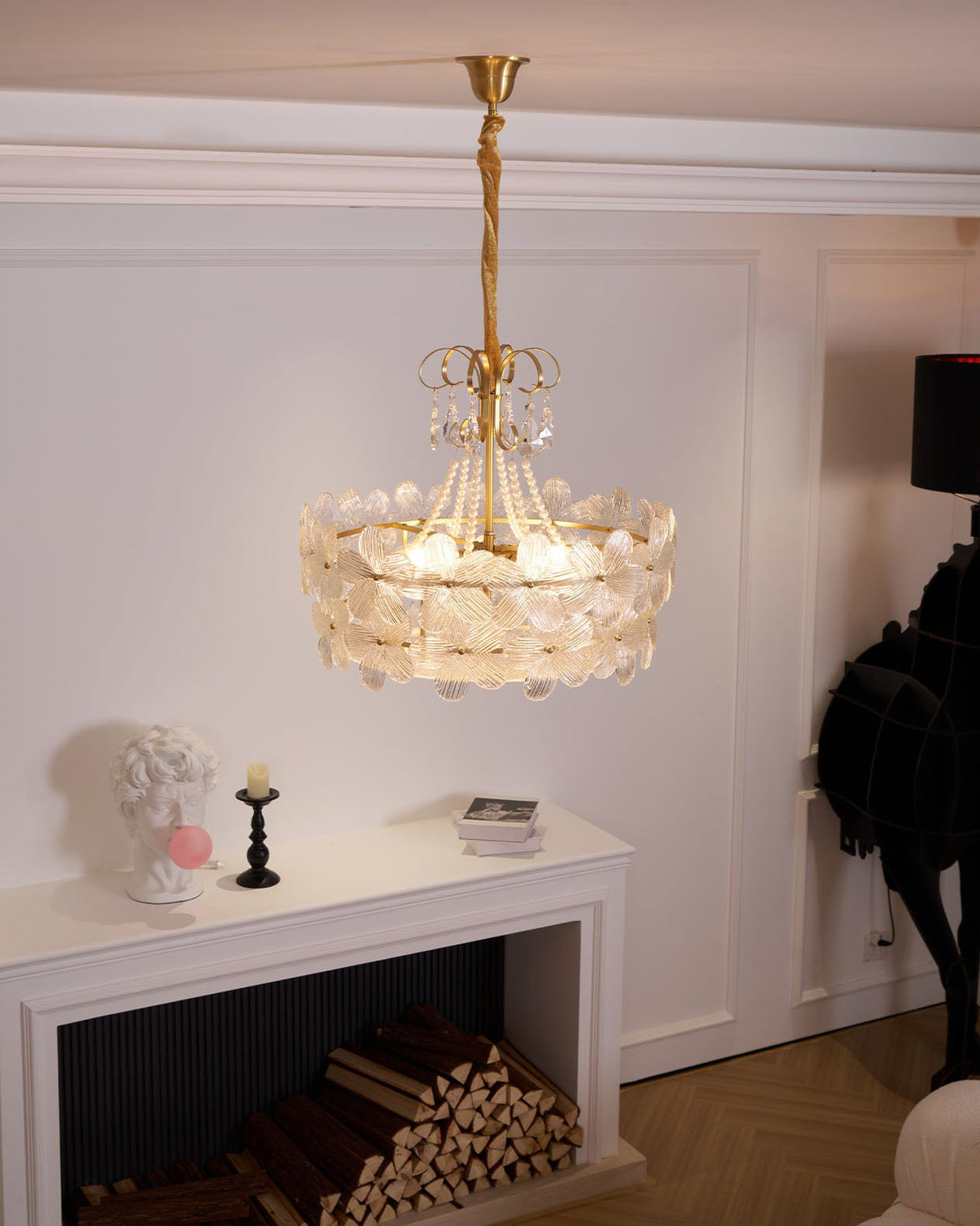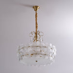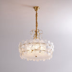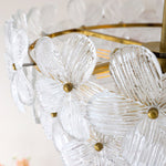 - Drawing inspiration from a cluster of blooming flowers, the Mardell Chandelier is a testament to artistic design. Its rounded brass body is gracefully encircled by delicate glass petals, each one meticulously shaped to capture the soft, organic beauty of nature. The polished brass connectors add a touch of structural elegance, making this fixture a work of art even when unlit.
