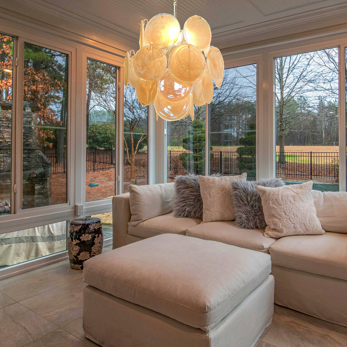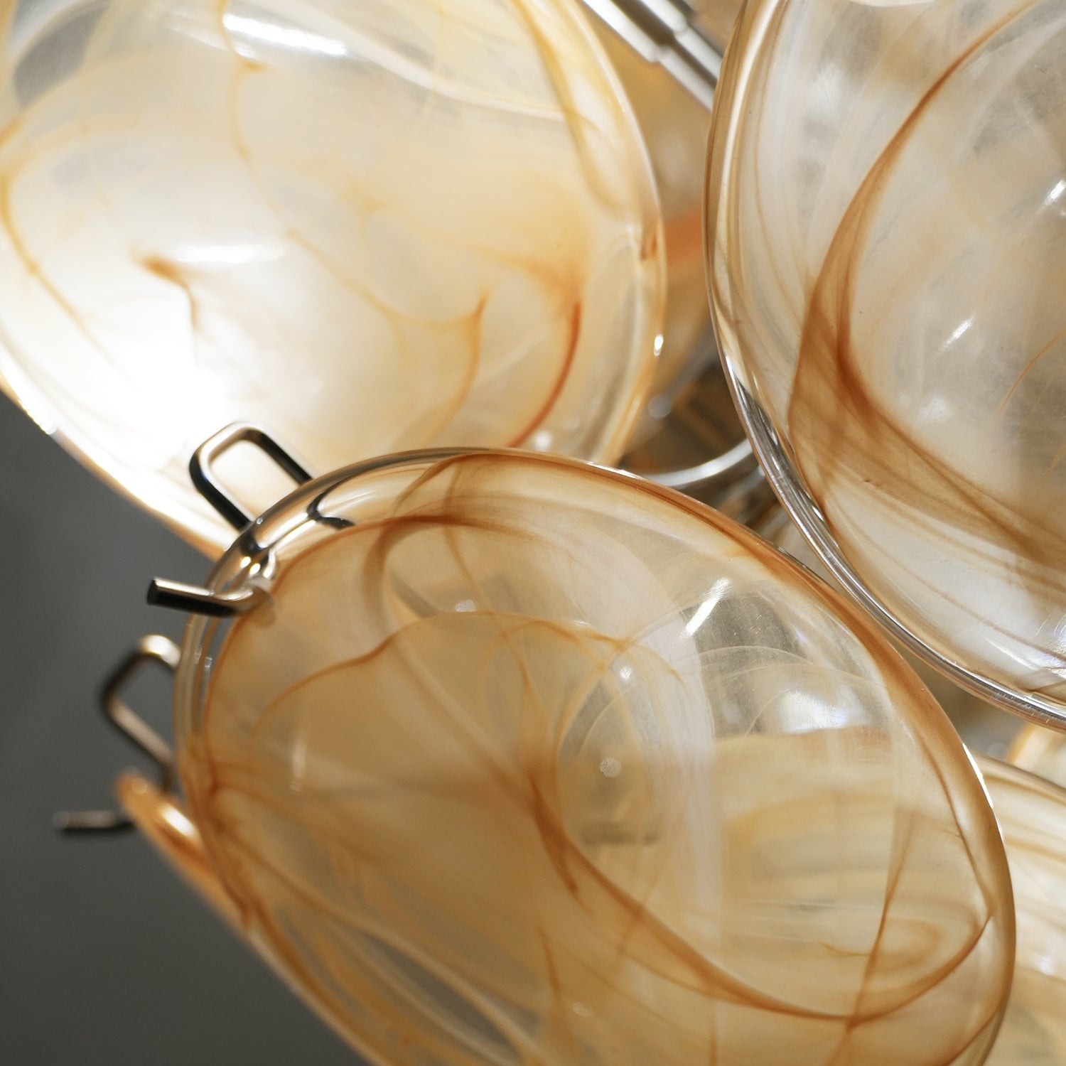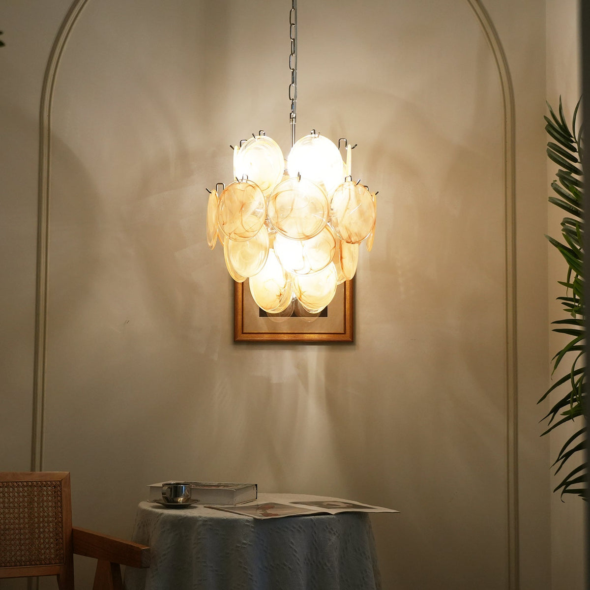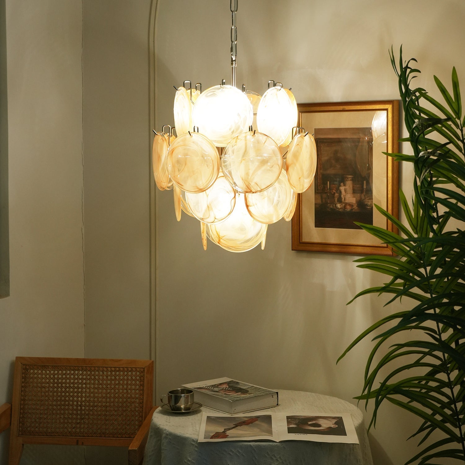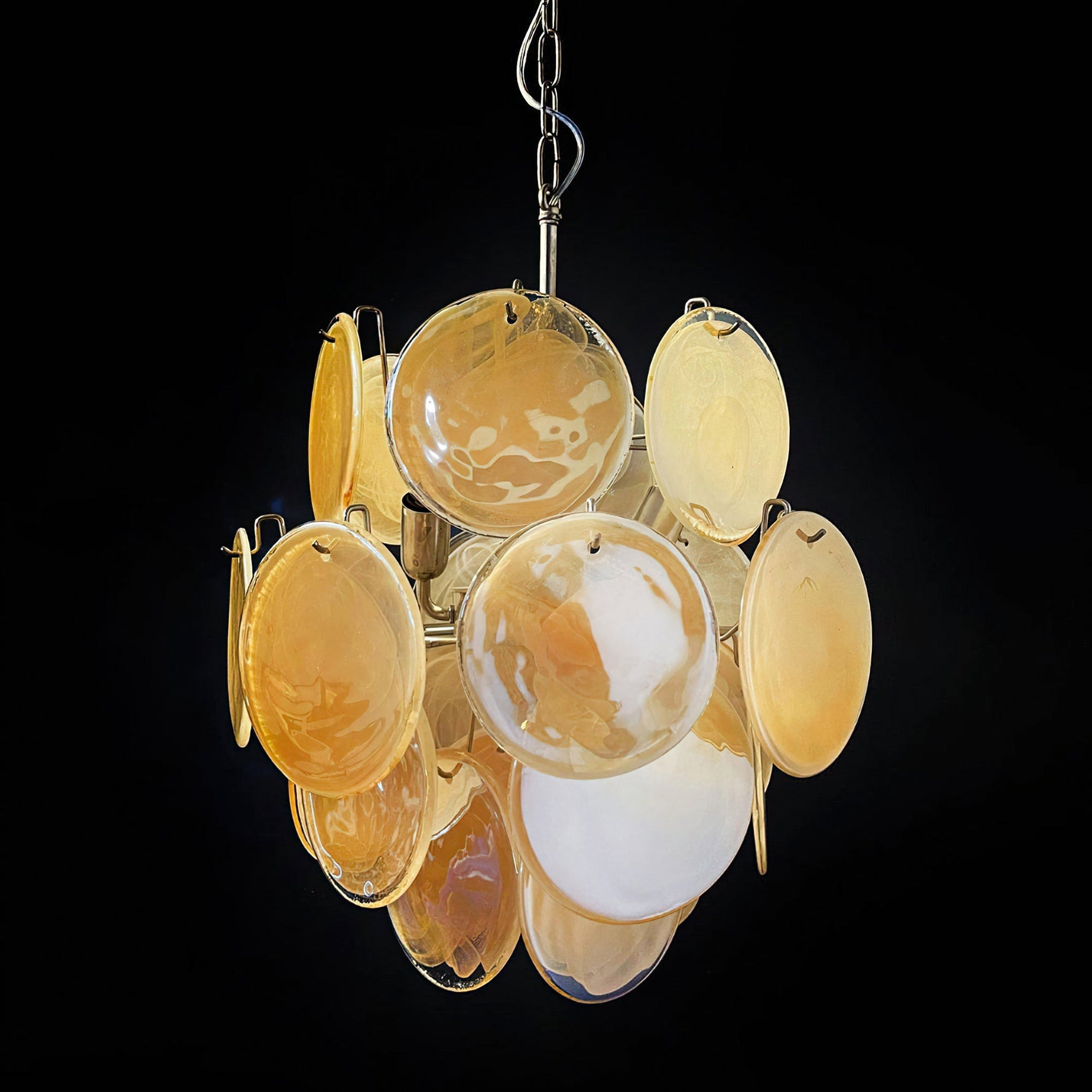 - Transform your space into a gallery of light and texture with the Murano Gold Disc Chandelier 24 at the heart of its design lies a breathtaking spherical form, a complex geometry achieved through an arrangement of multiple hand-finished glass panels. Each sheet of glass is uniquely textured, capturing and softening light with the organic irregularity of a master craftsman's touch. This is not mass-produced glass; it possesses a character and depth that evokes the celebrated spirit of Murano glassmaking, where light itself becomes the medium.