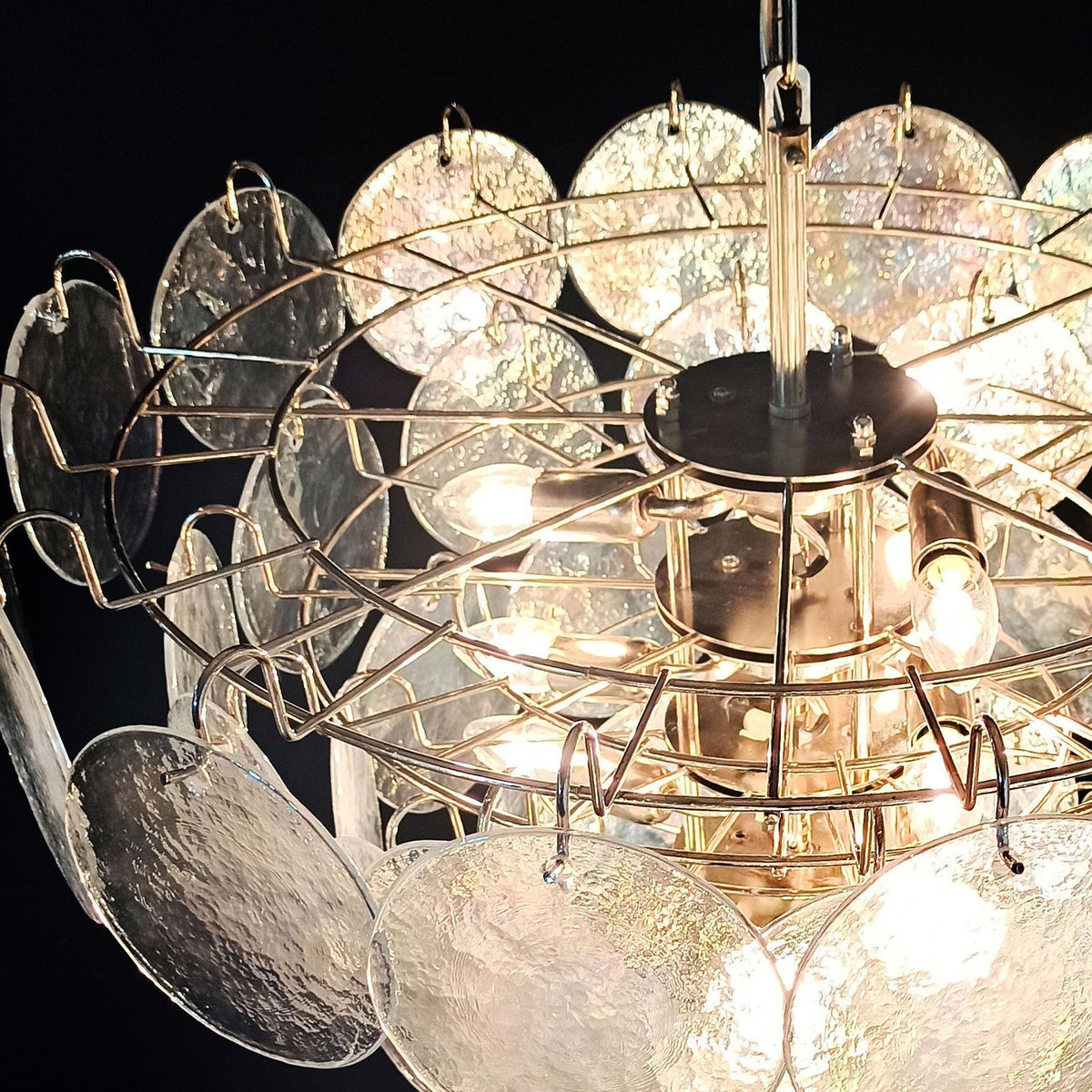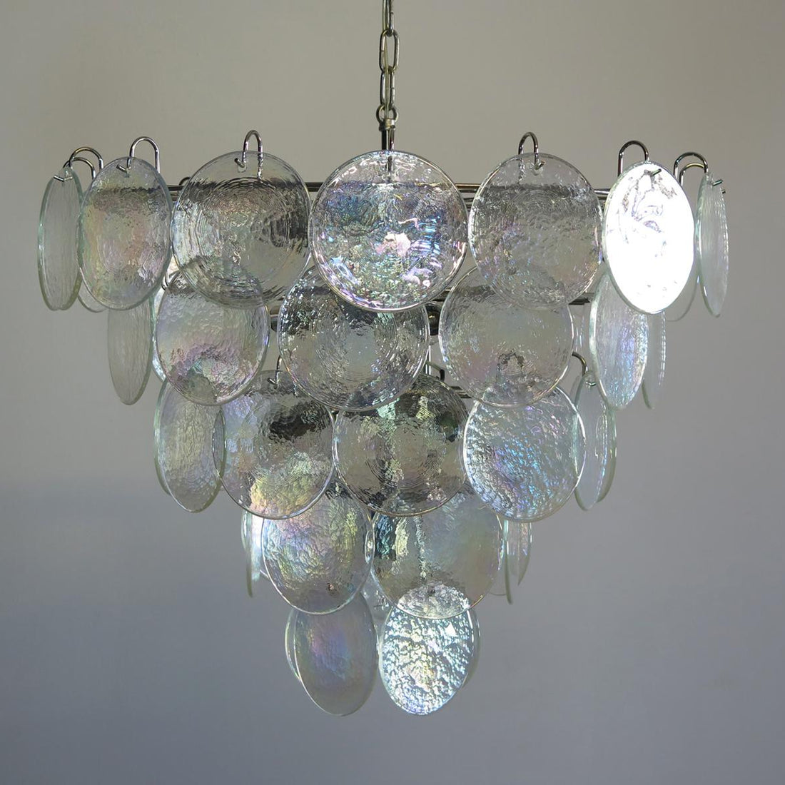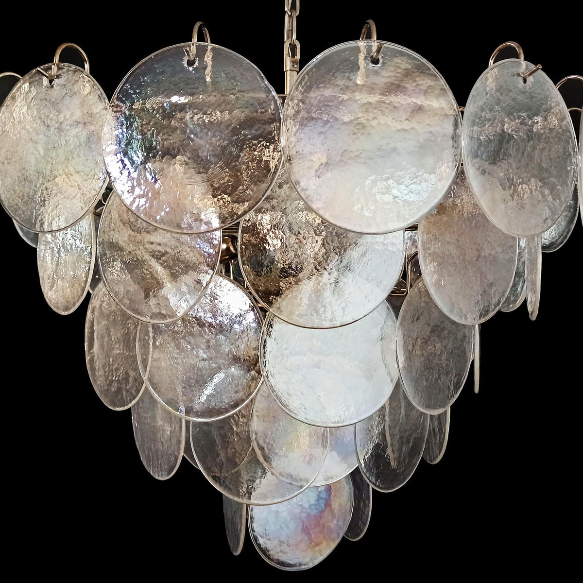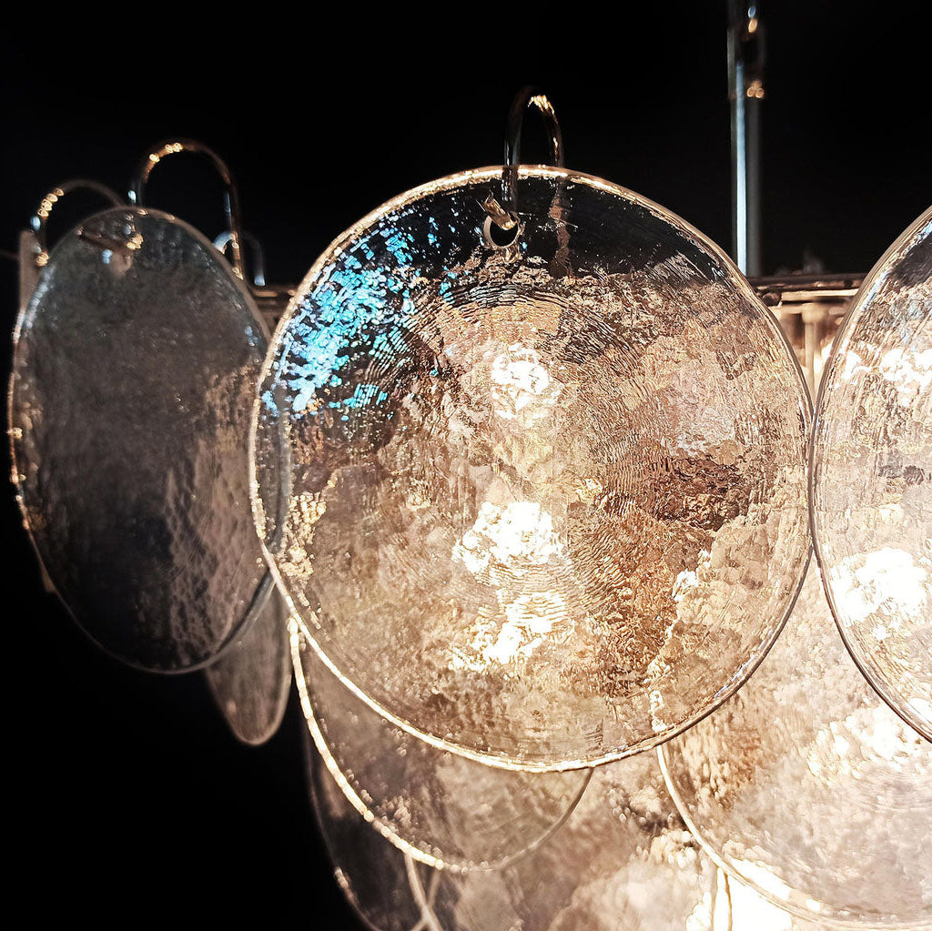 • Each component of Murano Iridescent Grit Disc Chandelier 57 tells a story of superior craftsmanship.Features multiple pieces of clear, textured glass. Each disc boasts a unique, delicate grain that resembles natural carvings, ensuring your piece is one-of-a-kind.