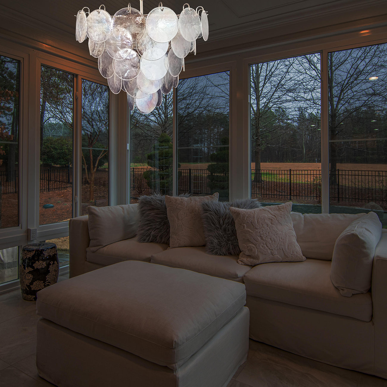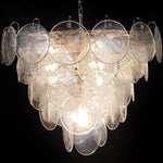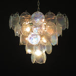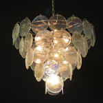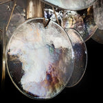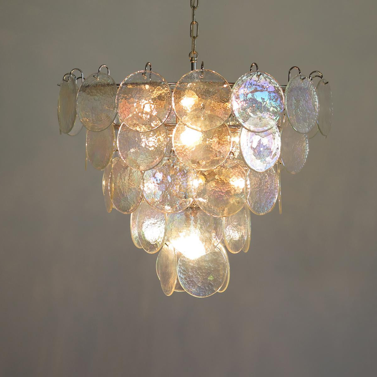 • Bask in the glow of artisan-crafted elegance. The Murano Iridescent Grit Disc Chandelier 57 is more than a light source; it is a breathtaking sculptural centerpiece, meticulously designed to transform any room into a gallery of light and shadow. Drawing inspiration from the legendary glassblowing heritage of Murano, Italy, this chandelier is a modern masterpiece where industrial strength meets delicate artistry.