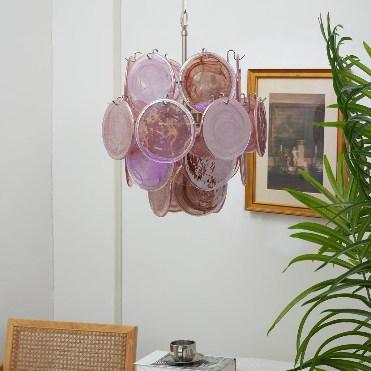 • Elevate your interior décor with the exquisite Murano Pink Disc Chandelier 24, a masterpiece where timeless artistry meets modern design. This stunning fixture features a harmonious blend of a sturdy iron frame and dozens of delicately crafted glass discs, creating a sculptural piece that is as beautiful illuminated as it is unlit. Designed to be a captivating focal point, it infuses any room with an aura of sophisticated romance and warm, inviting light.