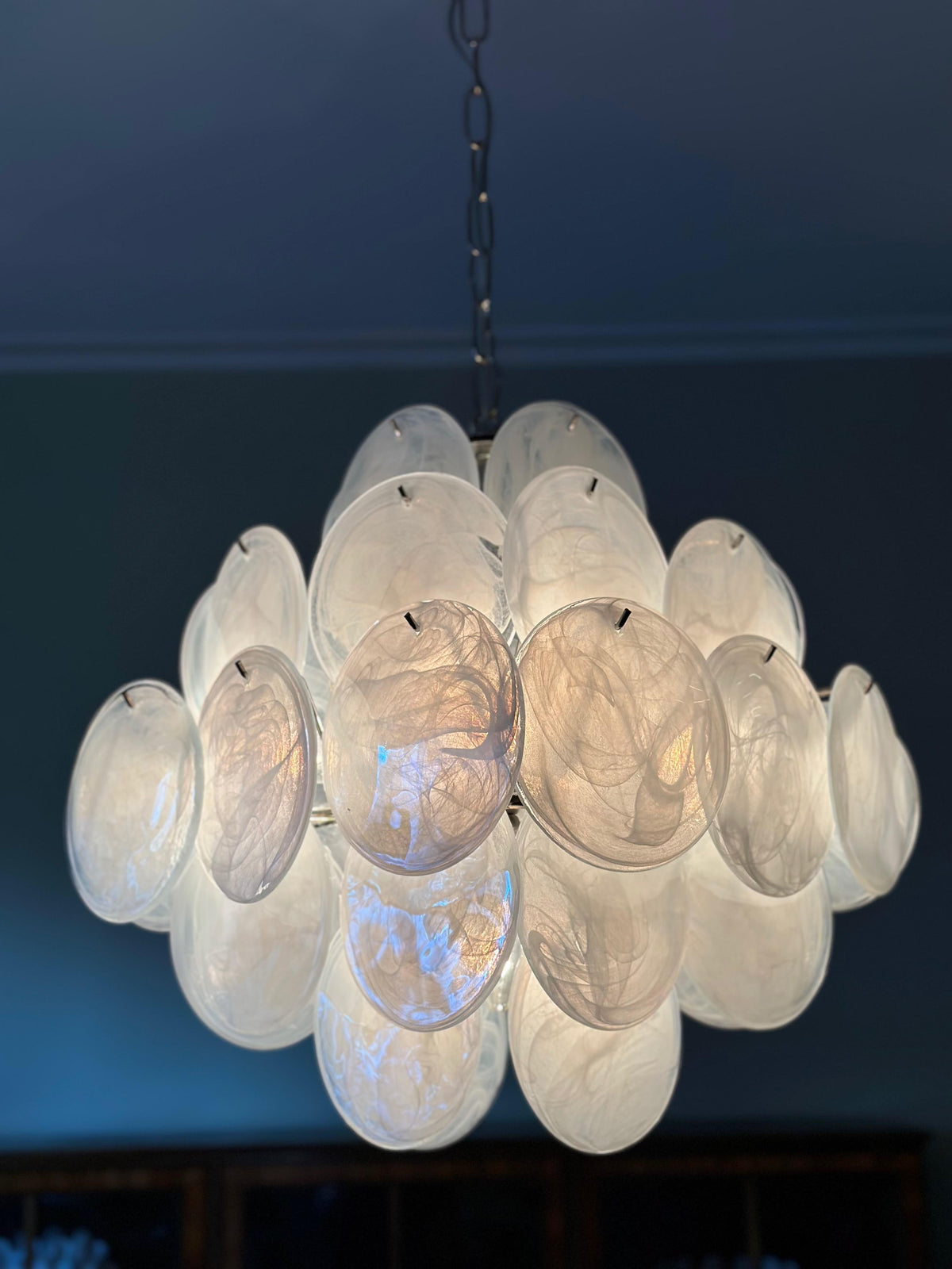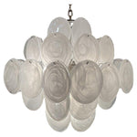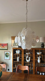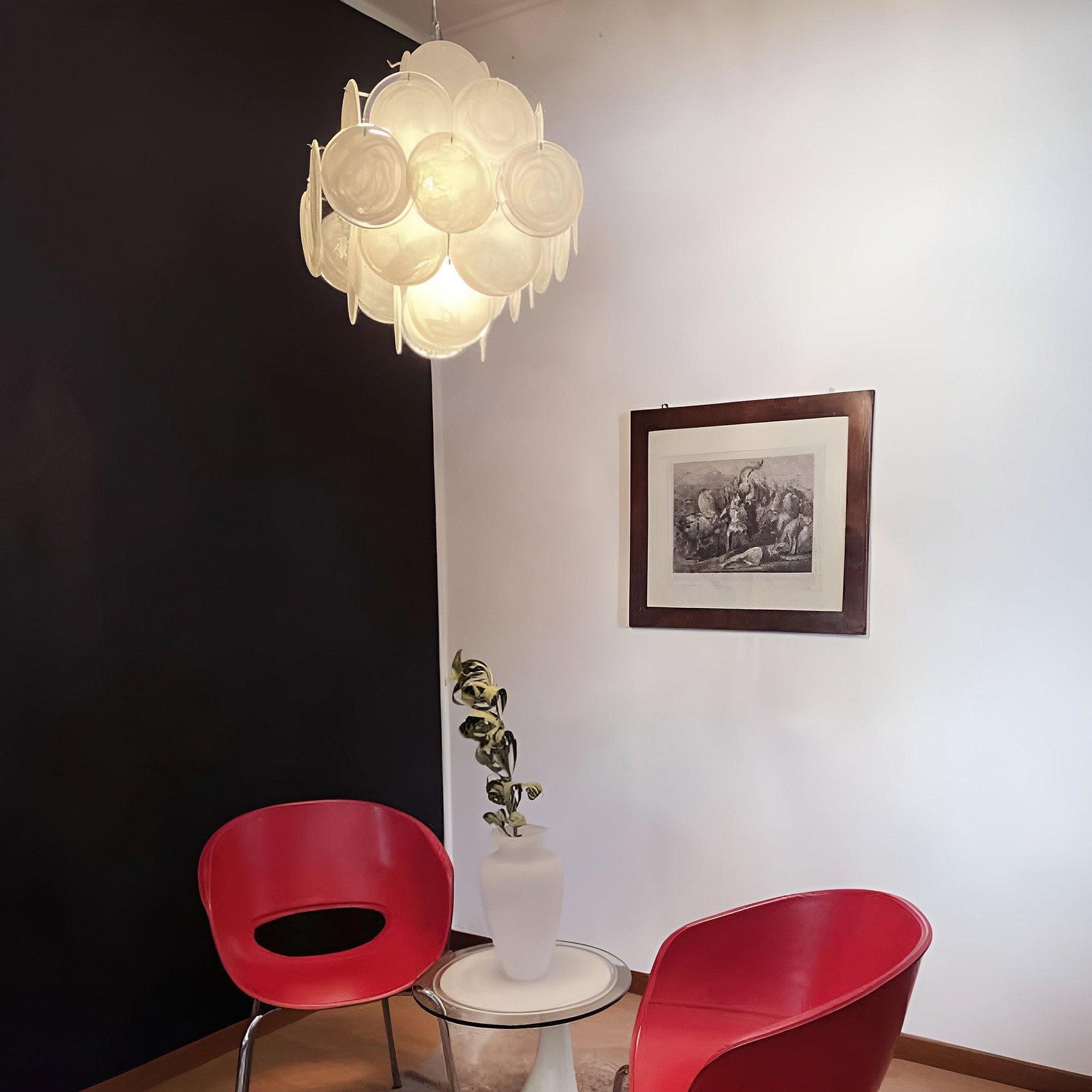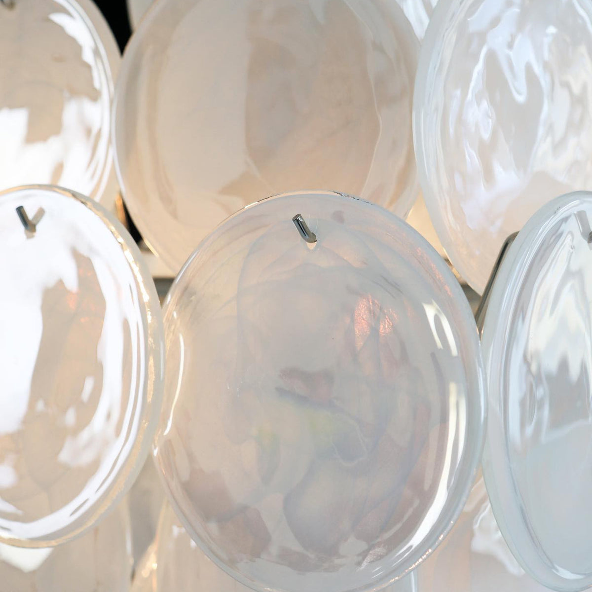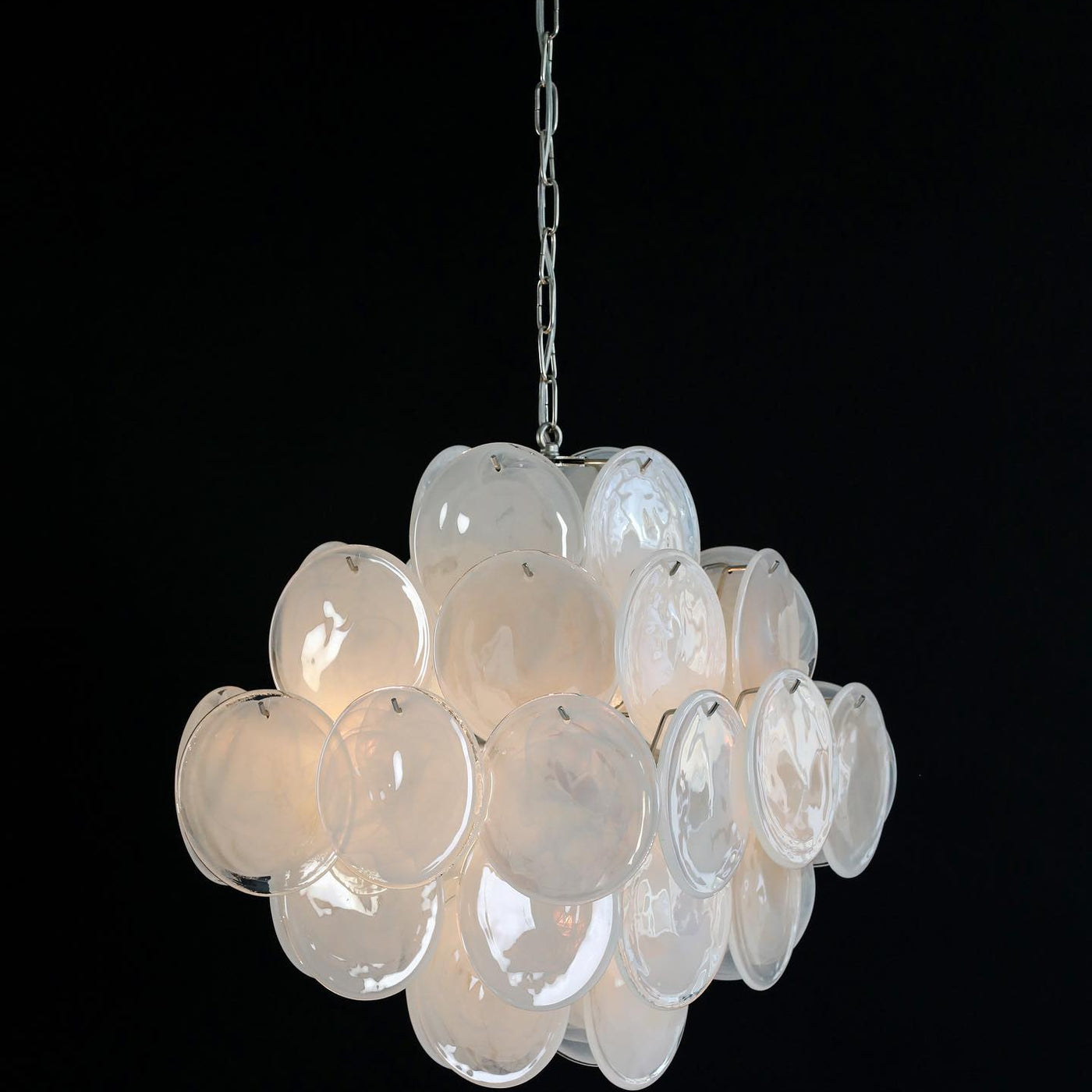 • The Murano White Disc Chandelier 36's architecture is a study in balanced design. A robust iron framework, finished in a deep matte black, provides a strong and stable structural core. This framework is expertly engineered to cradle an array of textured white glass panels, arranging them into a perfect, harmonious sphere. The bold, linear quality of the iron beautifully offsets the organic, delicate nature of the glass, resulting in a piece that is both strikingly modern and timelessly elegant. This is not merely a lighting fixture; it is a statement of refined industrial design.