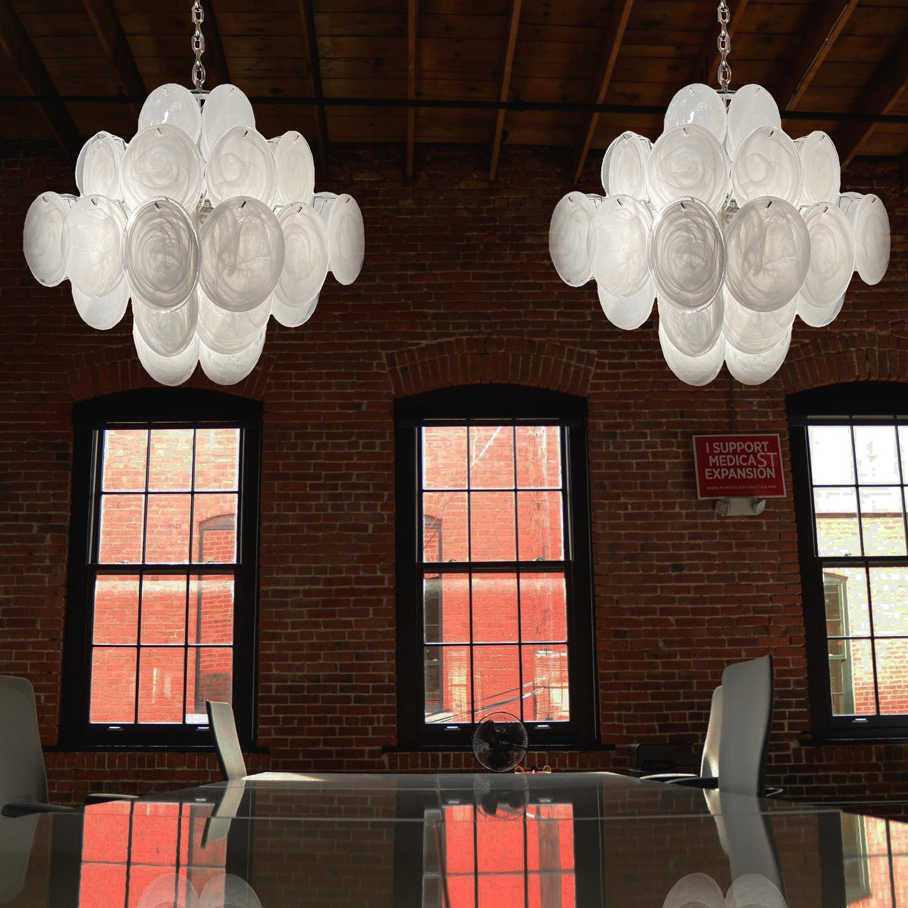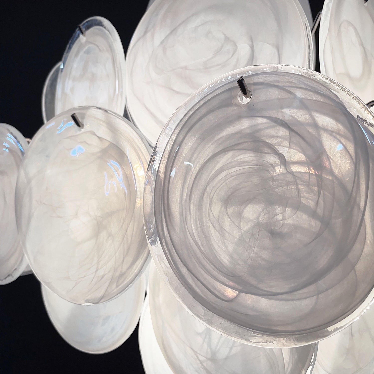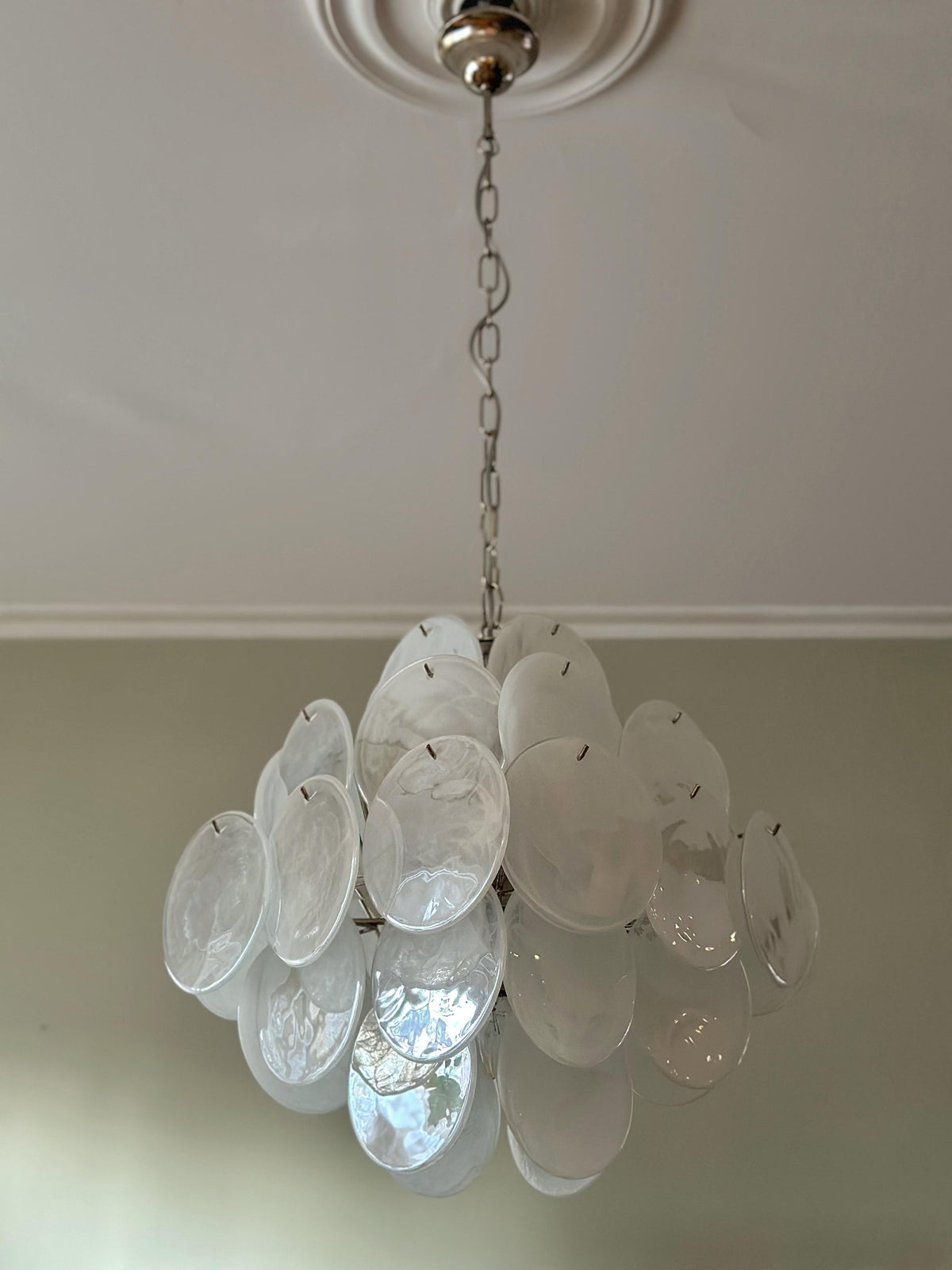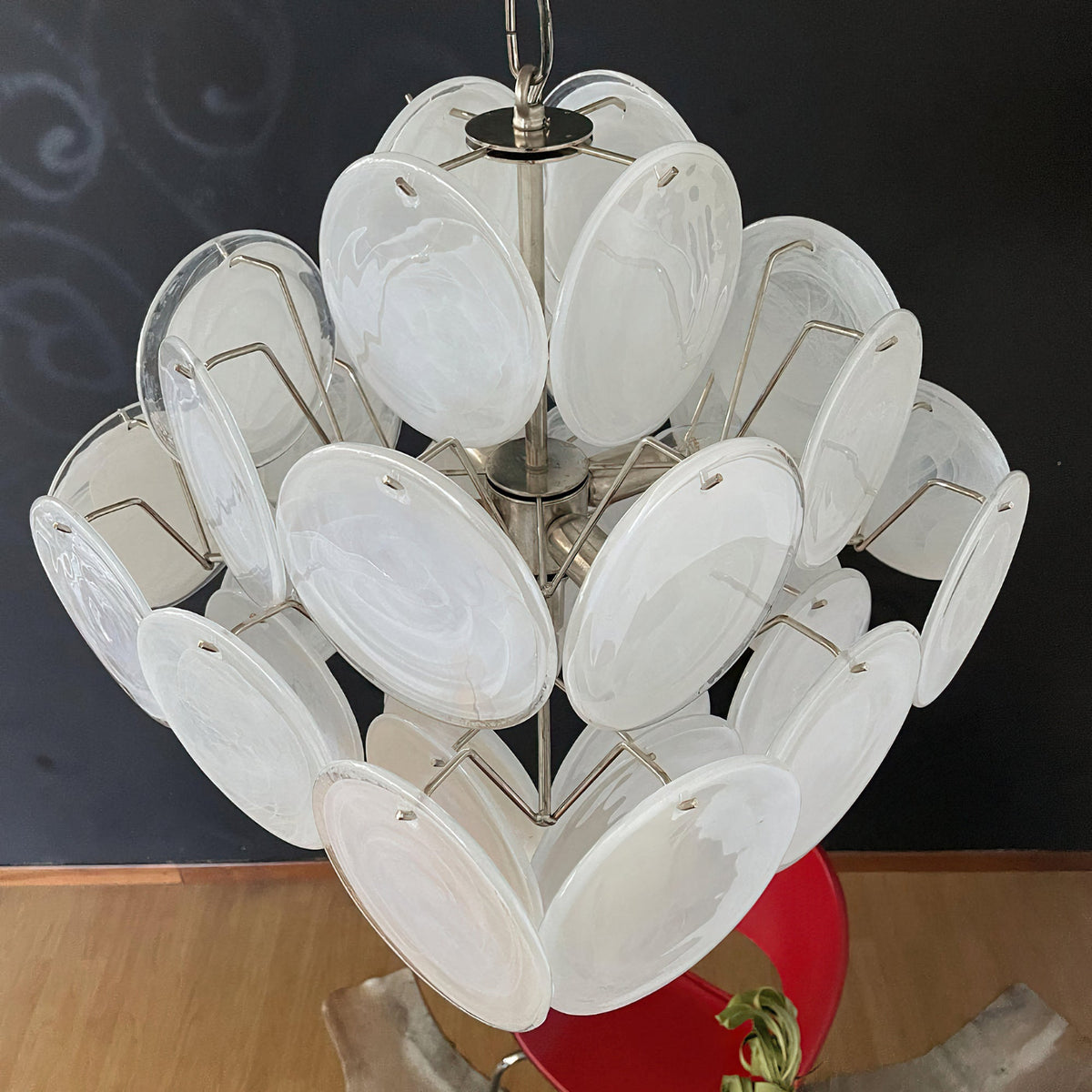 • The Murano White Disc Chandelier 36's architecture is a study in balanced design. A robust iron framework, finished in a deep matte black, provides a strong and stable structural core. This framework is expertly engineered to cradle an array of textured white glass panels, arranging them into a perfect, harmonious sphere. The bold, linear quality of the iron beautifully offsets the organic, delicate nature of the glass, resulting in a piece that is both strikingly modern and timelessly elegant. This is not merely a lighting fixture; it is a statement of refined industrial design.