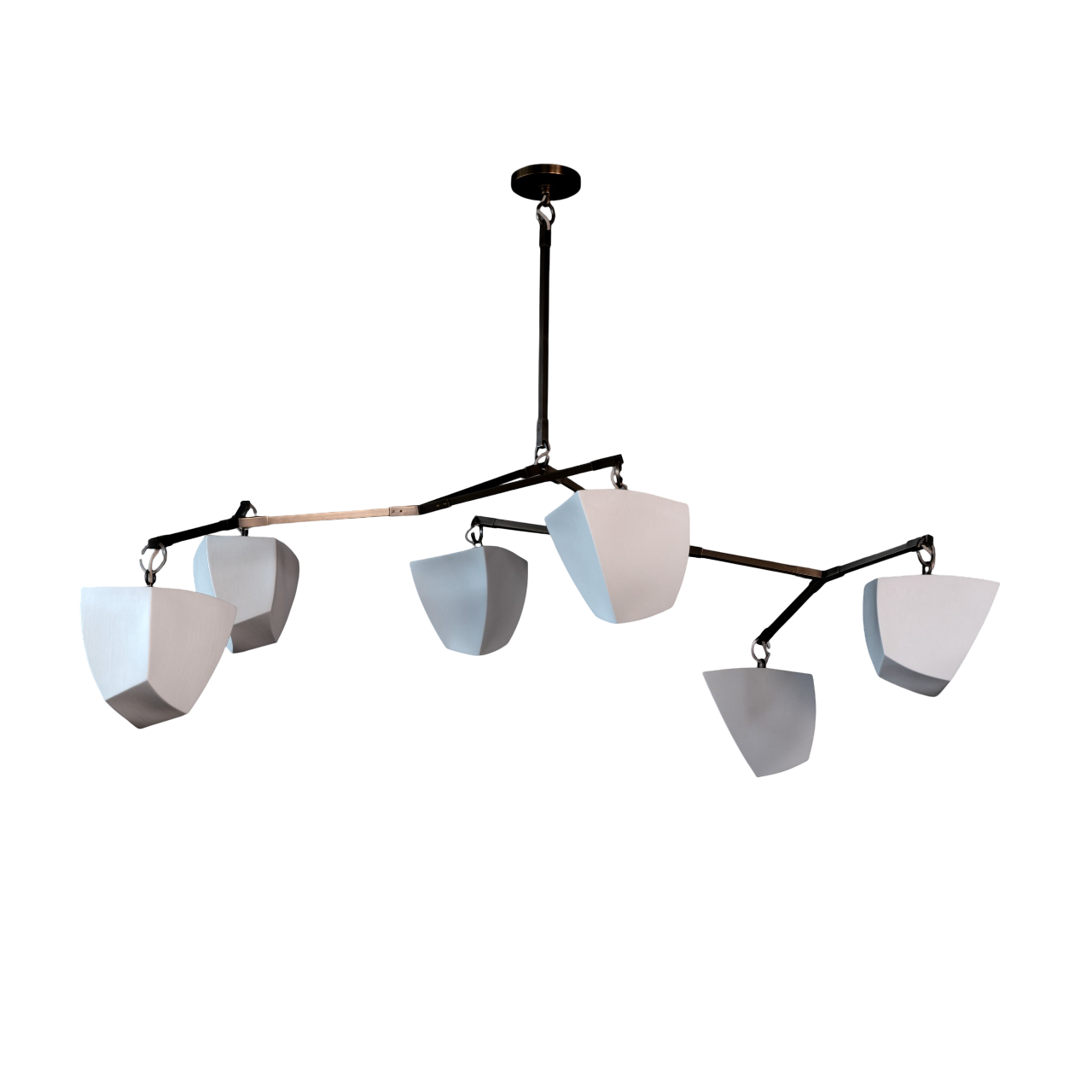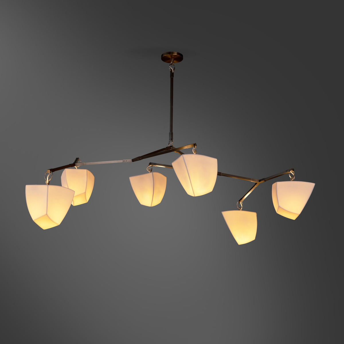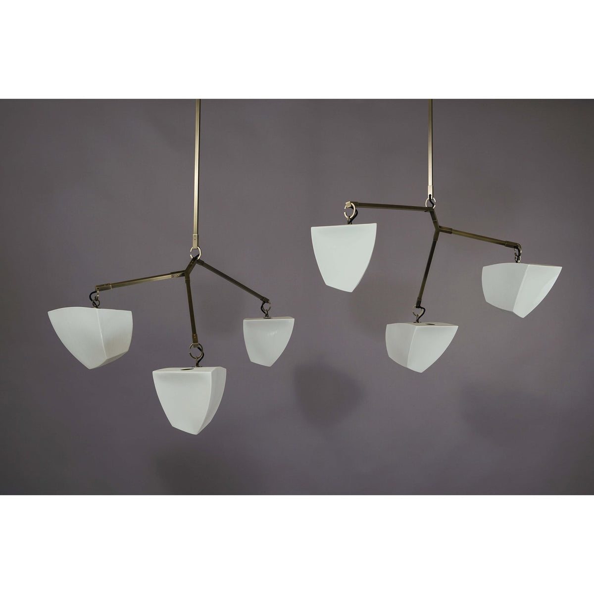 - A delicate balance of light and sculpture, the Porcelain Cassiopeia Mobile Chandelier reimagines the traditional chandelier with an air of modern artistry. Handcrafted translucent porcelain shades float gracefully from a single stem, their ethereal forms appearing solid and sculptural when unlit—only to transform into radiant, glowing orbs once illuminated.