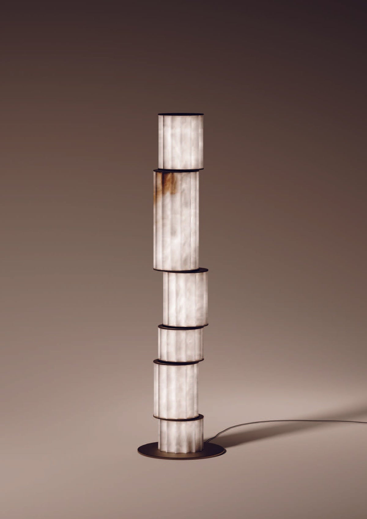 - Crafted from a single, seamless cylinder of fine alabaster, the Akiko lamp is a study in timeless beauty. Its organic, stone-like texture allows light to diffuse through it, creating a warm, inviting, and ambient glow that enhances any room with a serene and sophisticated atmosphere.