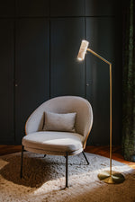 - Introducing the Flamingo Floor Lamp, where art meets function in a stunning silhouette designed to elevate any space. This lamp is a masterclass in contrast, featuring a slender, angled brass stem that plays beautifully against the soft, substantial volume of its unique adjustable alabaster shade.