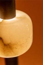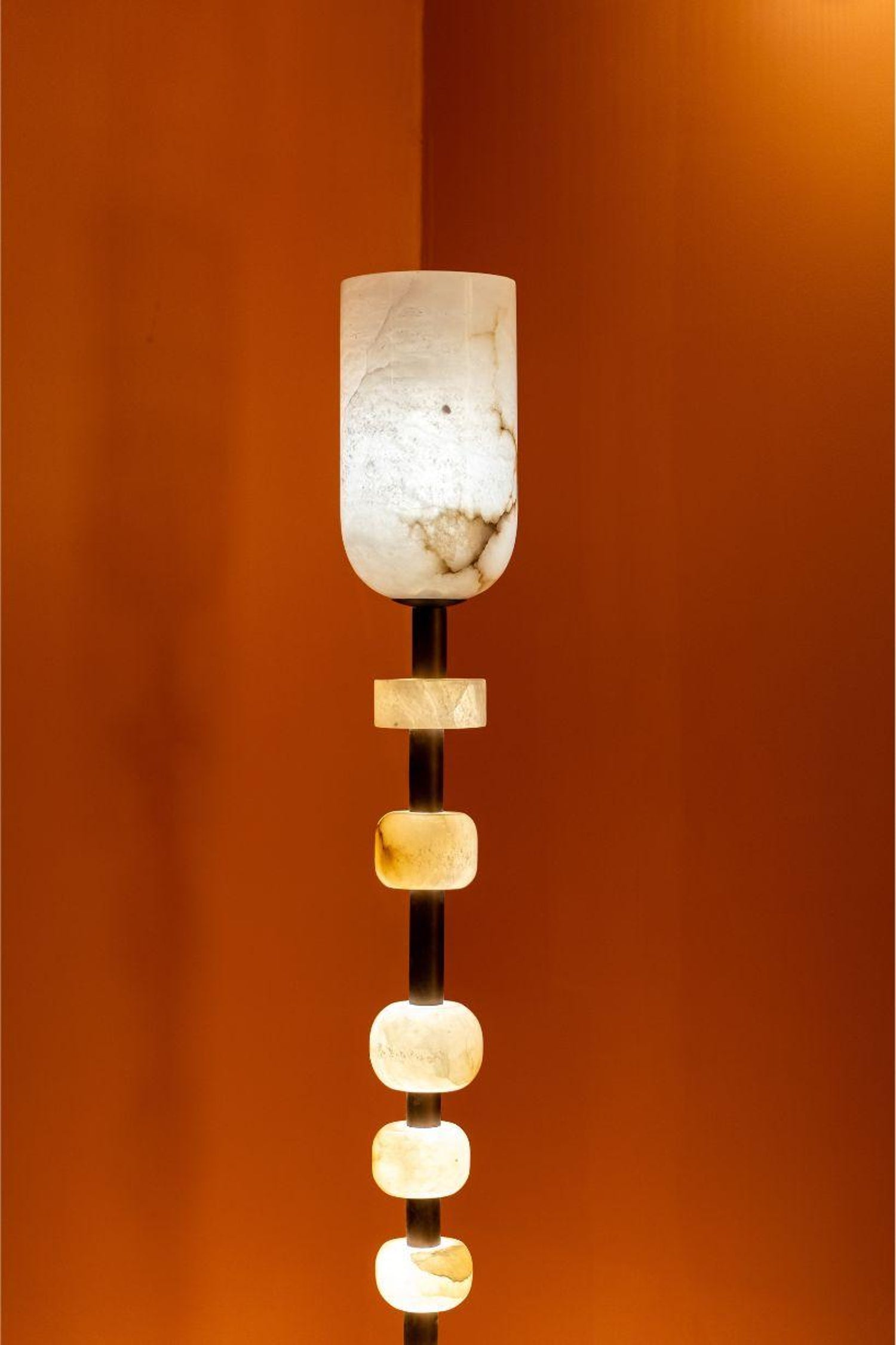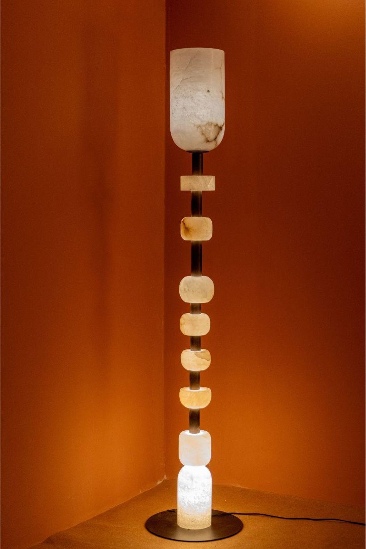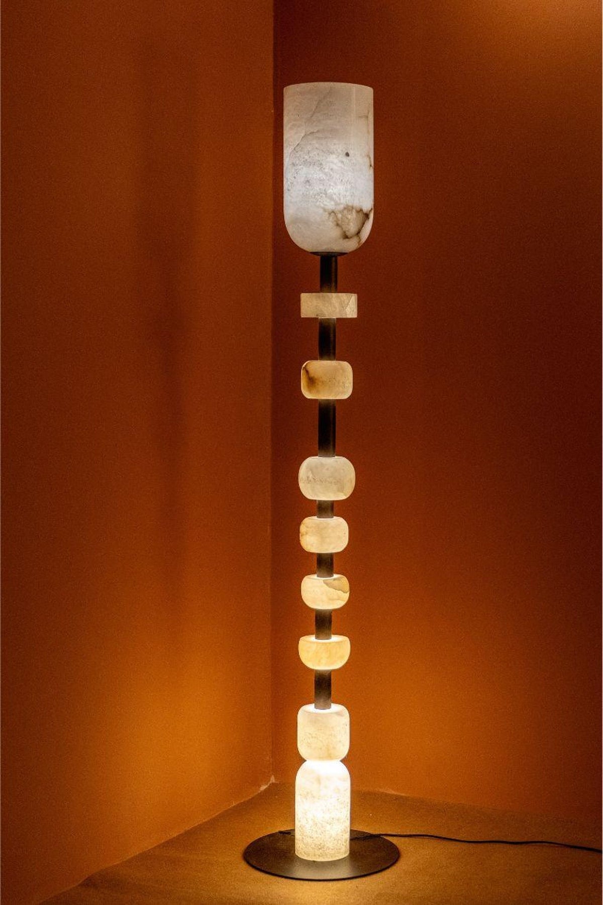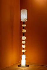 - Introduce a gallery-worthy centerpiece that casts a mesmerizing, warm glow. The Jupiter Totem Floor Lamp is more than just a light source; it's a statement of modern artistry and serene elegance. Expertly crafted by stacking smooth, hand-carved alabaster stone blocks on a sturdy metal base, this lamp is a sculptural tribute to both design and nature.