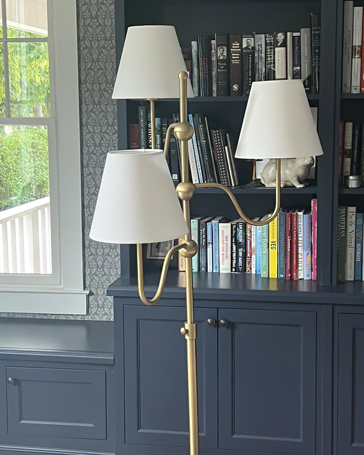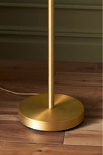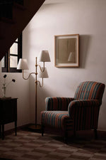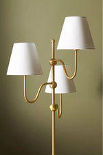 - Elevate your decor with the Luevano Floor Lamp, a stunning blend of sculptural beauty and soft illumination. Crafted in rich antique brass, its graceful triple-arm design adds refined sophistication to any space, while the linen shades diffuse a warm, inviting glow—perfect for creating a cozy ambiance.