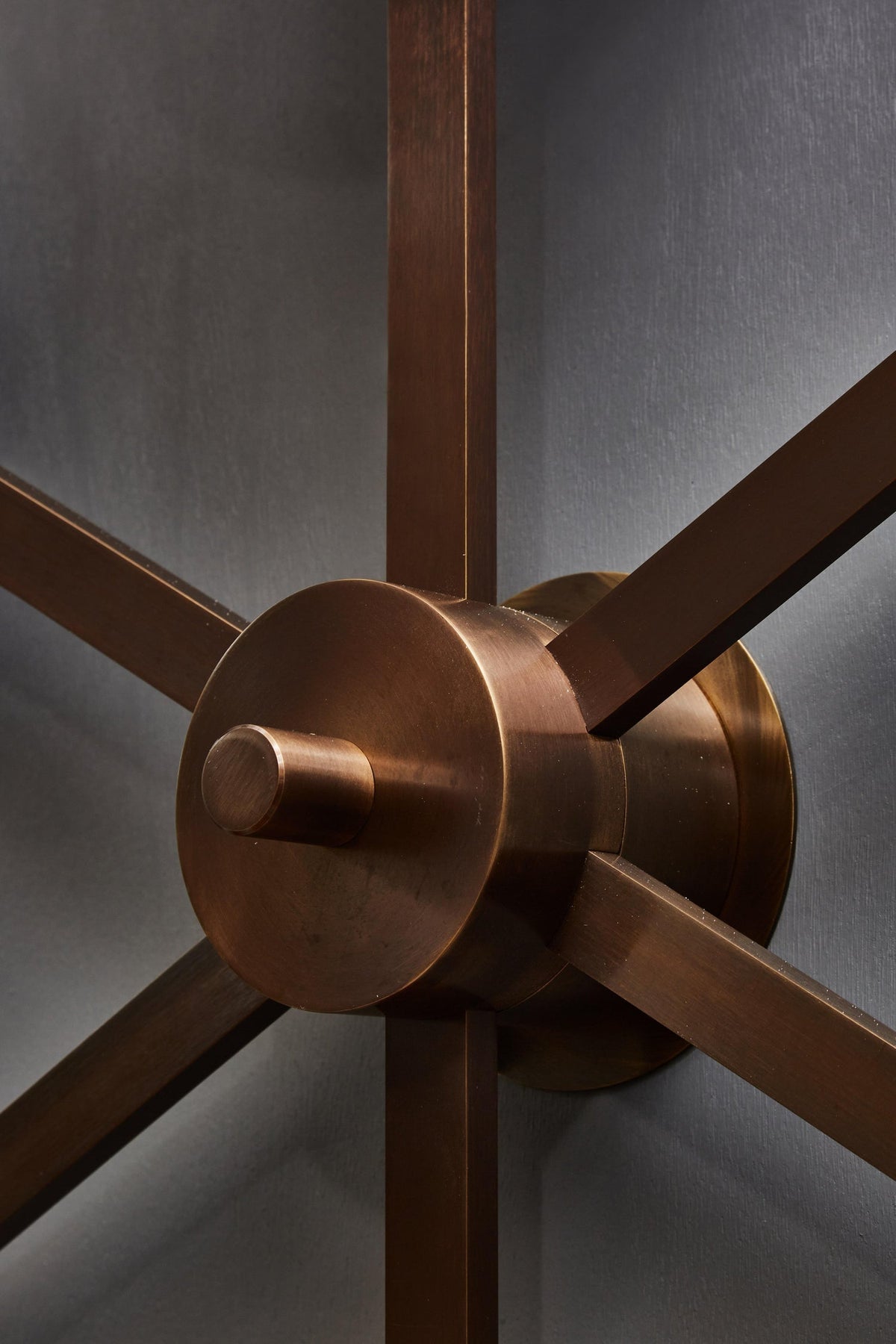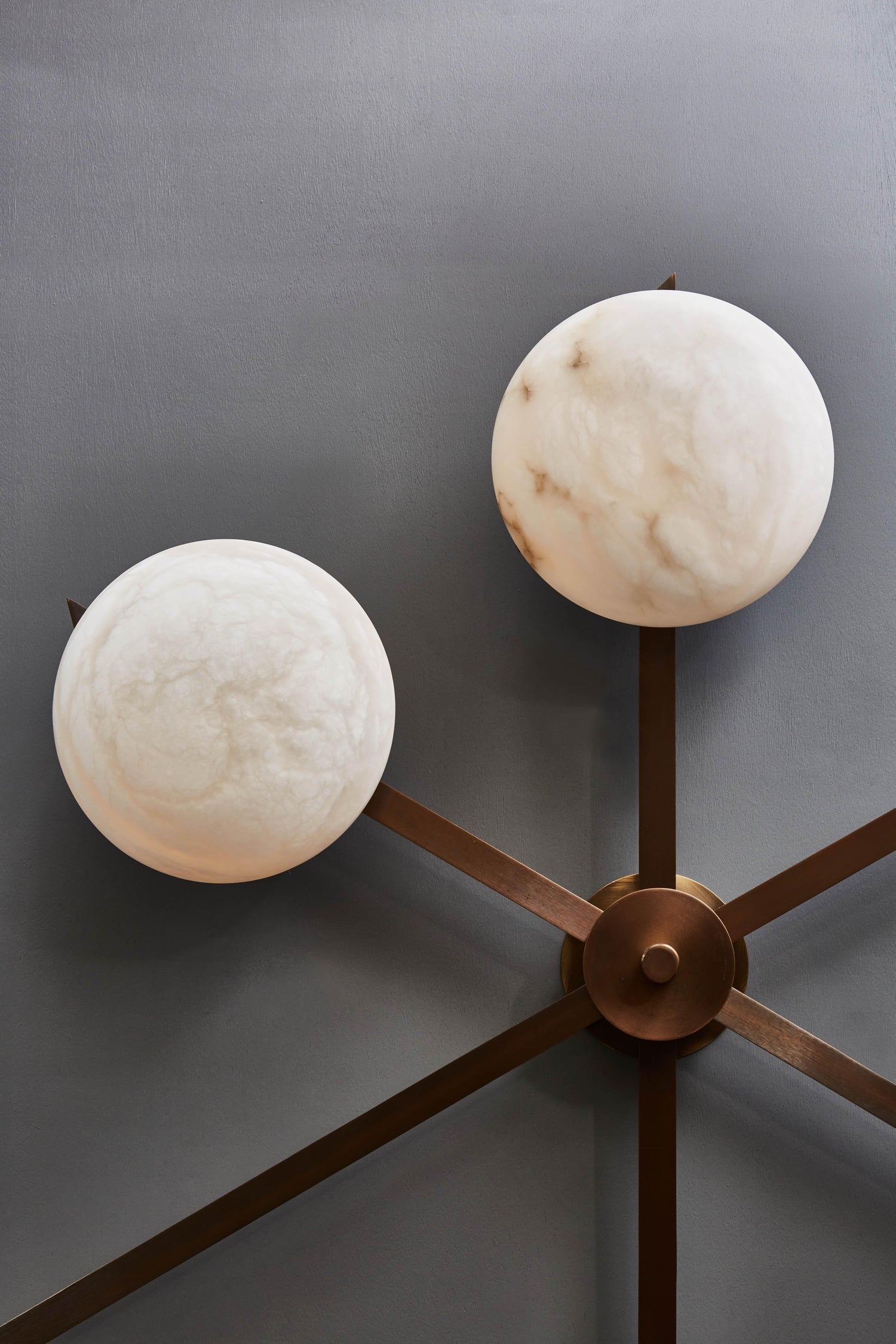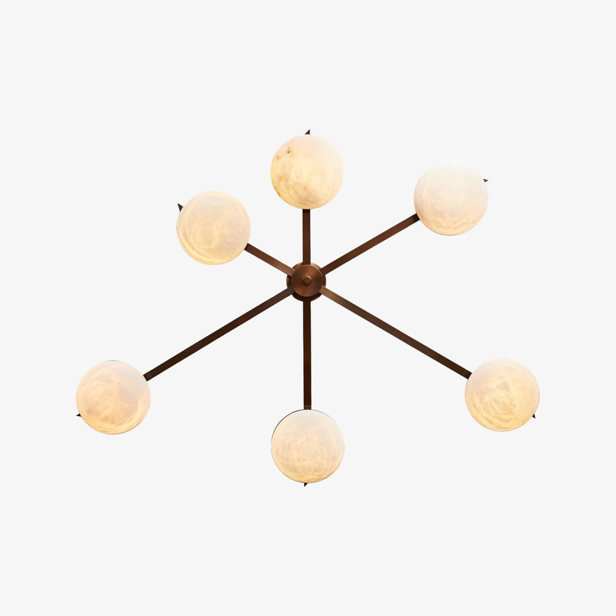 - Introduce an arresting focal point to any room with our Asymmetrical Flush Mount Lamp, where modern design meets organic artistry. Crafted with precision, six gracefully curved brass arms extend asymmetrically from a central core, creating a dynamic, sculptural form that is never the same from every angle. Each arm is meticulously finished to cradle a hand-selected, half-sphere of natural alabaster. The delicate veining and semi-translucent quality of the alabaster ensure that each sconce is utterly unique.