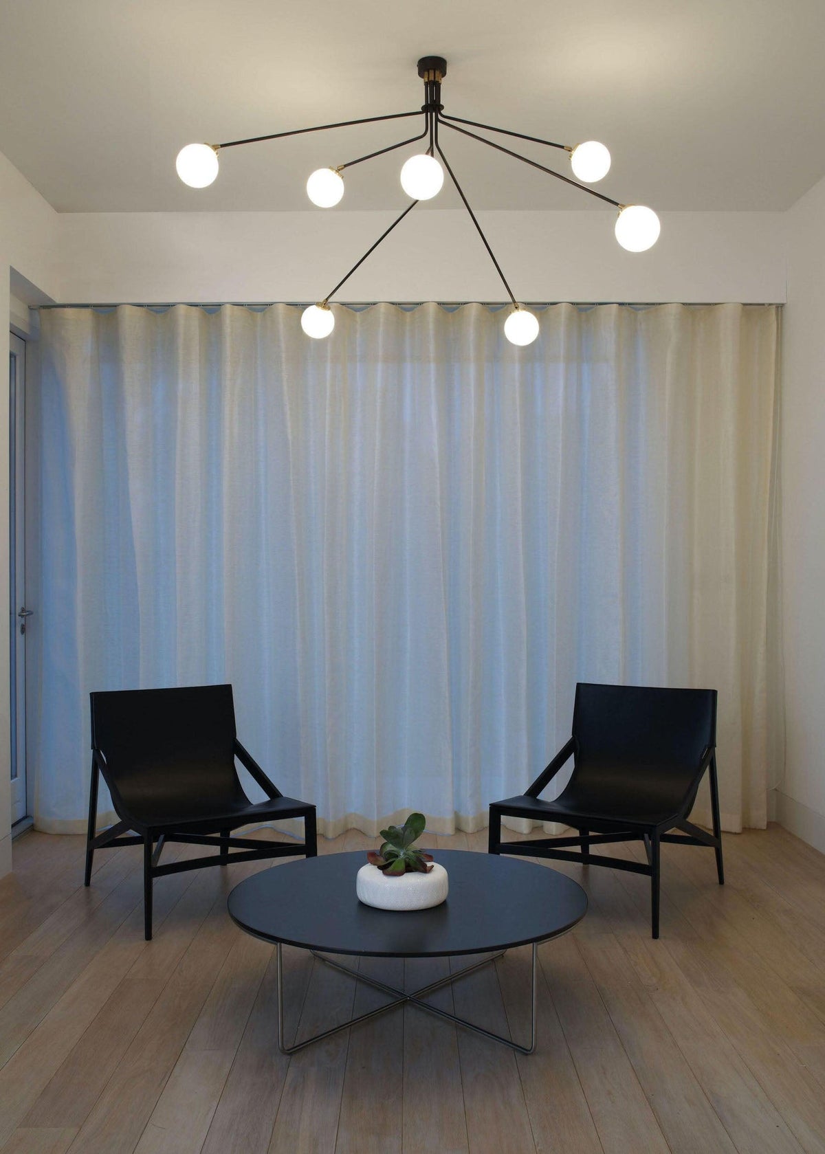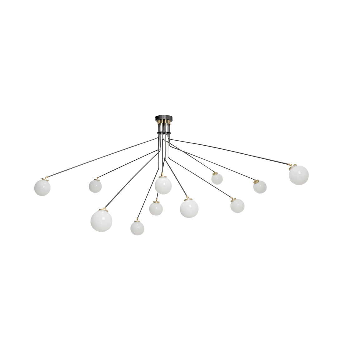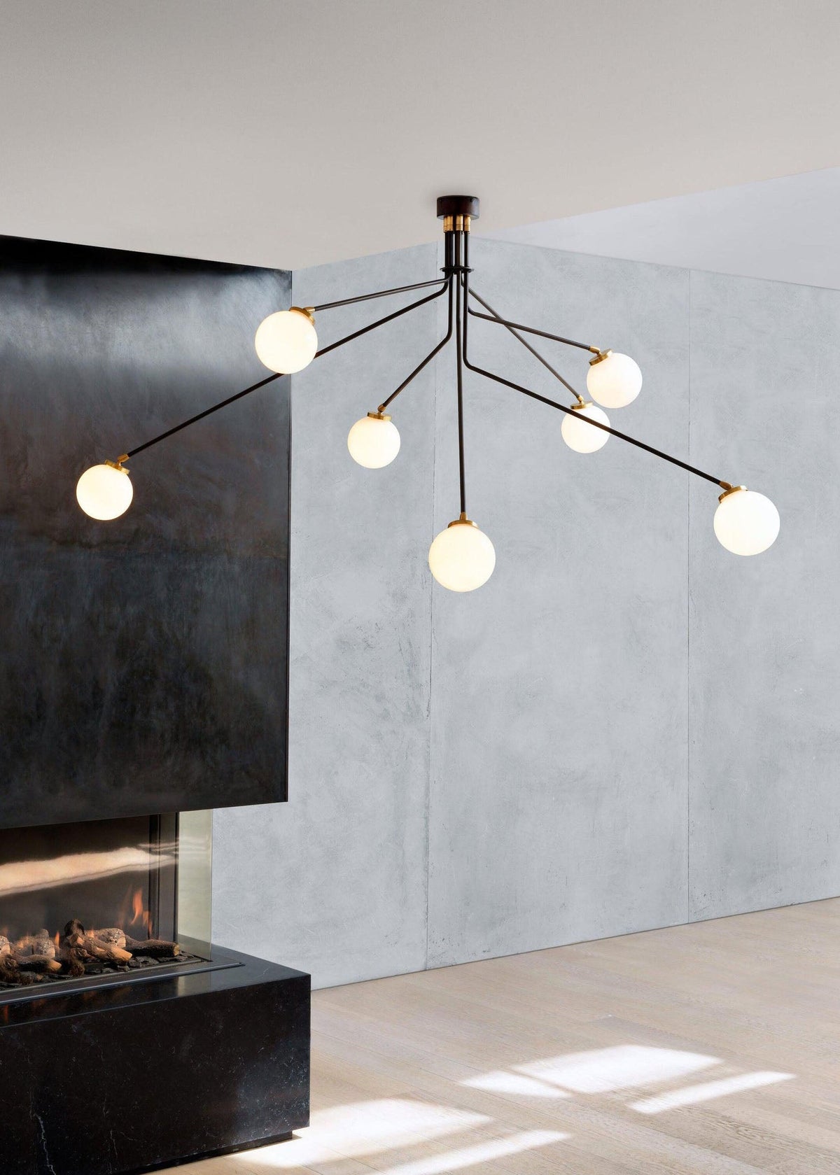 - Handcrafted with precision, Hoskins Ceiling Lamp features three hand-blown opal glass globes, softly diffusing light in a warm, inviting glow. Suspended from slender, gracefully angled stems with a sleek metallic brass or black finish, the design strikes a perfect balance between organic fluidity and geometric sophistication.