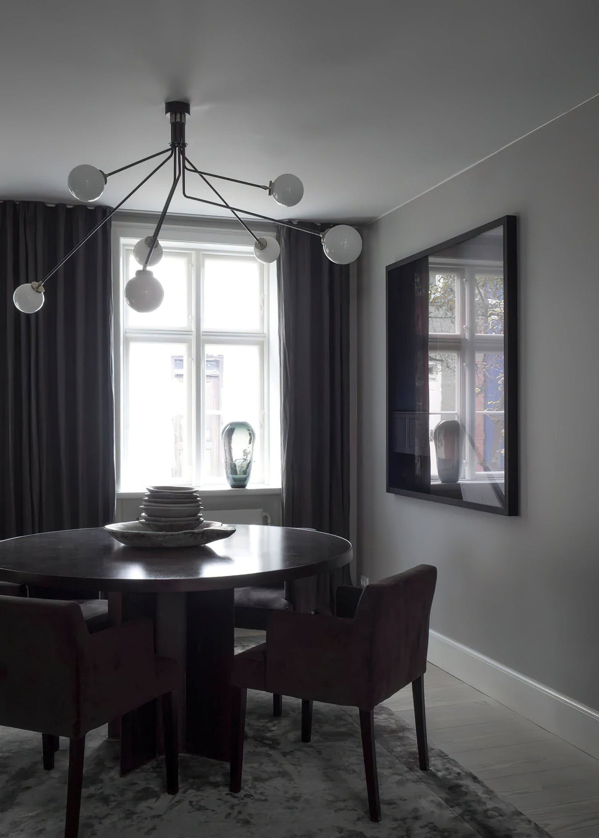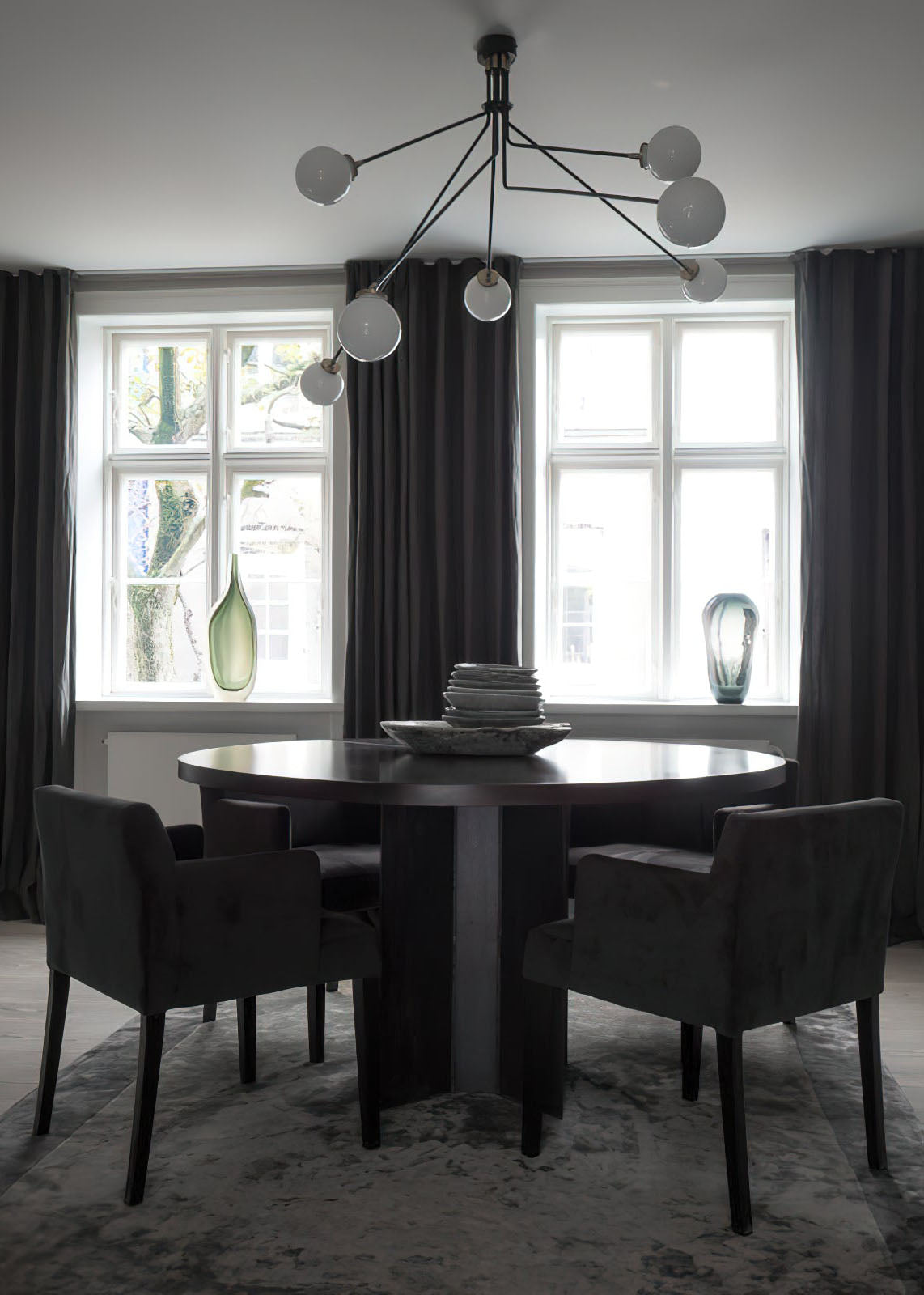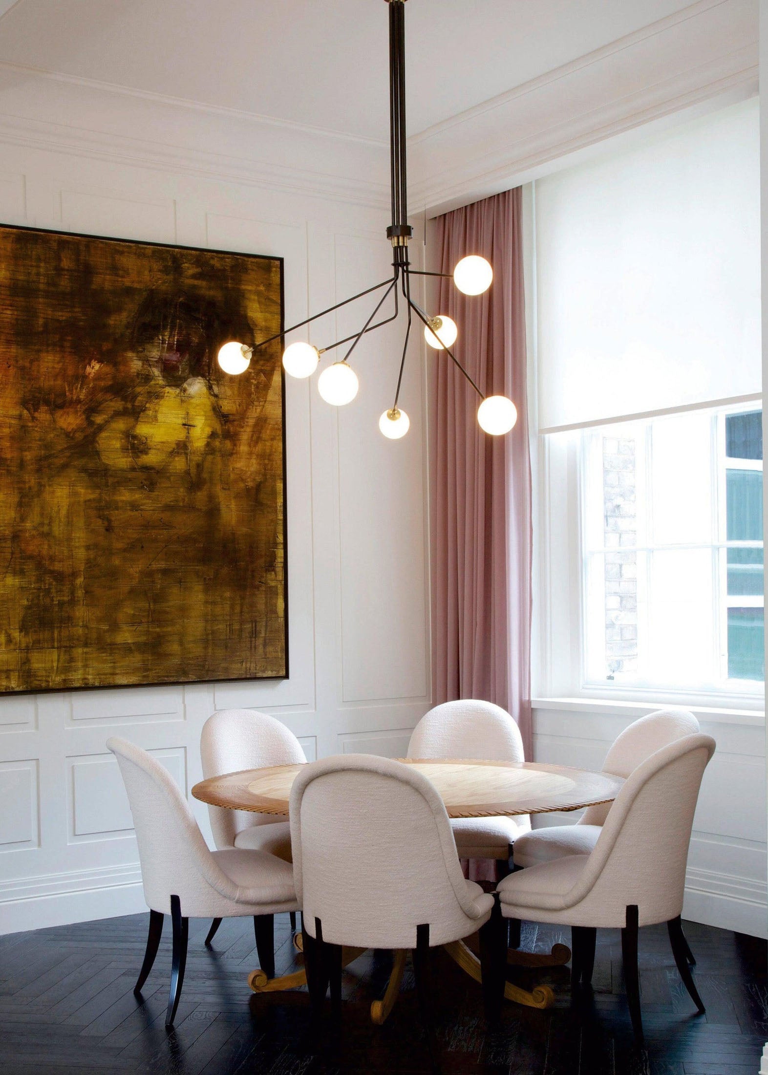- Handcrafted with precision, Hoskins Ceiling Lamp features three hand-blown opal glass globes, softly diffusing light in a warm, inviting glow. Suspended from slender, gracefully angled stems with a sleek metallic brass or black finish, the design strikes a perfect balance between organic fluidity and geometric sophistication.