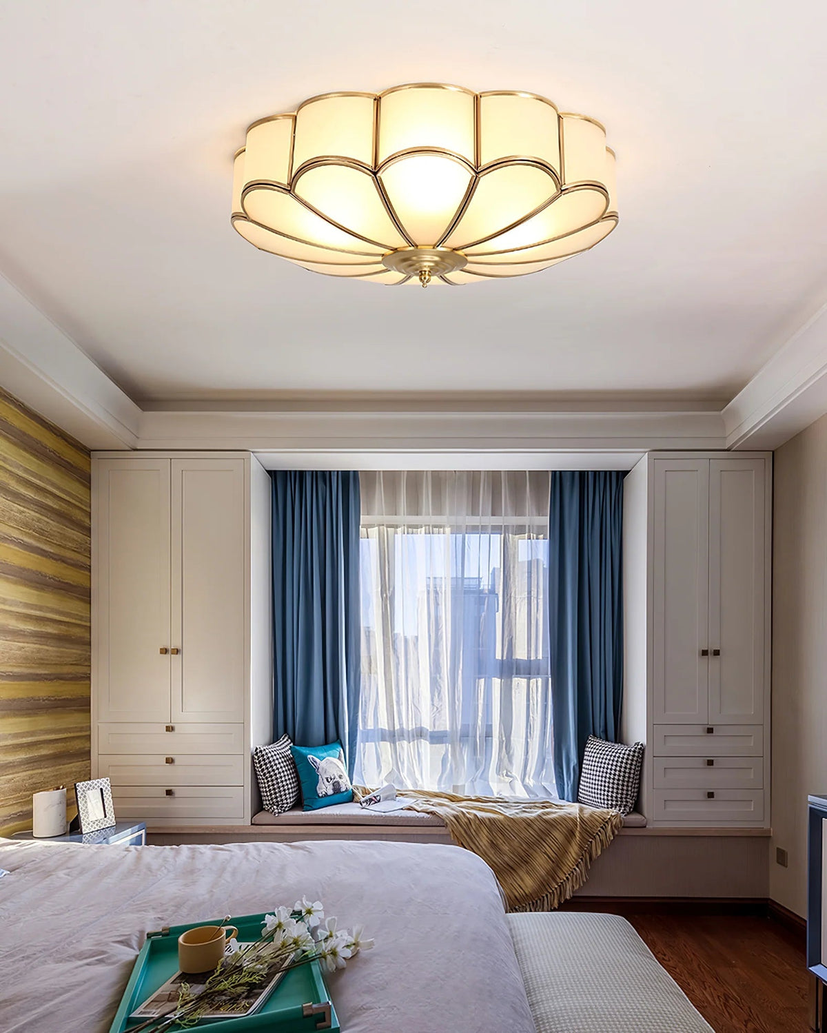 - Illuminate your home with the enchanting Jama Flower Flush Mount Lighting. This exquisite fixture features a delicate brass lace design that casts intricate patterns of light onto your surroundings. The frosted glass shade adds a touch of softness and warmth, creating a captivating ambiance. Inside, a cluster of bulbs provides ample illumination, casting a warm glow throughout your space. The classic and vintage-inspired design of the Jama Flower Flush Mount Lighting makes it a timeless addition to any room in your home.