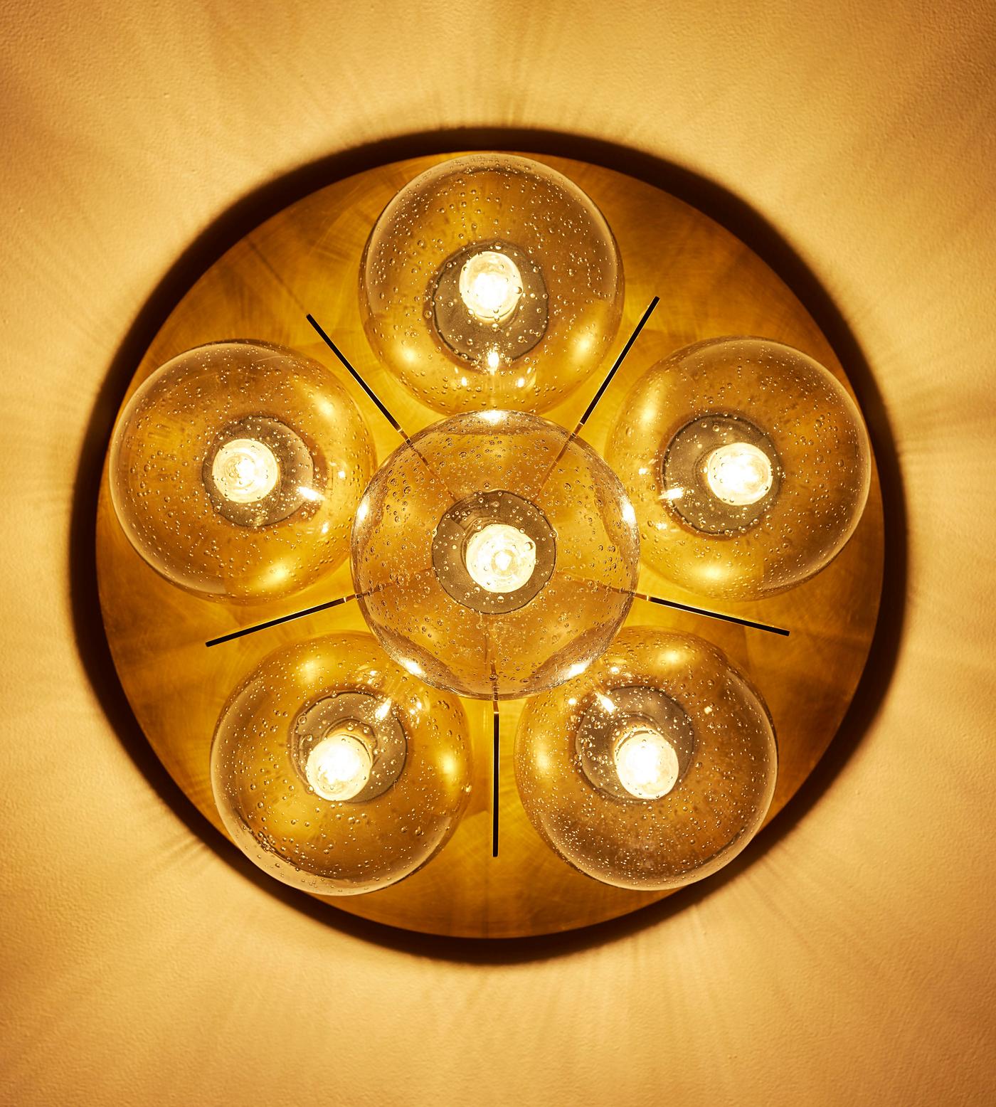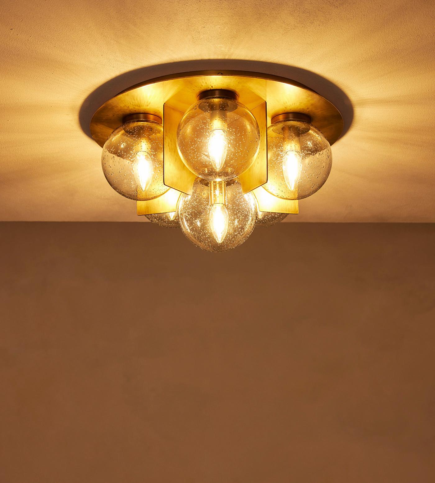- Inspired by the iconic glamour of the White City House, the Lois Flush Mount Lamp transforms your ceiling into a focal point of artful design. It features a captivating cluster of six individual bubble glass globes, each diffusing a soft, warm glow to create an inviting and ambient atmosphere. Elegantly intersecting these globes are panels of luxe, plated antique brass, adding a rich, metallic contrast that prevents the design from feeling overly rustic and instead leans into a refined, historical aesthetic.