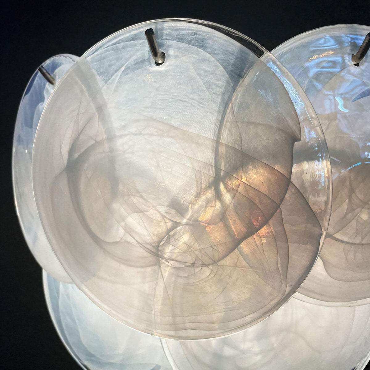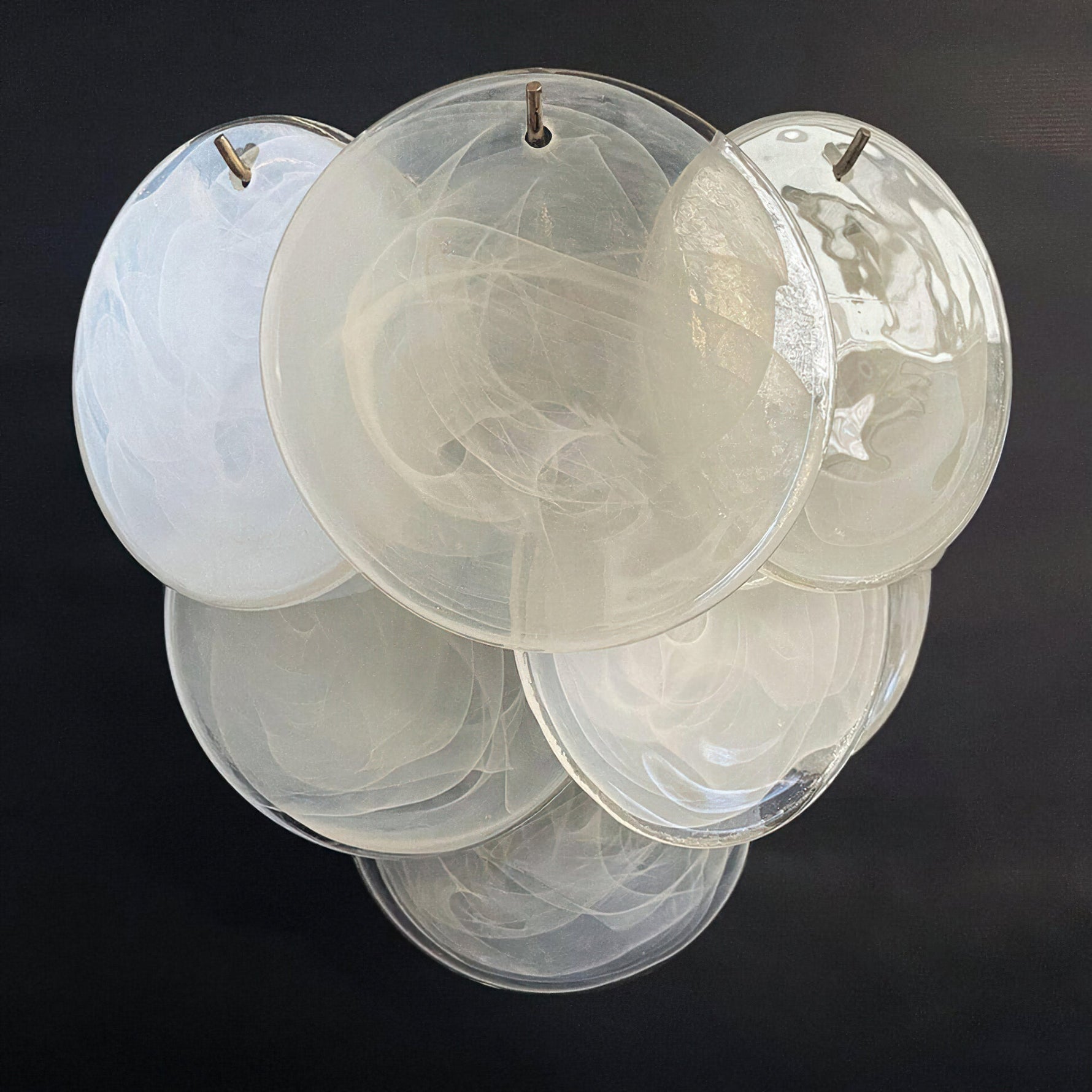 - Inspired by the iconic Vistosi style, Murano Disc Wall Sconce White is a stunning piece of Murano glass art. Featuring 10 white glass discs, each meticulously crafted by skilled artisans, this light fixture creates a mesmerizing spectrum of colors when illuminated. The unique composition of the Murano glass reflects light in a captivating way, transforming any space into a breathtaking work of art.