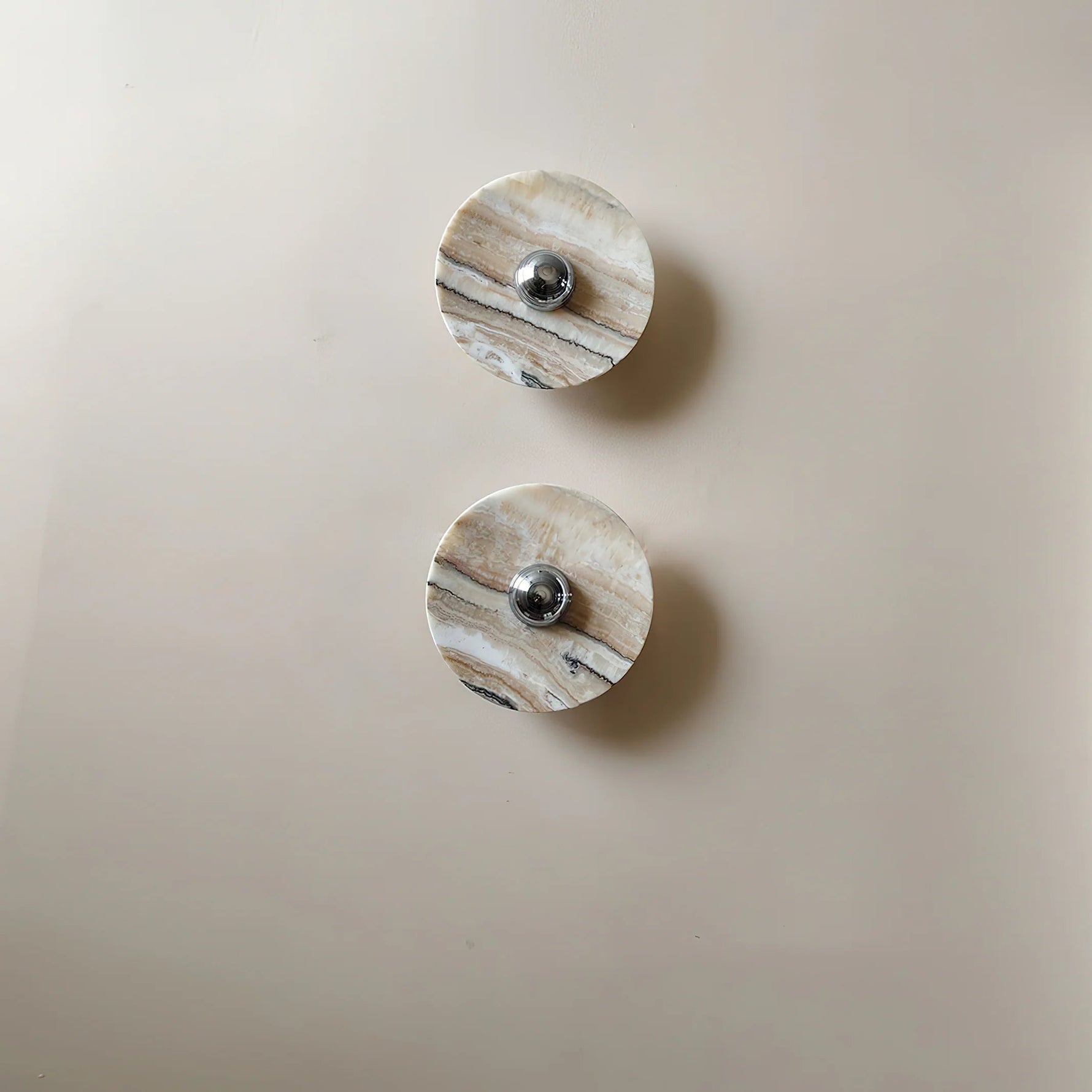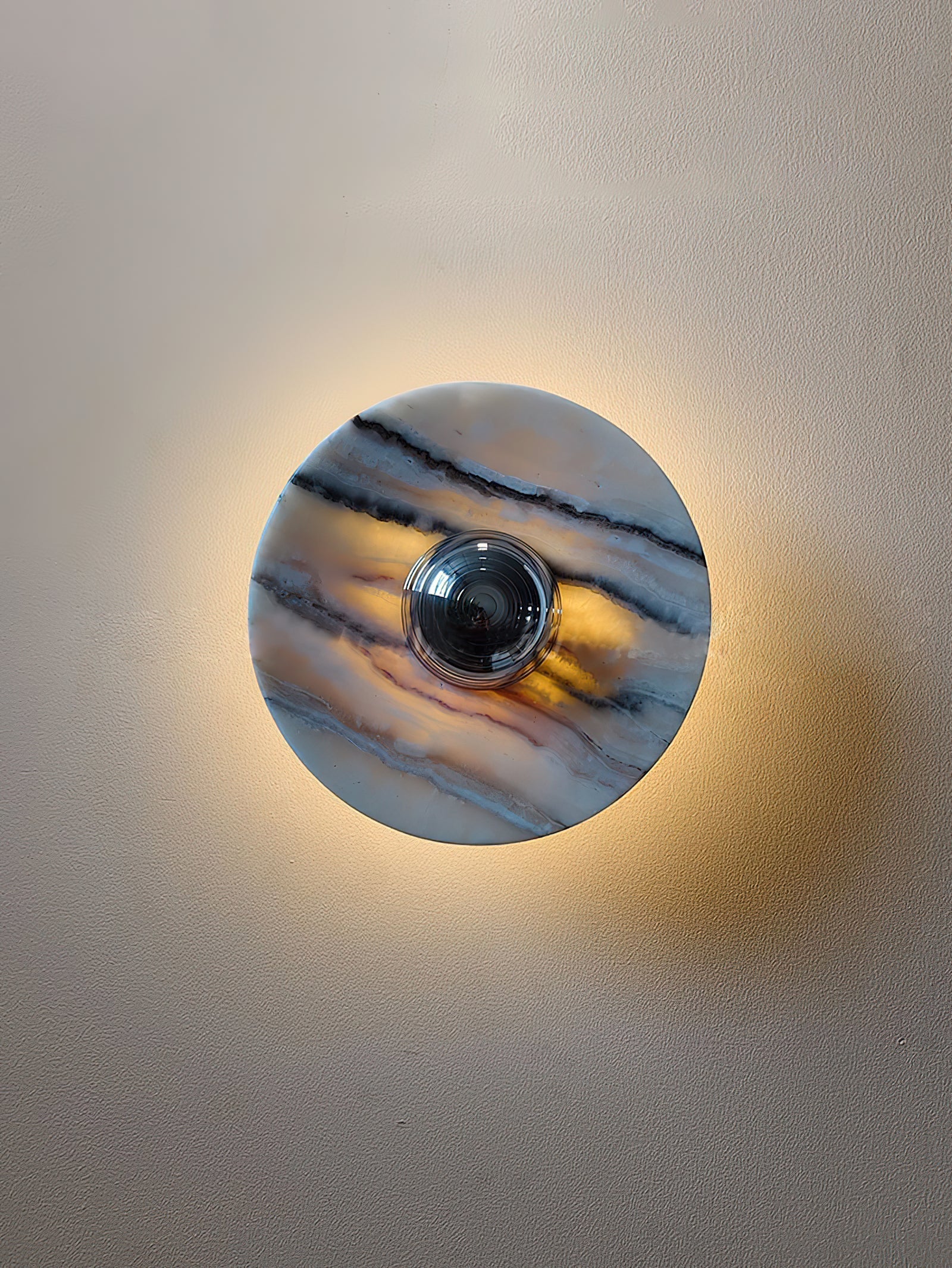 • Illuminate your space with the timeless beauty of our Banded Tan Agate Sconce. Crafted from natural agate, each piece showcases soft, diffuse veins that flow like ethereal clouds or gentle shadows, creating a mesmerizing play of light and texture. The warm tan hues and translucent quality of the stone allow light to filter through, casting a soothing, ambient glow that enhances any room.