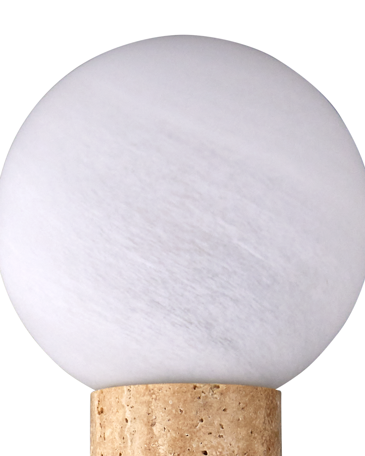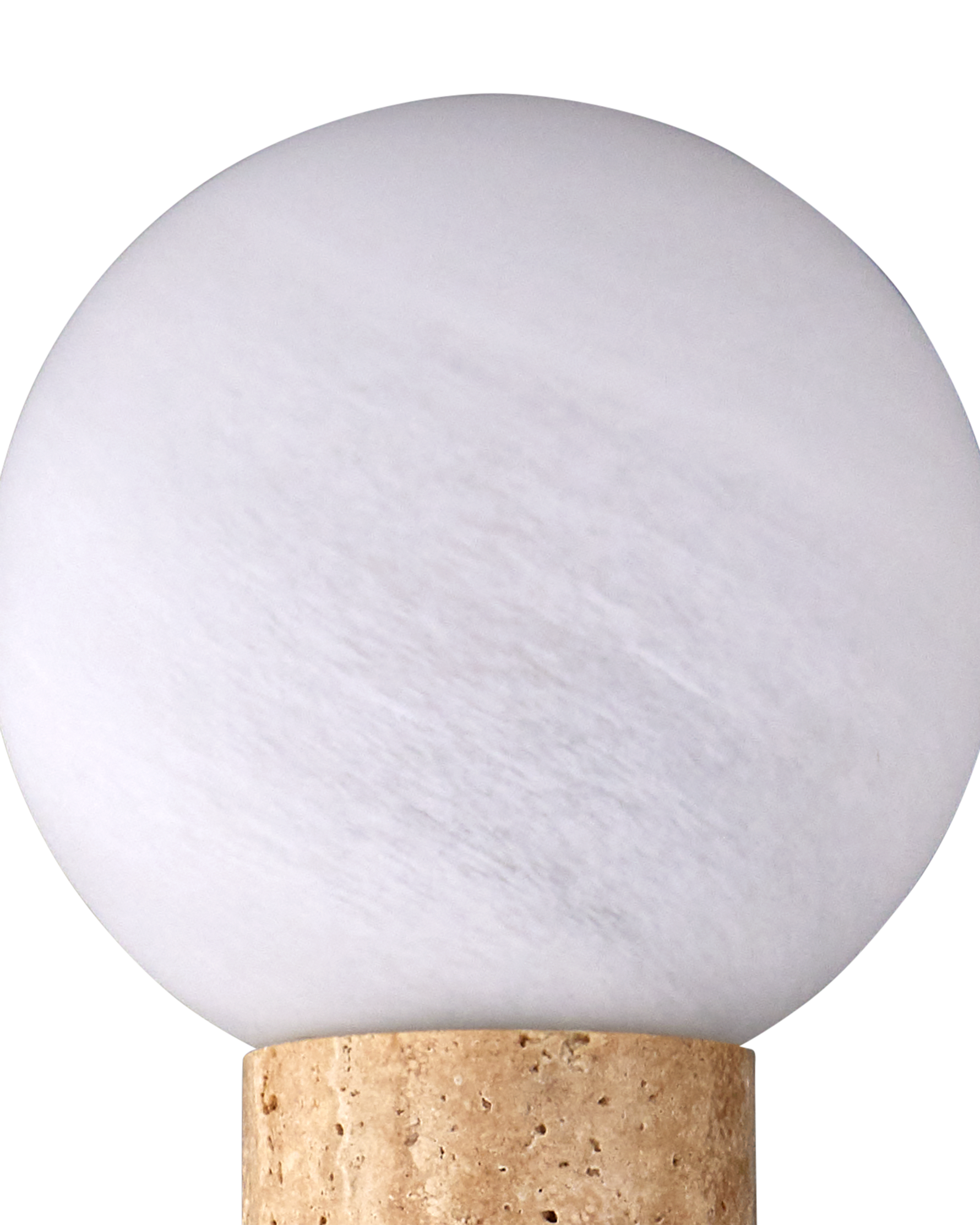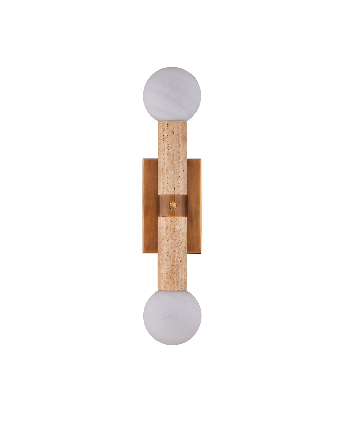 • The mottled, milky glass enhances the natural variations in the travertine, while the antique brass finish on the metal accents lends a touch of vintage warmth. Each piece is unique, with the travertine’s natural variations ensuring no two sconces are exactly alike.