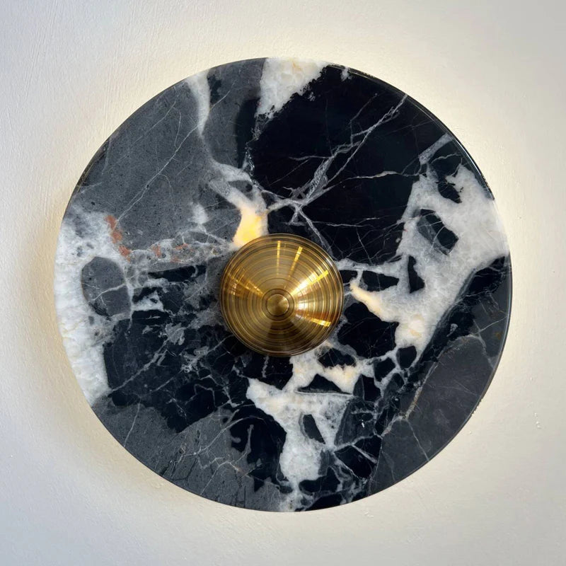 - Introducing the Breccia Marble - Black Sconce, a striking lighting fixture that showcases the raw, fragmented beauty of natural breccia marble. Each piece is a unique work of art, characterized by its captivating "jigsaw puzzle" effect, where angular fragments are elegantly encased within a dark matrix. This dramatic contrast creates a bold, textured appearance that adds depth and intrigue to any space.