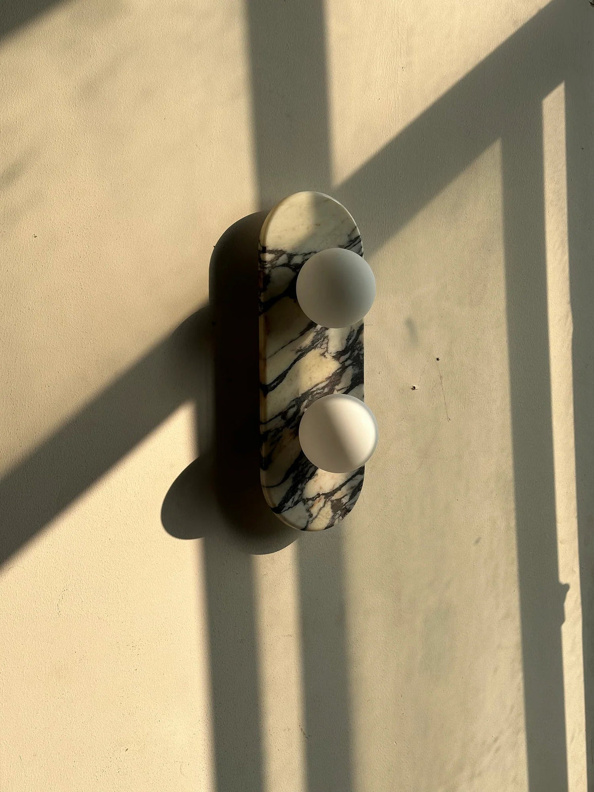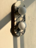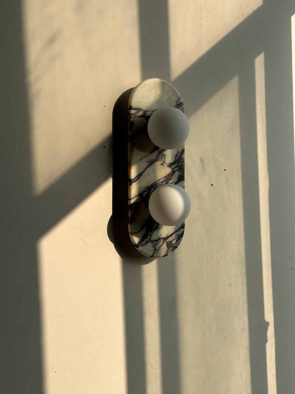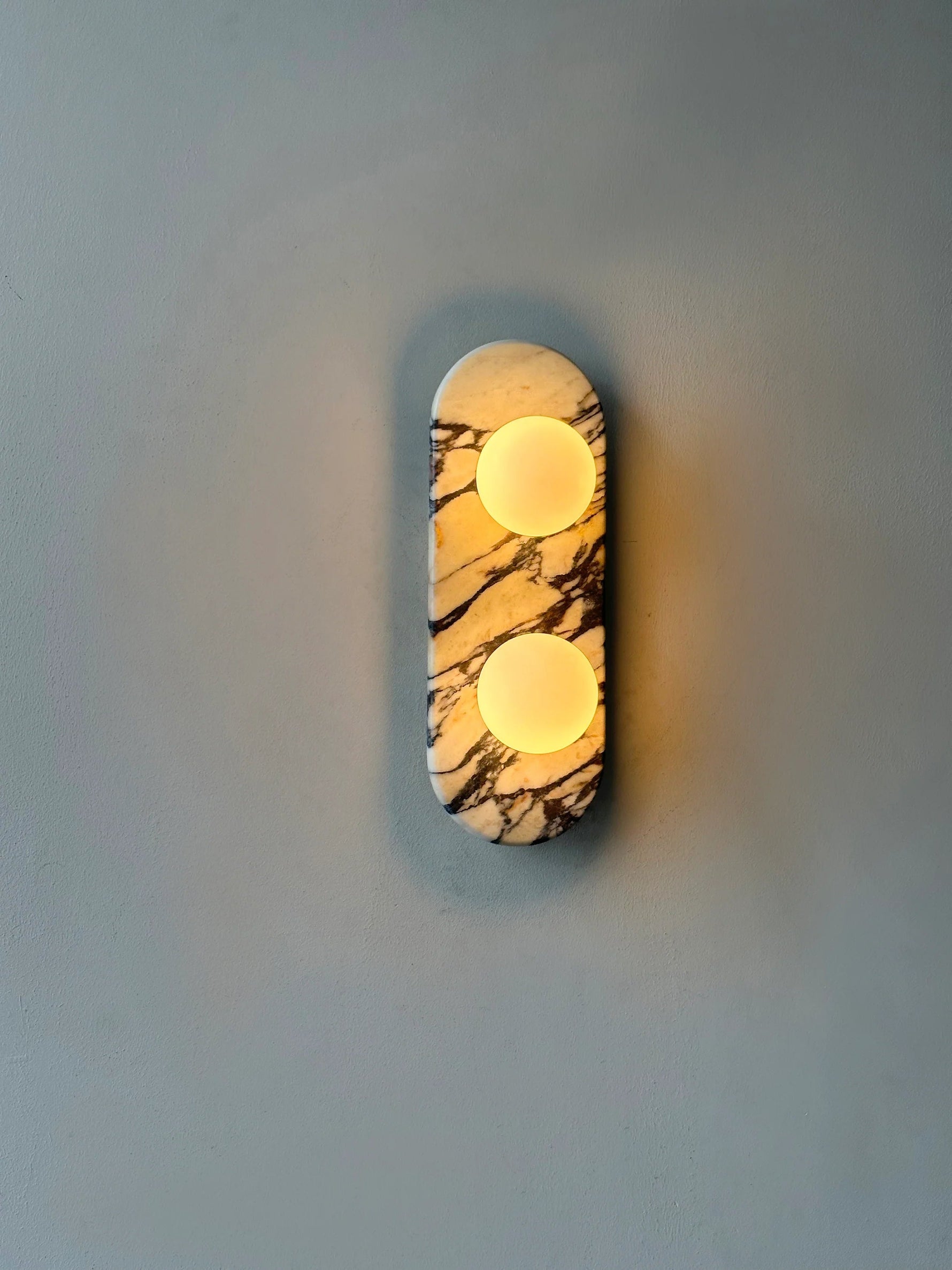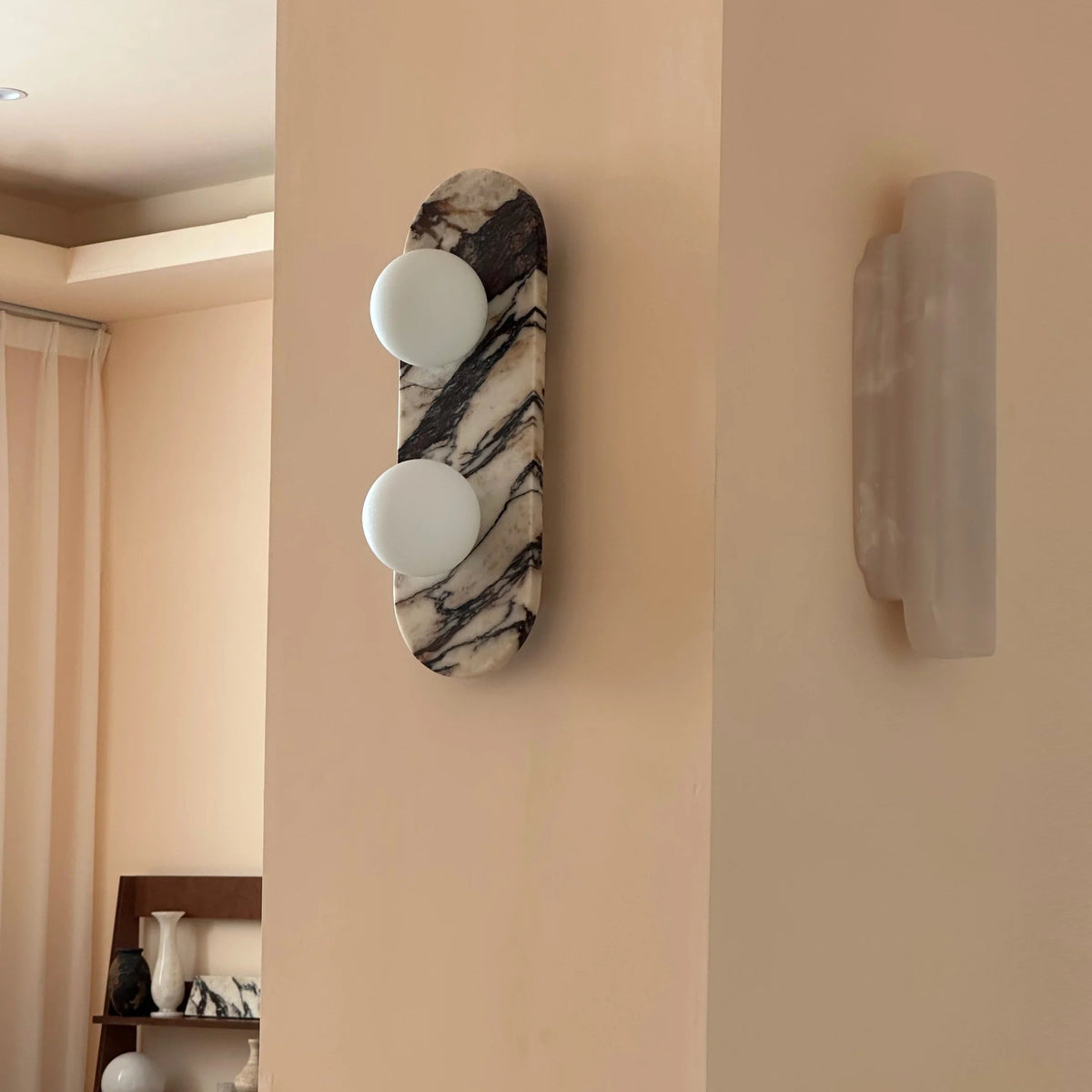 • The design features two soft-diffusing opaline glass shades, seamlessly set into the marble for a harmonious balance of warmth and sophistication. Perfect for ambient lighting in entryways, hallways, or living spaces, this sconce adds a touch of high-end Italian craftsmanship to any interior.