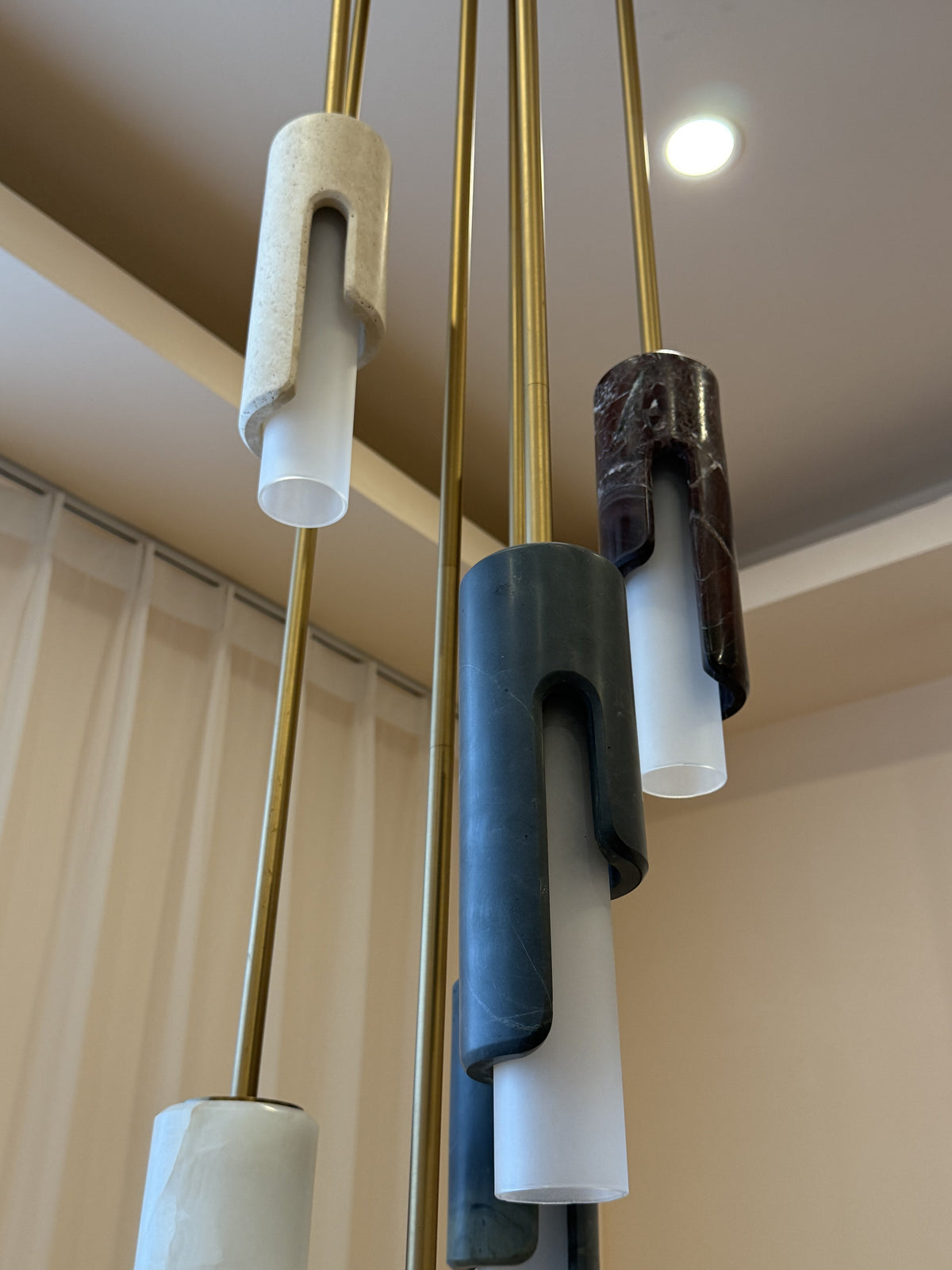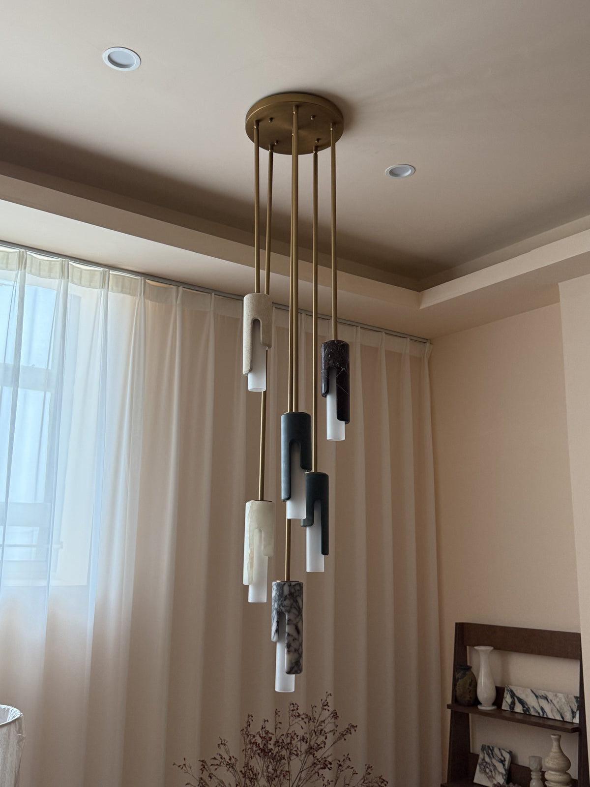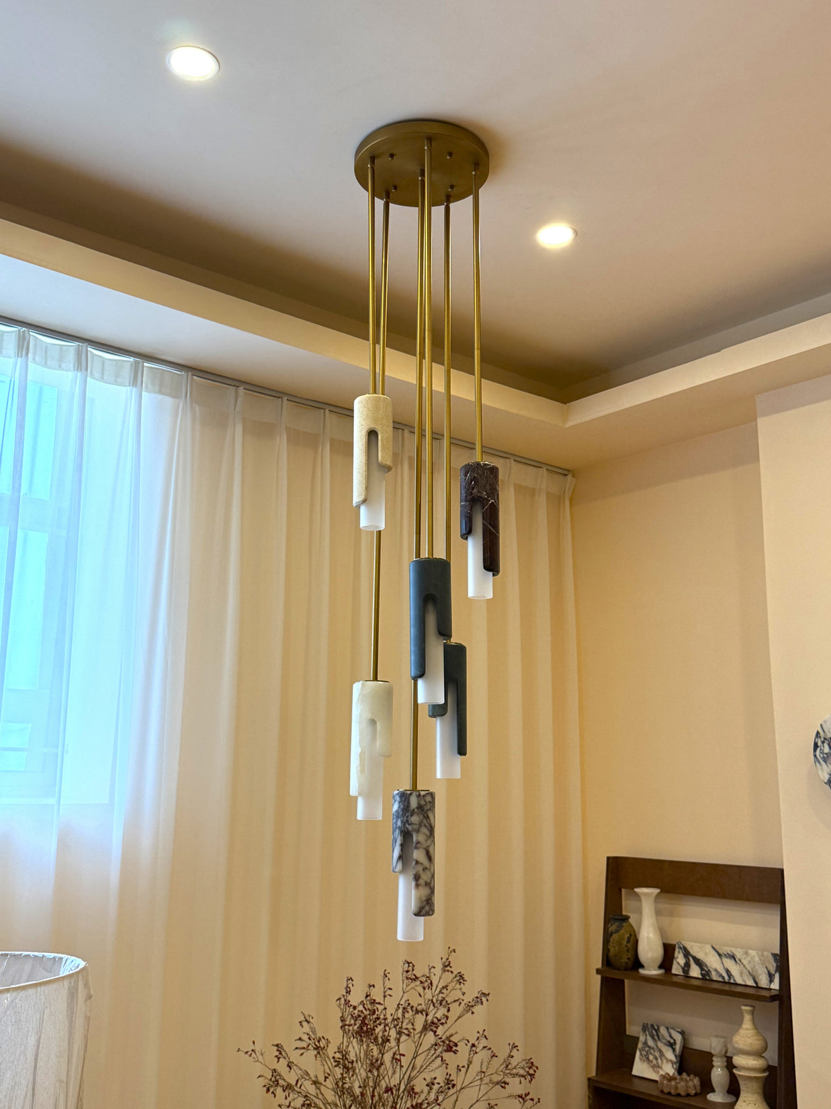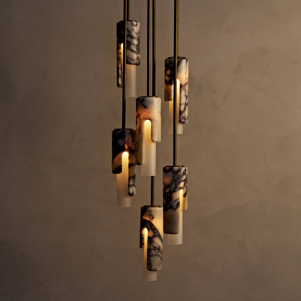 - We have combined six Dover pendant lights to create this stunning and magnificent chandelier. The six diffusers consist of one Travertine, one Rosso Levanto Marble, two Verde Guatemala Marble, one Alabaster, and one Calacatta Viola Marble. You can also customize the number of diffusers in different materials—please contact us for a quote.