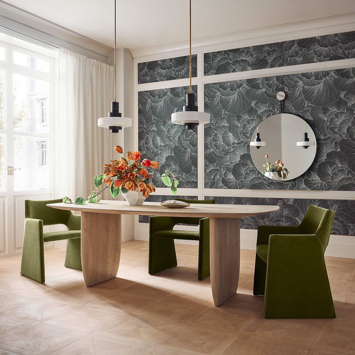 - Crafted from a single piece of natural marble, each pendant is entirely unique. The rich, deep green stone is veined with organic patterns, a signature of its ancient origin, ensuring no two fixtures are exactly alike. This luxurious material is paired with a matte opaline glass shade, chosen for its exceptional ability to soften and distribute light evenly, eliminating glare and creating a serene ambiance. The brass components are left unlacquered, a mark of thoughtful design that allows the material to age gracefully, developing a rich, living patina over time that tells the story of your home.