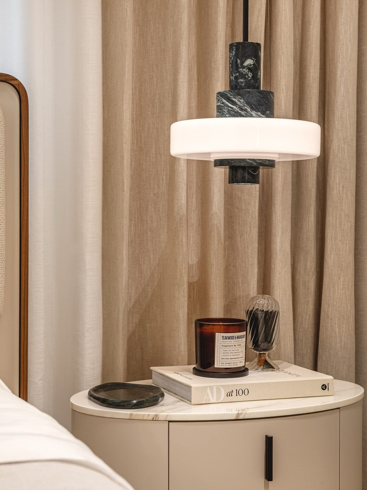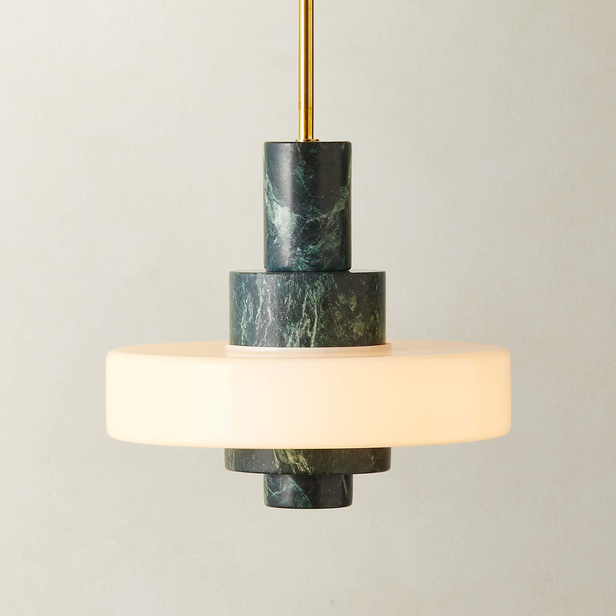 - Frederick Pendant Light design is a study in juxtaposed primary forms. A substantial, solid block of green marble is meticulously carved and polished, its cool, geological weight appearing to float effortlessly in space. Suspended beneath it, a graceful opaline glass sphere glows with a soft, diffused light. Between these two distinct volumes, subtle and restrained detailing in unlacquered brass provides a warm, human touch, connecting the elements with a quiet precision. This is a fixture that commands attention through its confident simplicity and masterful use of materiality.