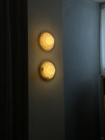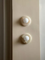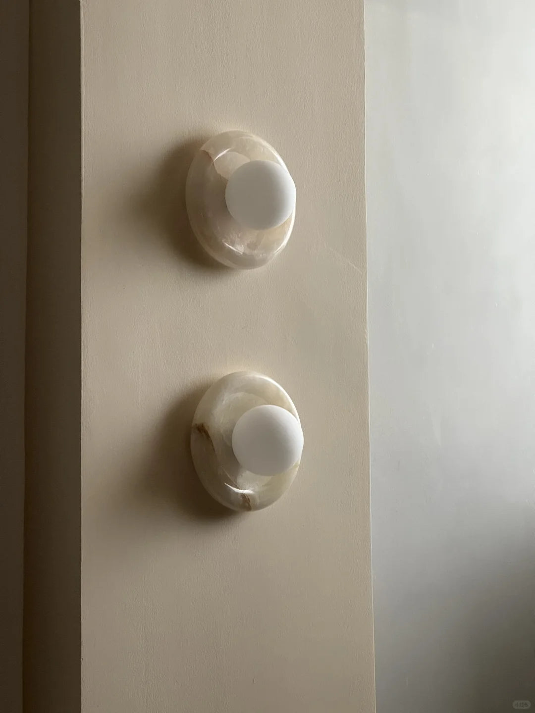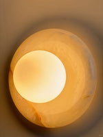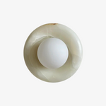 - Gravure Onyx Sconce combines modern design with classic sophistication, featuring a perfectly round form that exudes harmony and balance. At its heart, a central glass globe emits a soft, diffused glow, creating a warm and inviting ambiance. The sconce is beautifully framed by a curved natural stone backplate, showcasing the natural veining and luxurious texture of natural stone for a touch of refined artistry.