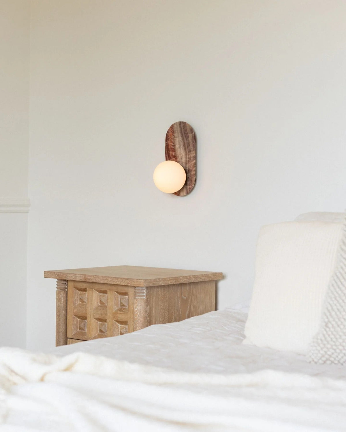 - A true gift from nature, the Onyx Arch Wall Sconce showcases the breathtaking beauty of natural agate, with each piece featuring delicate, one-of-a-kind patterns formed over millennia. No two sconces are alike—every slab of agate boasts its own mesmerizing veins and translucent hues, creating a stunning interplay of light and organic artistry.