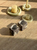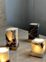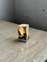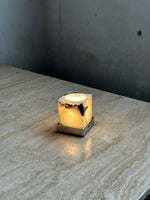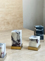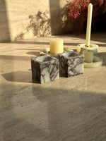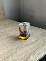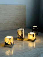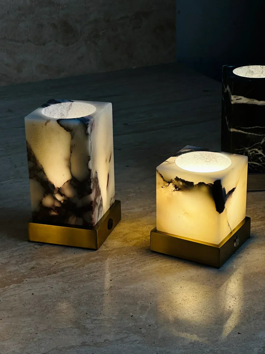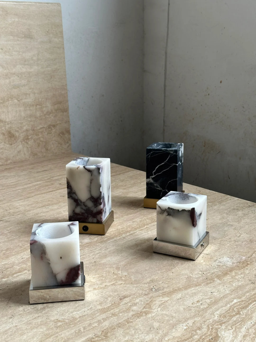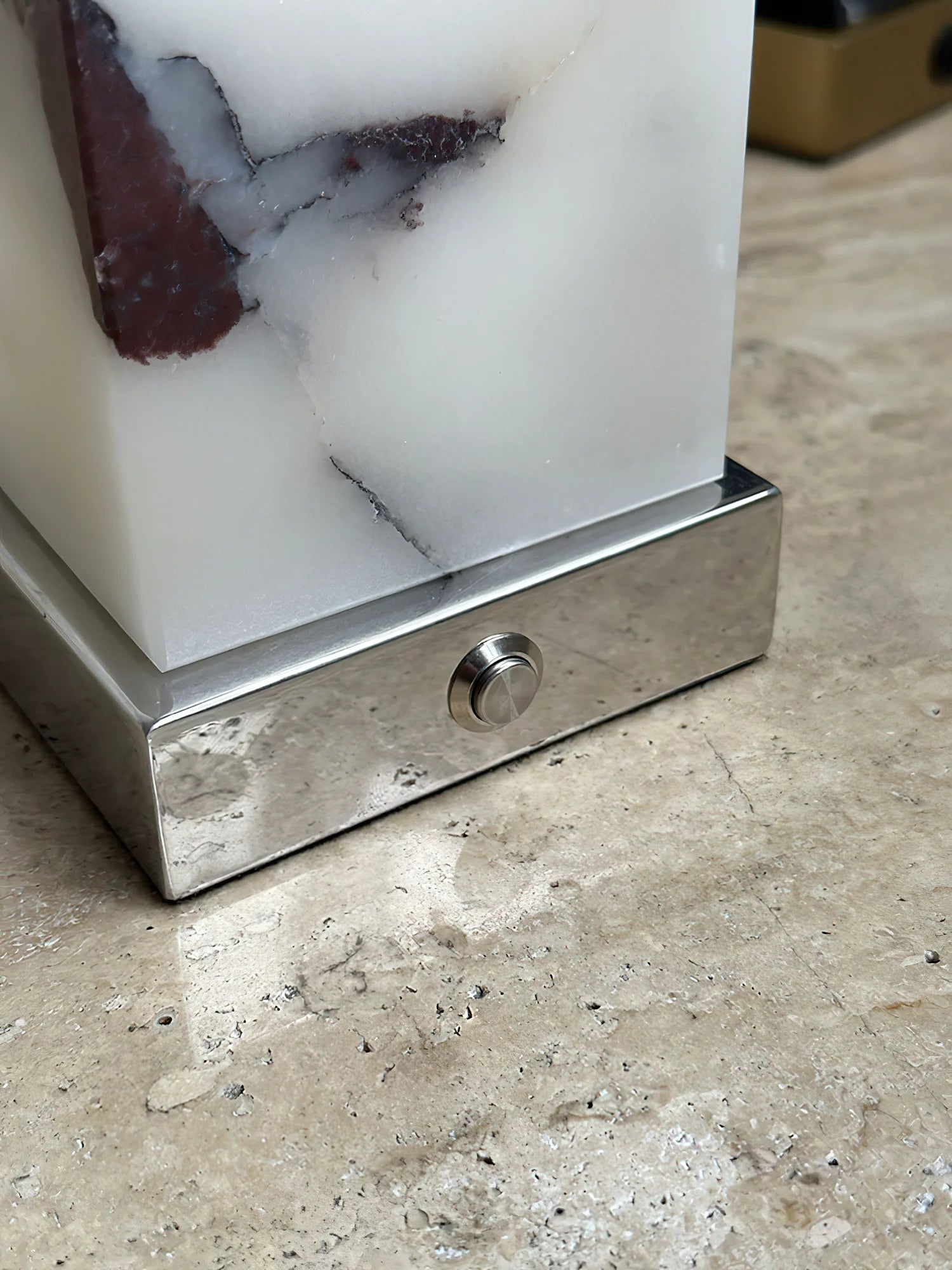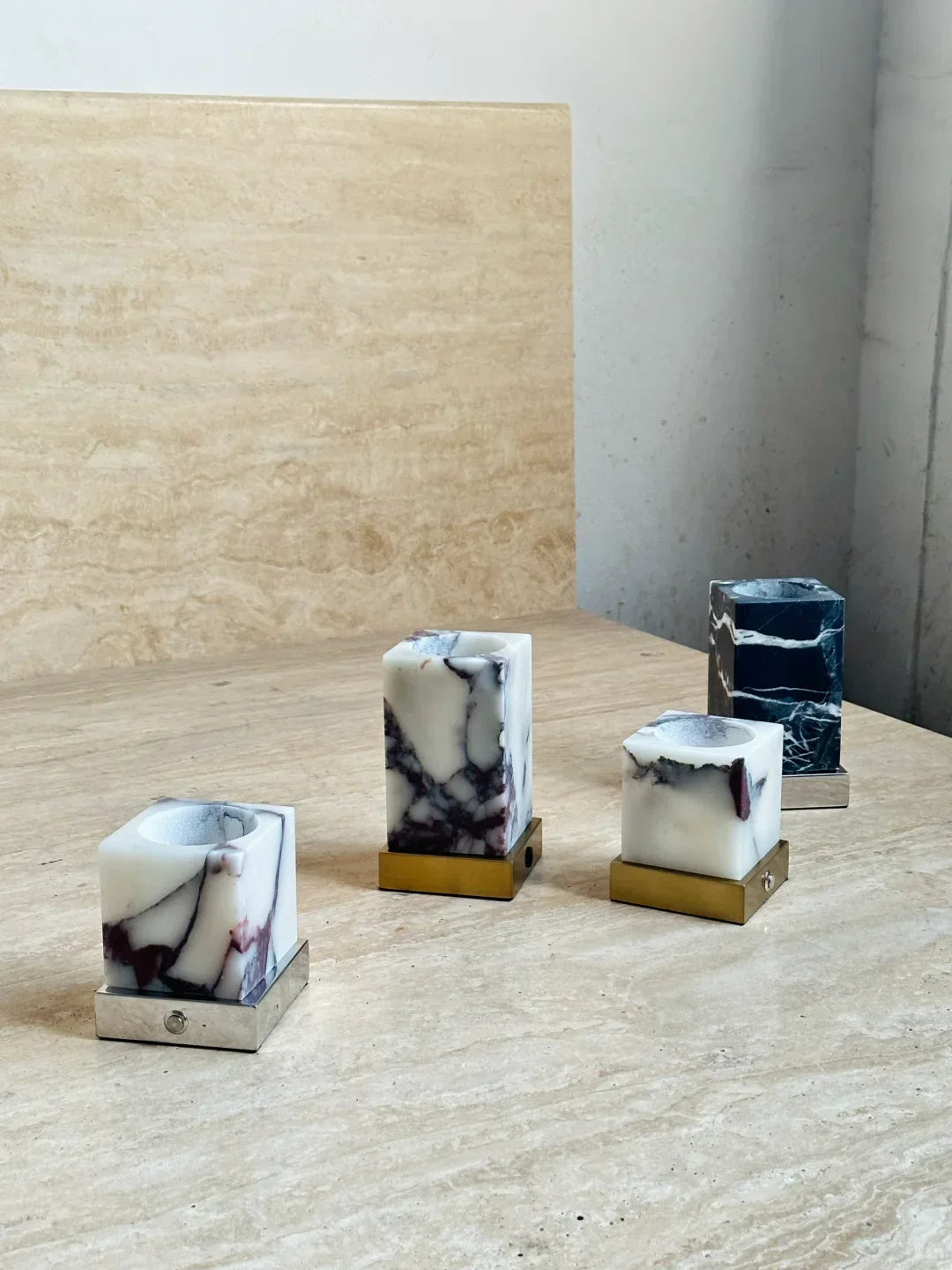 - Crafted with precision, Geometry Table Lamp features a calacatta viola marble base that is meticulously cut and polished into a sleek square shape. The interior is drilled into a smooth cylindrical cavity to perfectly house the light source. The sturdy bottom load-bearing component is made of brass, also available in chrome finish for a modern touch. Marble also available in nero maquine.