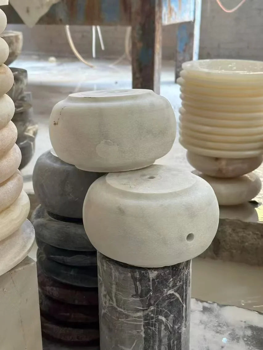 • The soft, glowing light radiates warmth, while the natural veining of each unique marble piece adds organic sophistication. Minimalist yet striking, this lamp transforms any space into a gallery of refined ambiance—where contemporary design meets timeless artistry.
