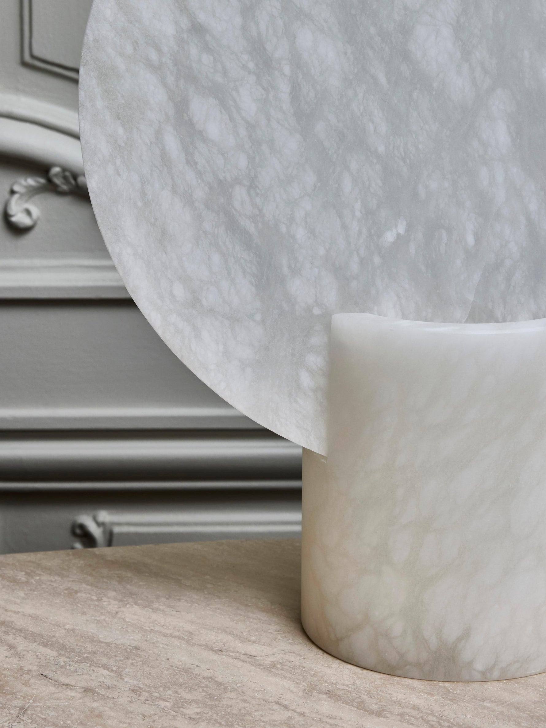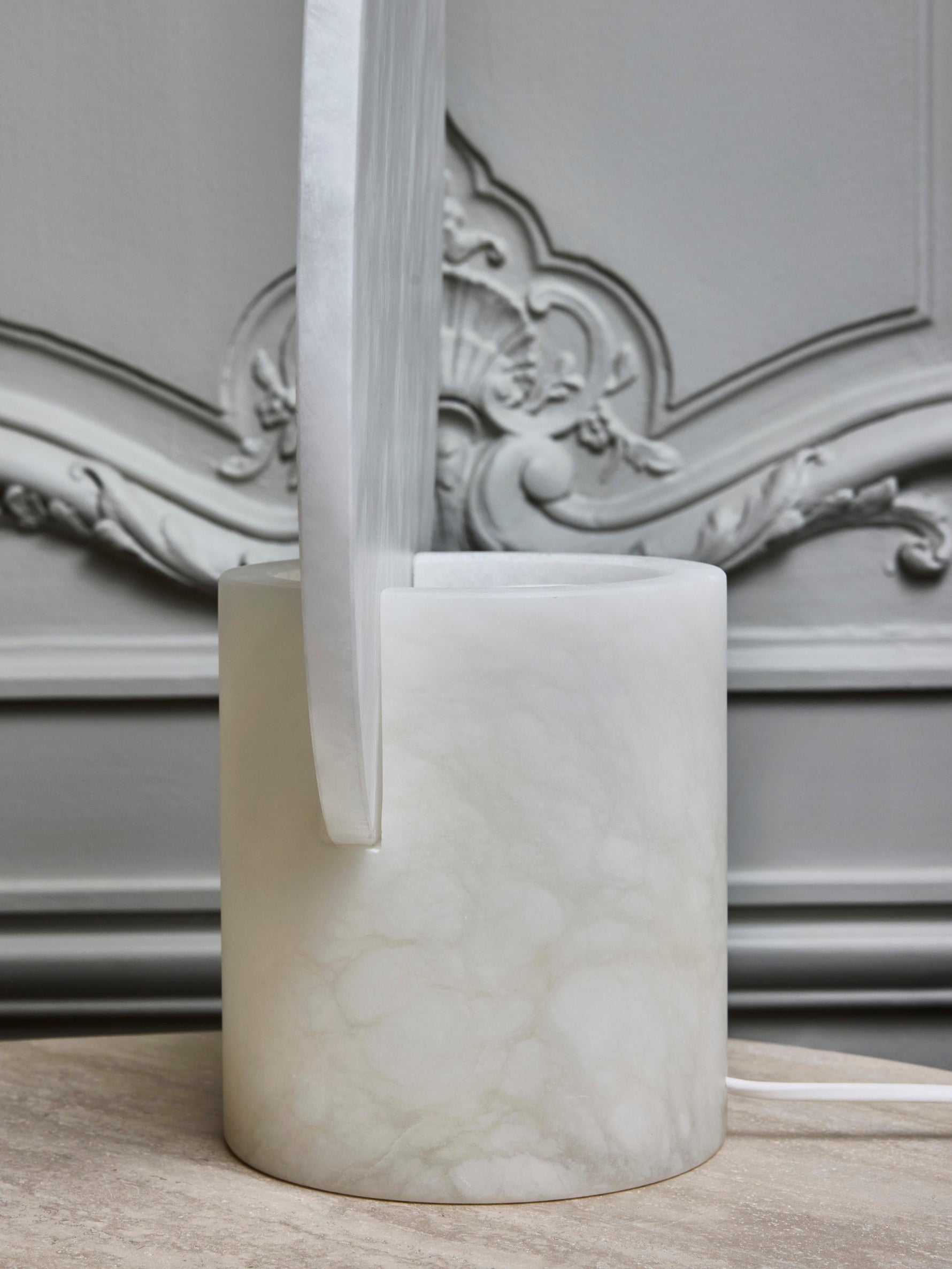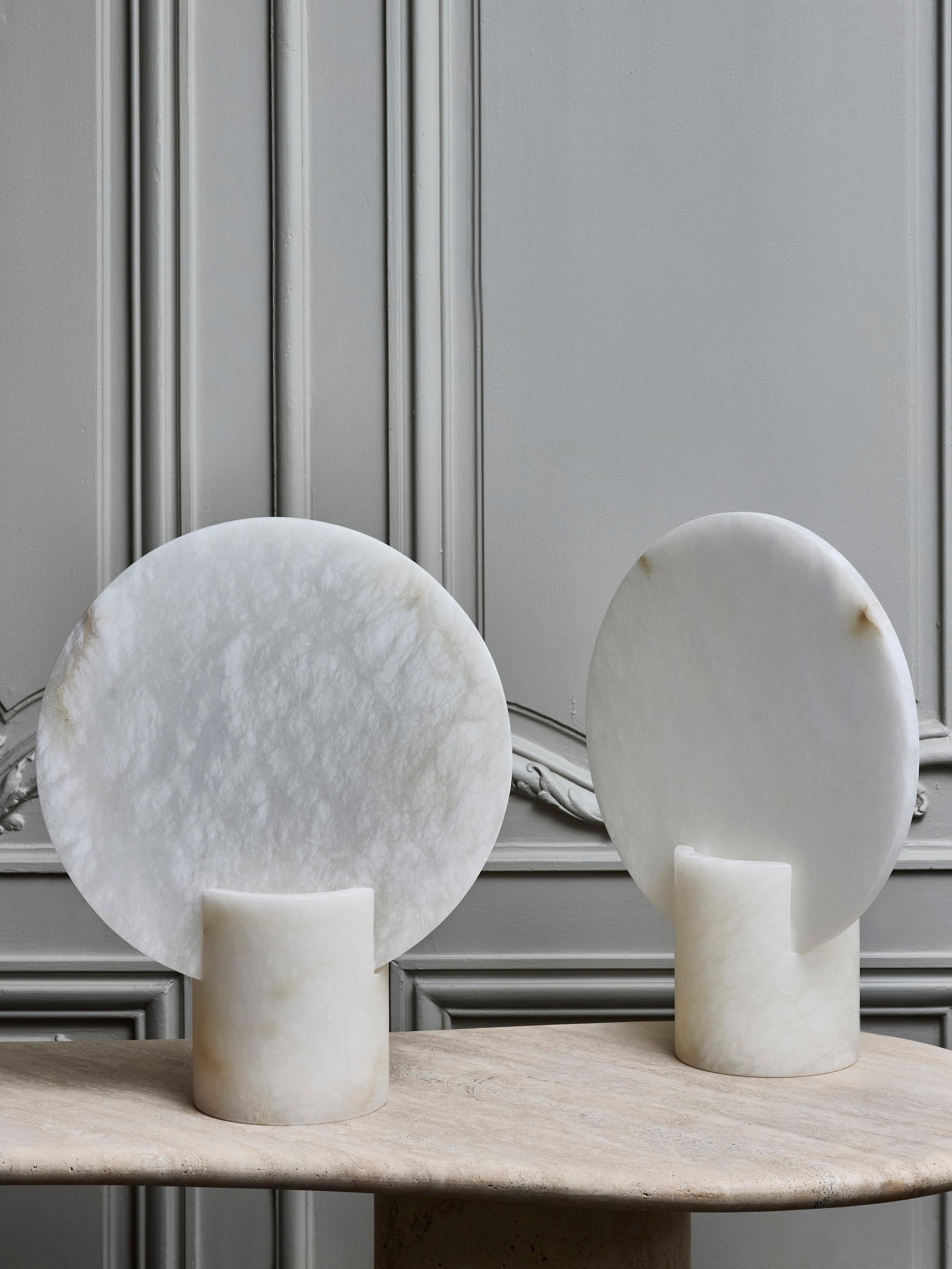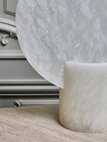 • Embrace minimalist elegance with our Alabaster Screen Table Lamp. Each lamp features a unique cylindrical base with clean, vertical slots, crowned by a large, standing round diffuser. This sculptural design casts beautiful, ambient light, creating a serene and sophisticated atmosphere in any room. Perfect for flanking a bed, sofa, or console table.