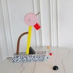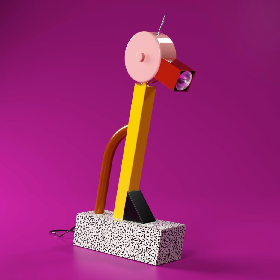 - The lamp's base, adorned with Sottsass's signature Bacterio pattern in black and white laminate, provides a striking contrast to the vibrant yellow stem and black foot. The real star of the show, however, is the round, rotating pink head. This playful element allows you to direct the light from the red beak precisely where you need it most.