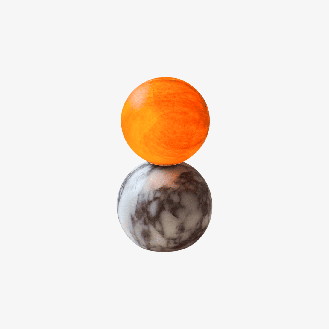 • The cool, sophisticated marble base contrasts beautifully with the vibrant orange upper sphere, creating a dynamic interplay of warm and cool tones. This striking combination ensures the lamp stands out in any setting, whether in a minimalist modern space or a lavish retro-inspired interior.