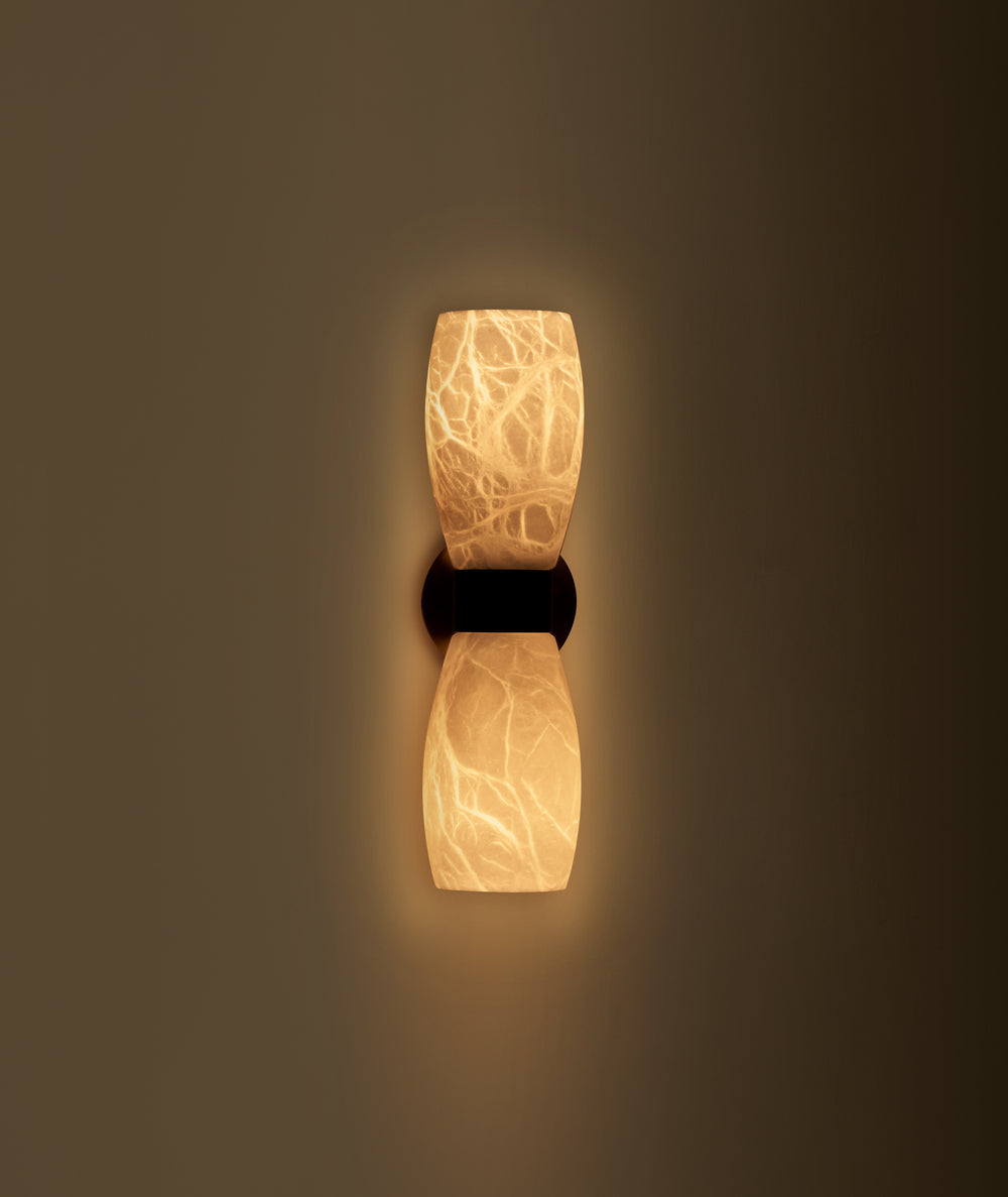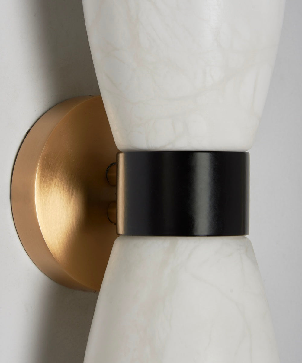 - Crafted for those who appreciate the beauty of contrasting elements, this sconce harmoniously blends the warm, radiant tones of a French gold frame with the bold, modern sophistication of matte black accents. At its heart lies the star of the show: a beautifully crafted alabaster shade. Each vein and subtle variation in the stone ensures your sconce is uniquely yours.