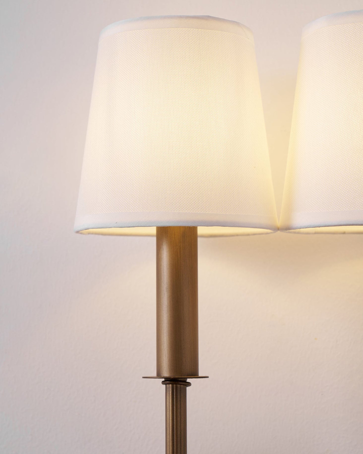 - Each arm is topped with a soft flax tall linen chandelier shade, diffusing a warm, inviting glow—perfect for living rooms, bedrooms, or entryways. The handmade IRON construction ensures durability while the antique brass finish adds a vintage-inspired sophistication.