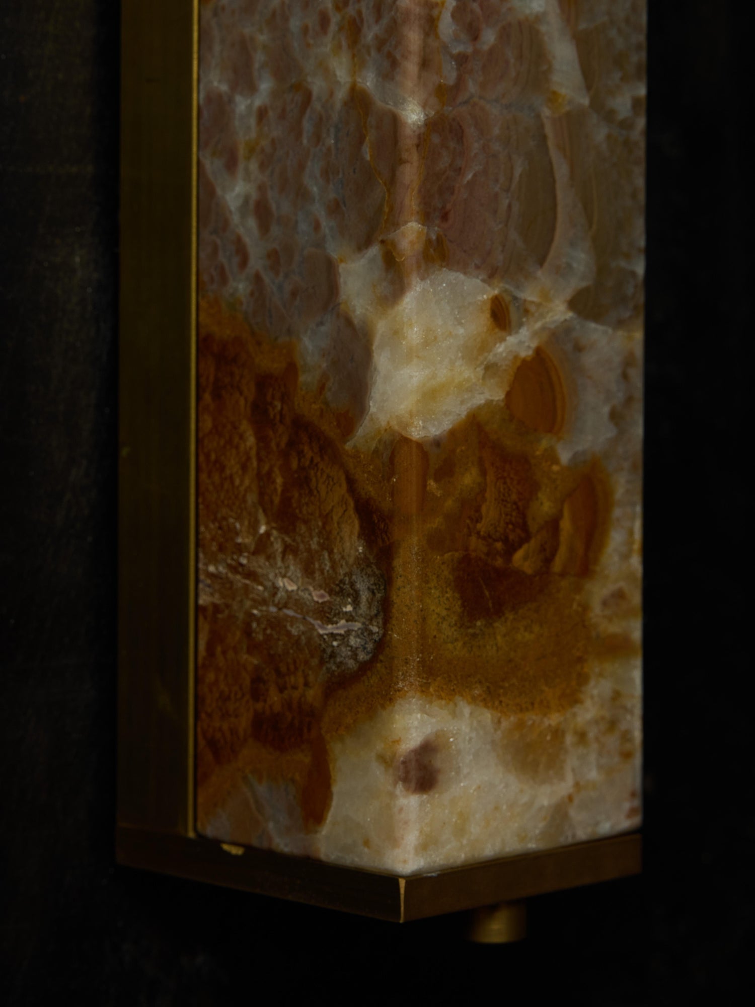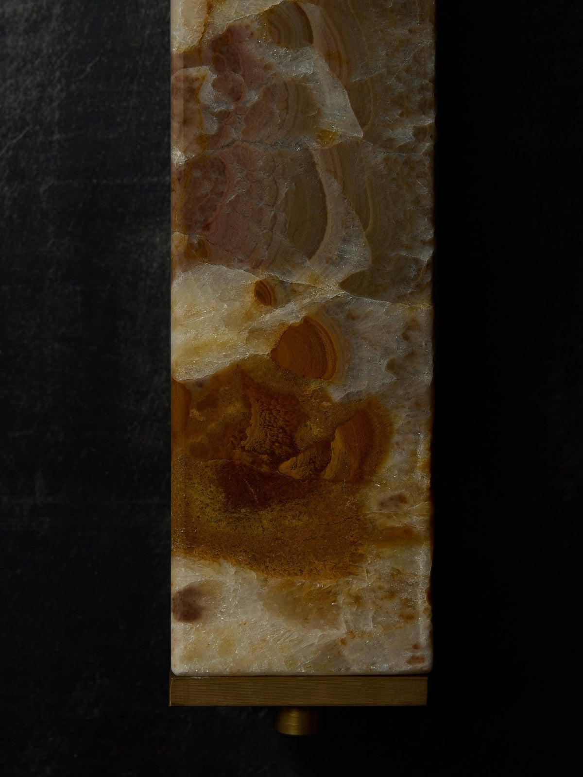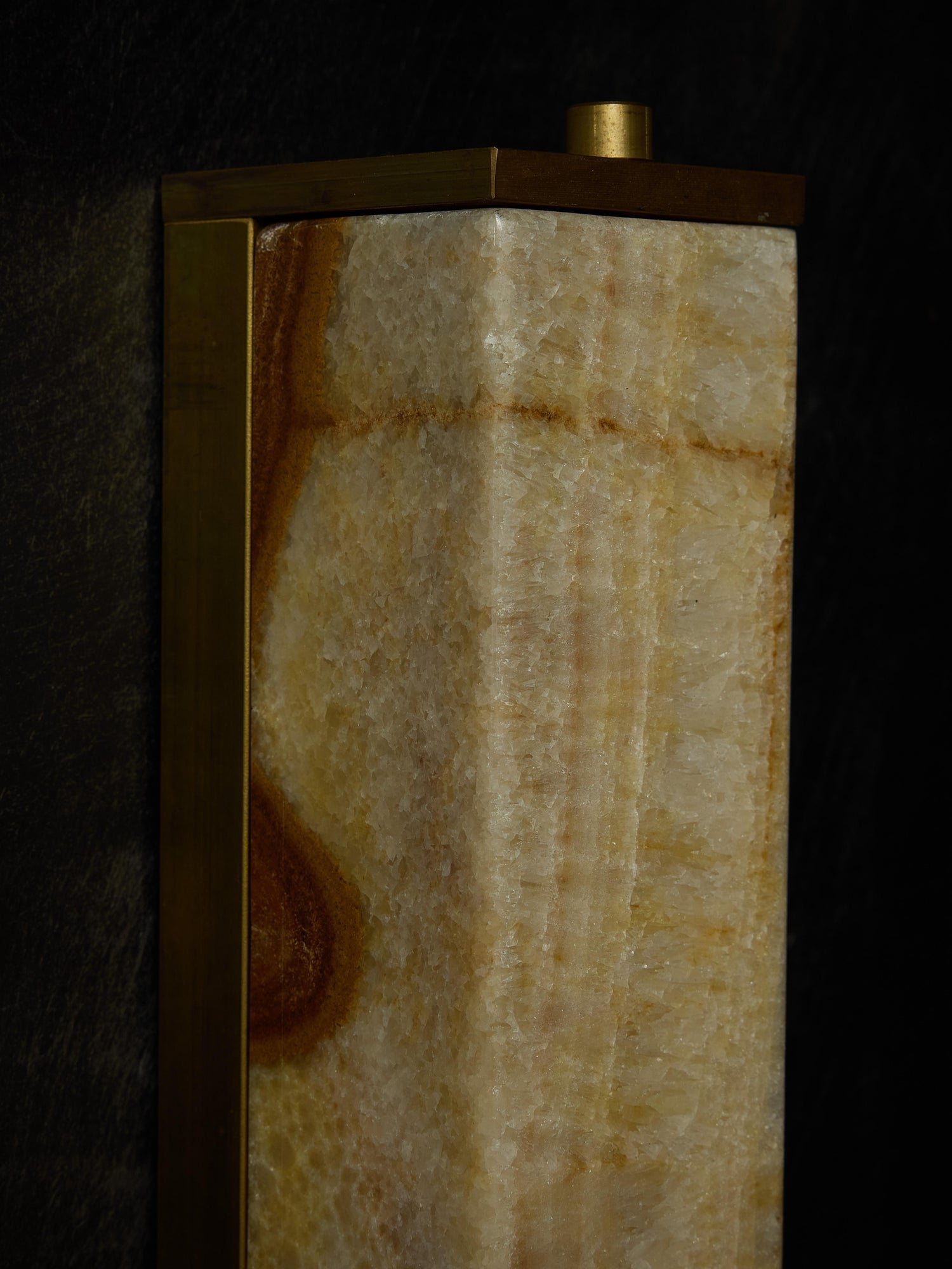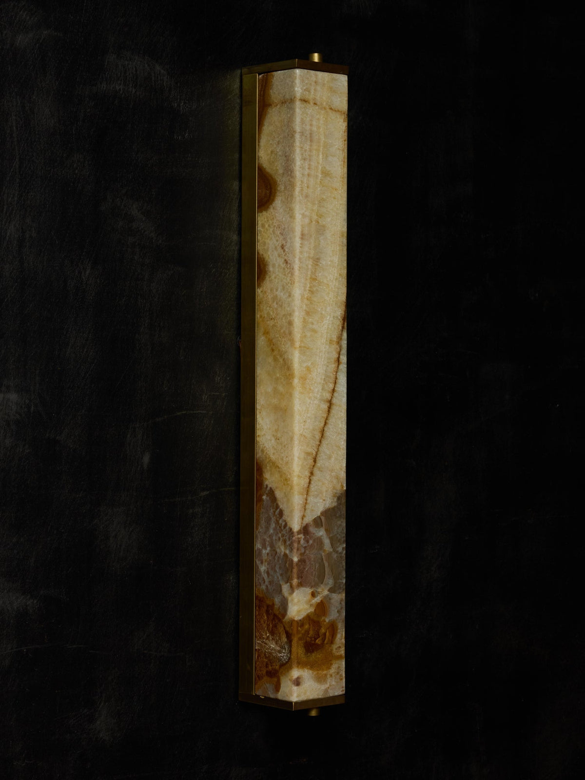 • Elegance meets artistry with a polished brass backplate and end caps, framing the onyx beautifully and adding a touch of modern luxury. The true magic of these sconces lies in their individuality; no two are exactly alike.