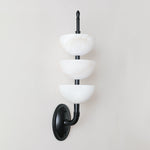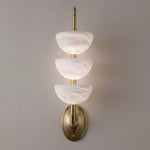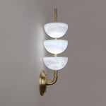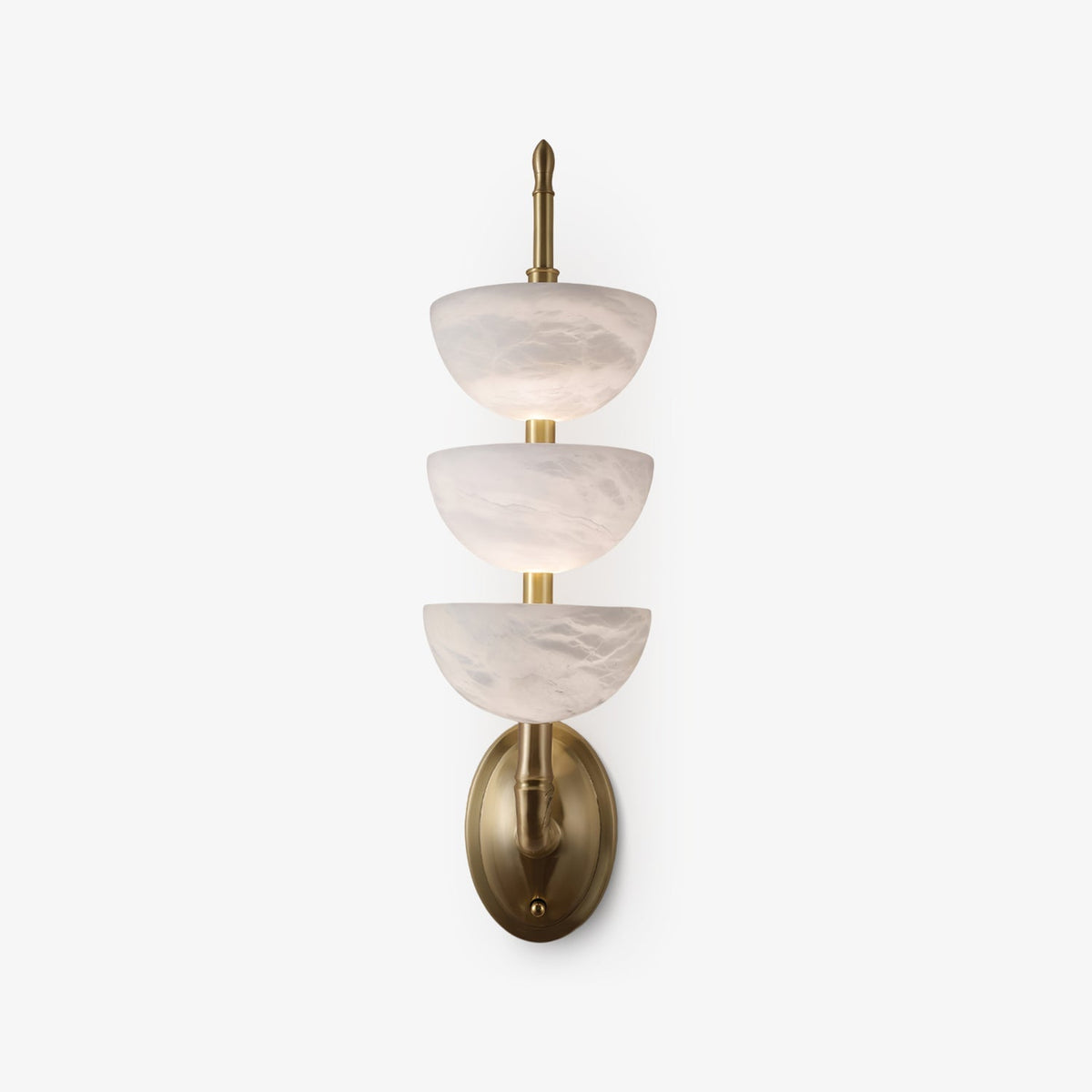 • Experience the ethereal beauty of the Holy Sword Alabaster Wall Lamp. This captivating fixture is crafted from three bowl-shaped alabaster, stacked delicately upon one another. The translucent nature of the alabaster allows light to pass through, creating a mesmerizing cascade of light and shadow. A portion of the light is reflected upwards by the alabaster, casting an enchanting pattern onto the wall.