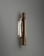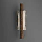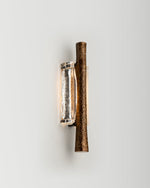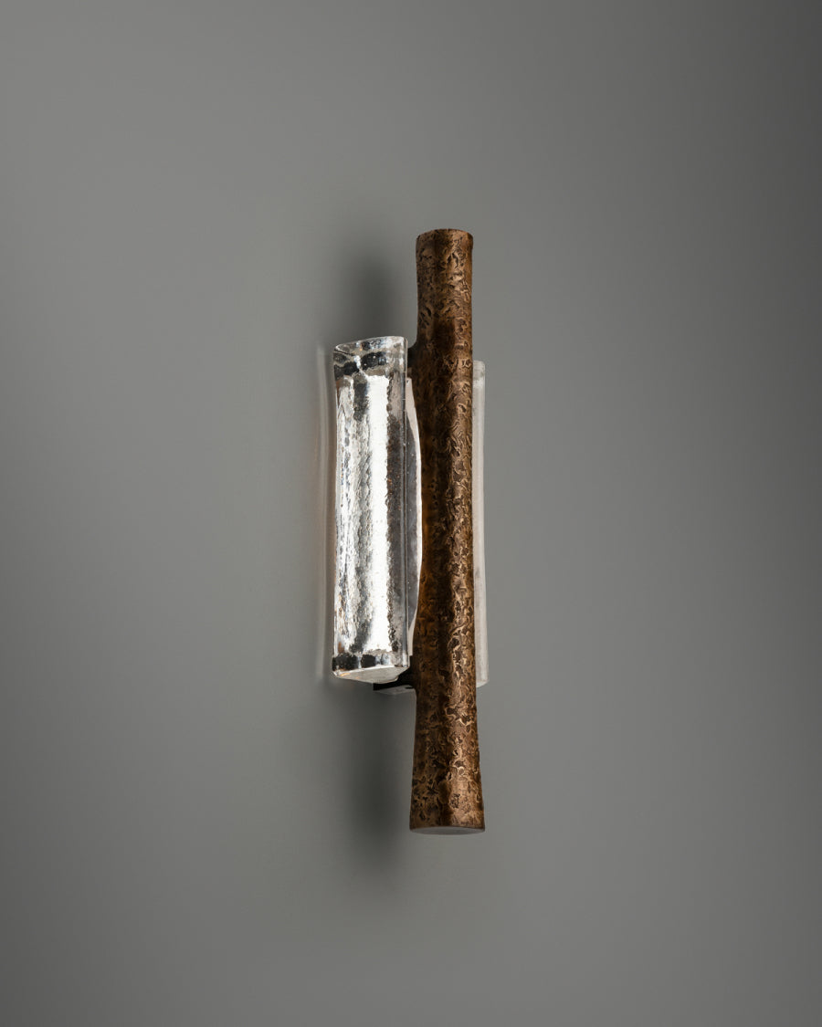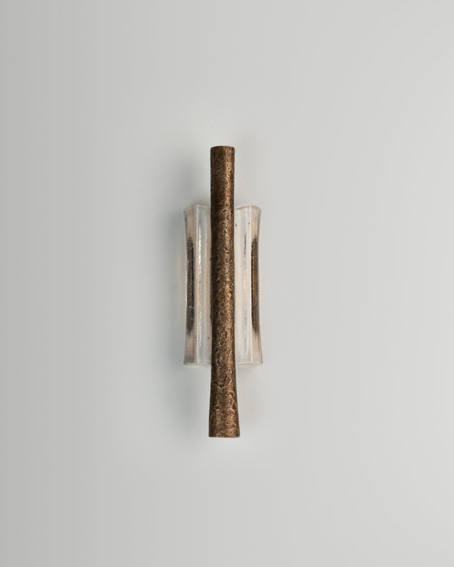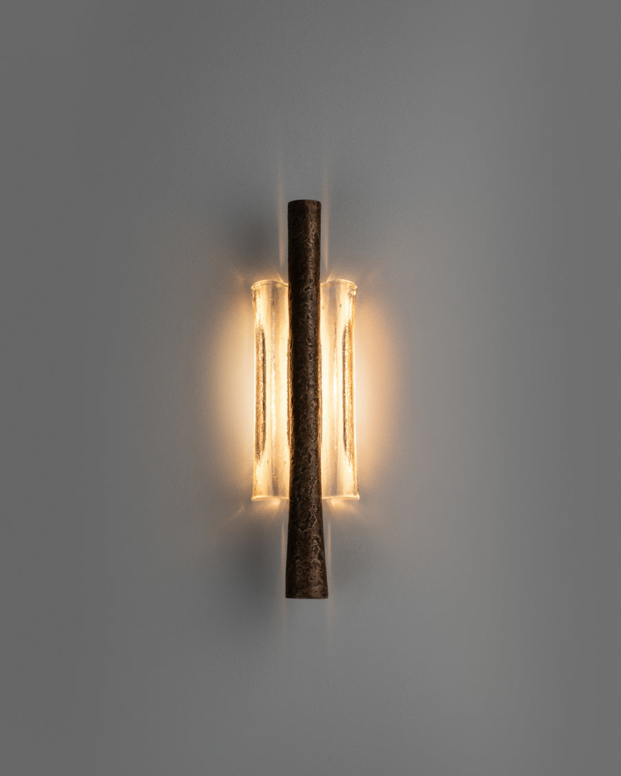 - Elevate your space with the Ondas Sconce, a stunning fusion of art and illumination. This piece captures the serene motion of the ocean in a functional design. A textured, solid bronze ingot appears to drift effortlessly within a gracefully cast glass form. As light passes through the glass, it mimics water, refracting and diffusing a soft, ambient glow throughout your room. Perfect for creating a focal point in a hallway, living room, or bedroom, the Ondas Sconce is more than a light fixture—it's a statement of sophisticated, organic design.