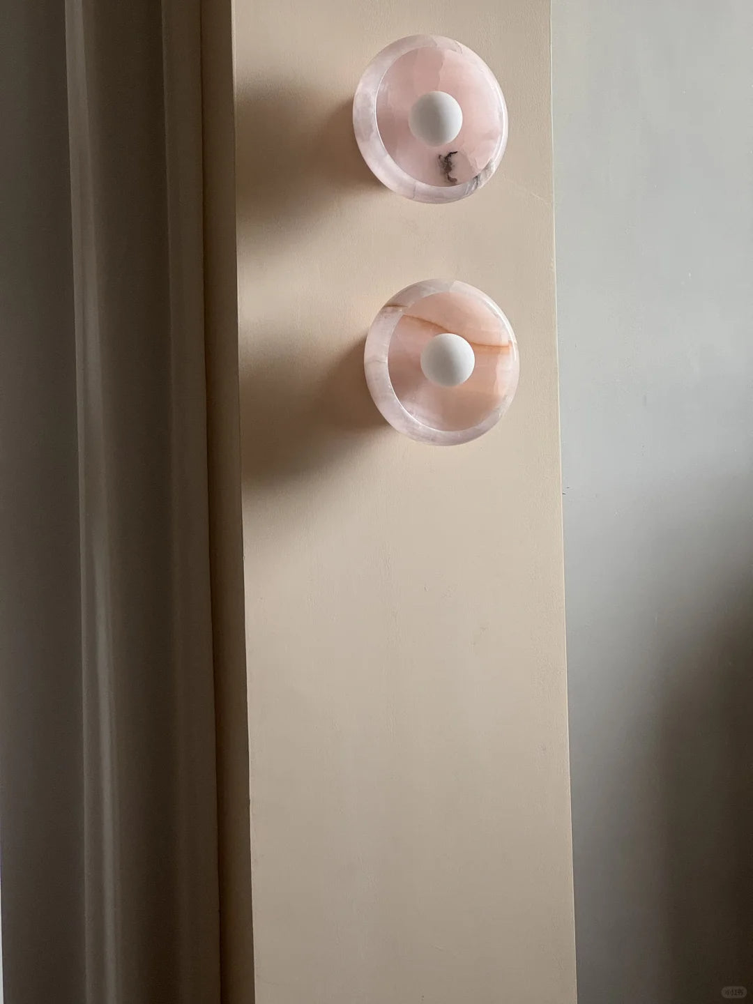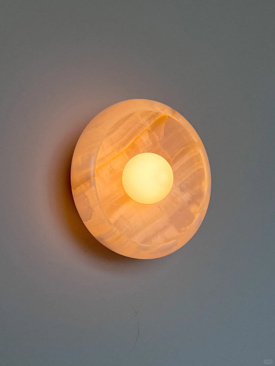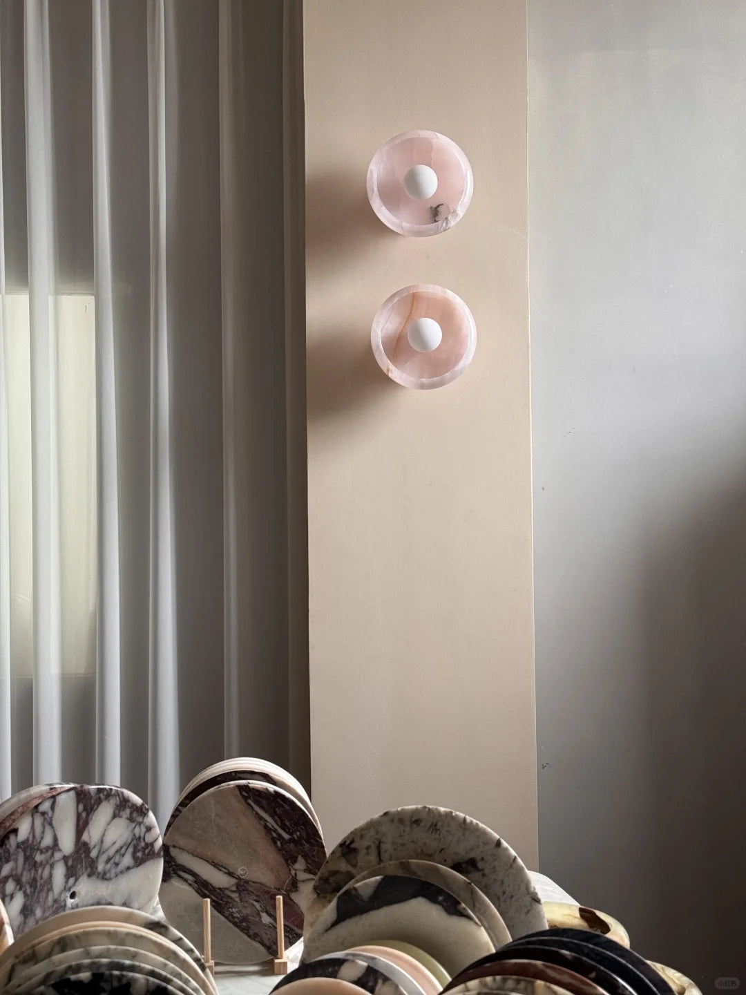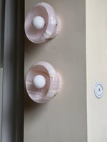 • Crafted from an exotic slab of luminous pink onyx, this sconce captivates with its incredible translucency, rich color, and mesmerizing depth, accentuated by striking brown veining. Each piece is a natural work of art, with unique patterns that glow softly when illuminated, casting a warm, ethereal light.