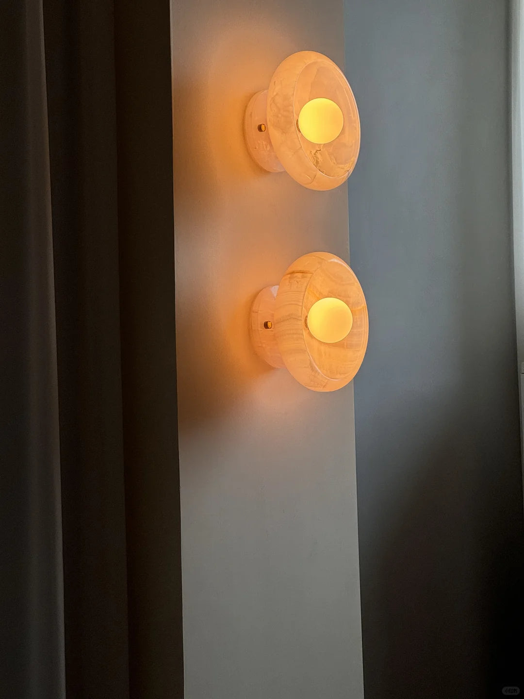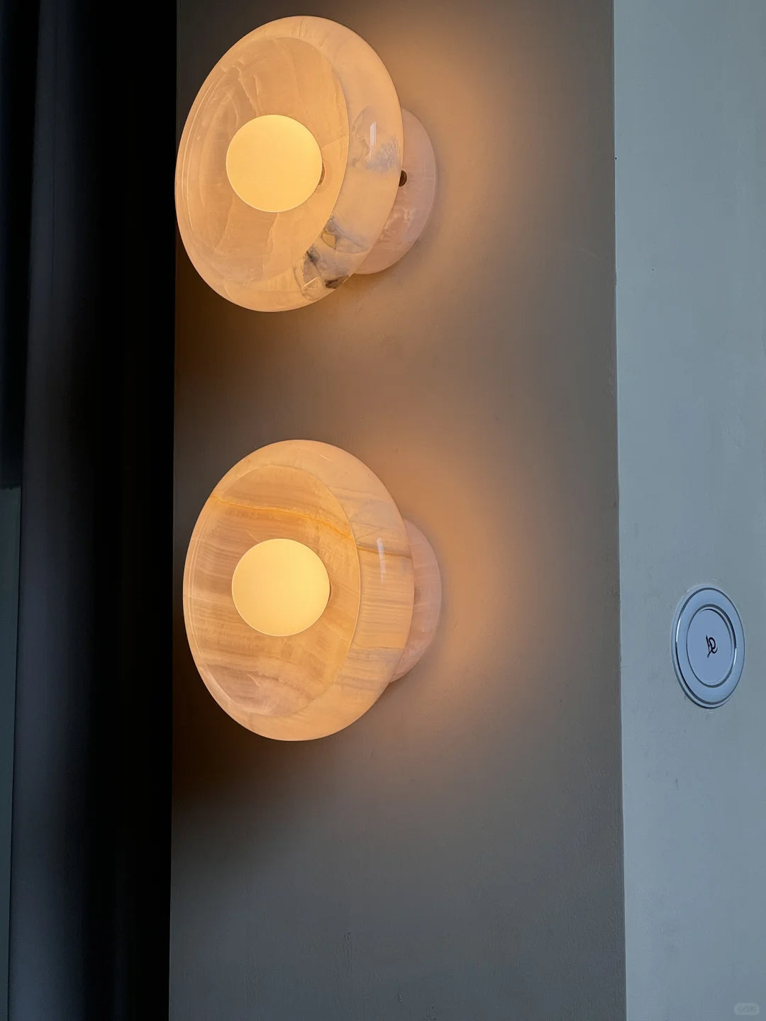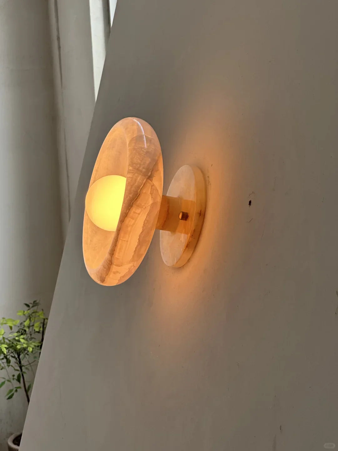 • Crafted from an exotic slab of luminous pink onyx, this sconce captivates with its incredible translucency, rich color, and mesmerizing depth, accentuated by striking brown veining. Each piece is a natural work of art, with unique patterns that glow softly when illuminated, casting a warm, ethereal light.