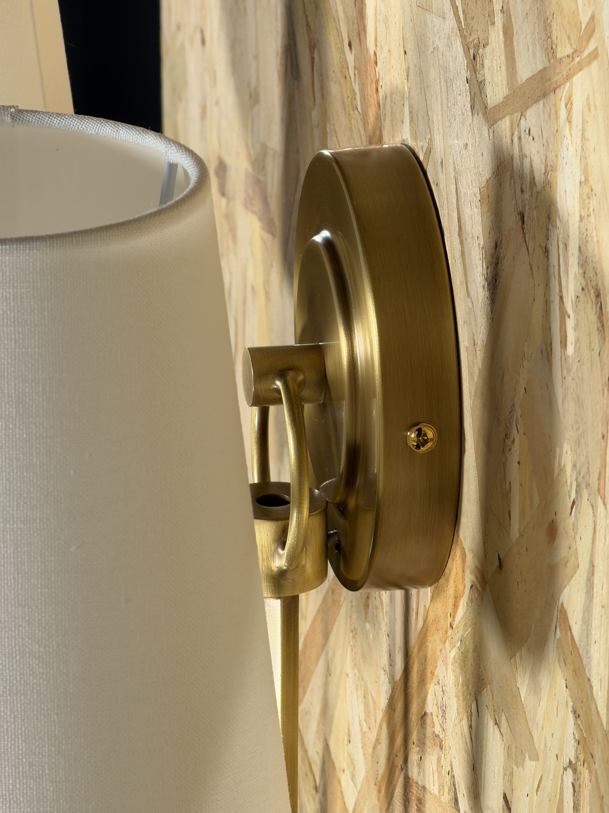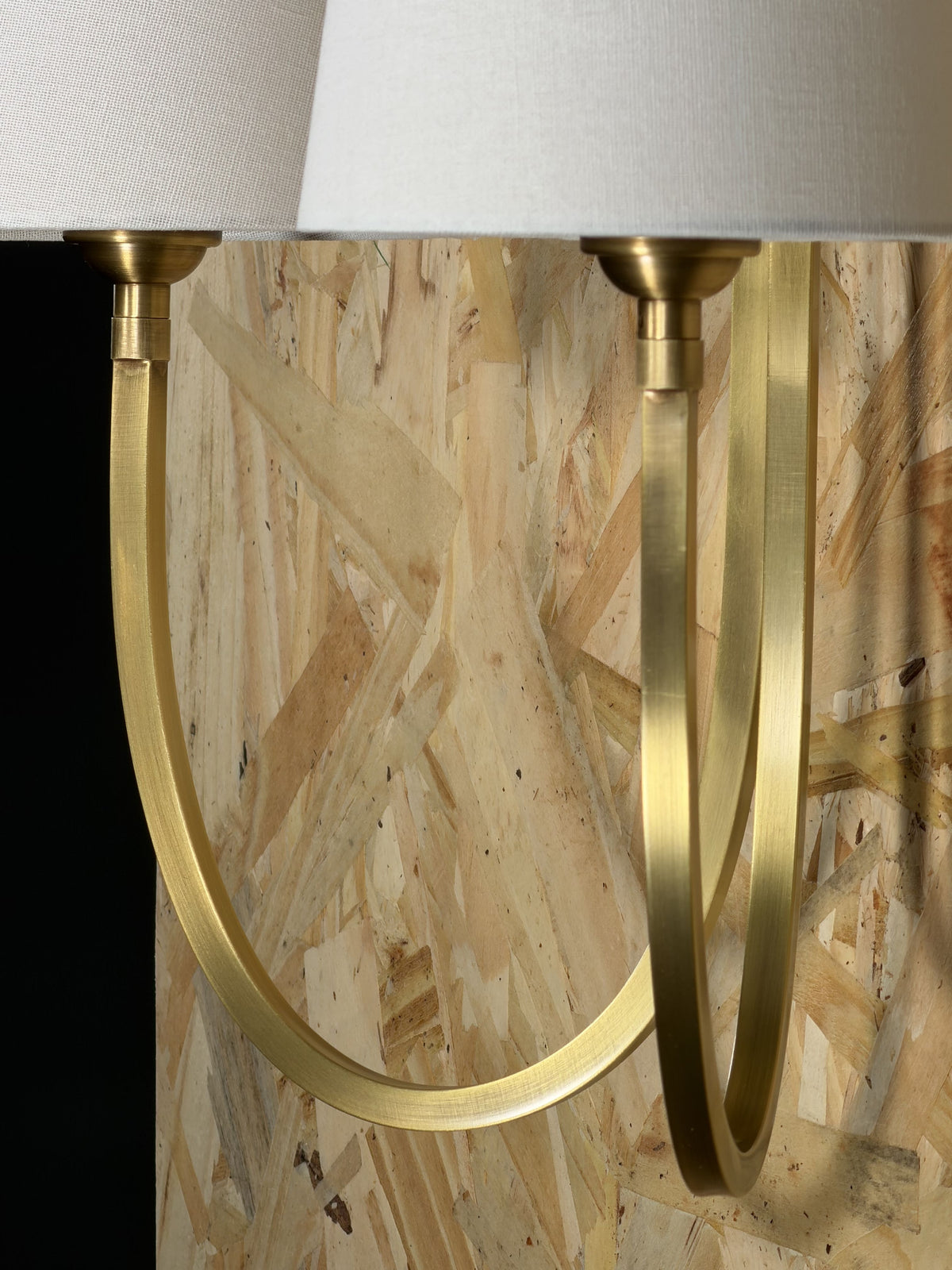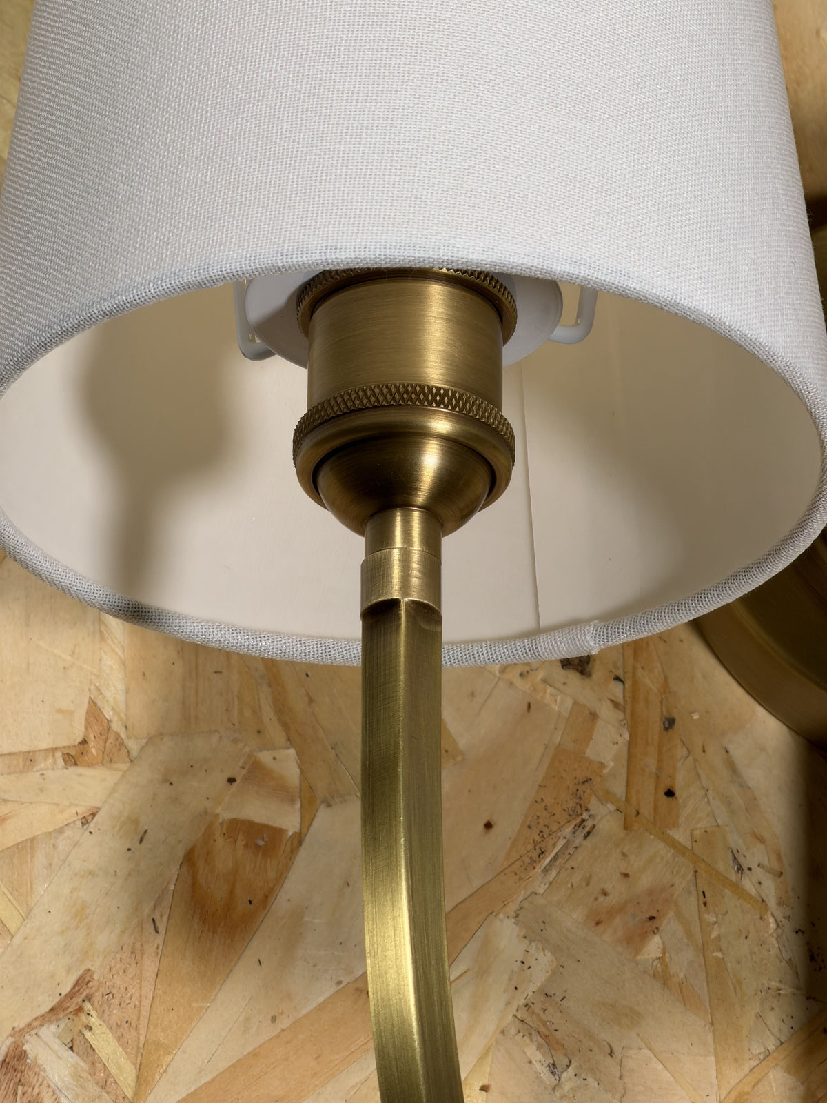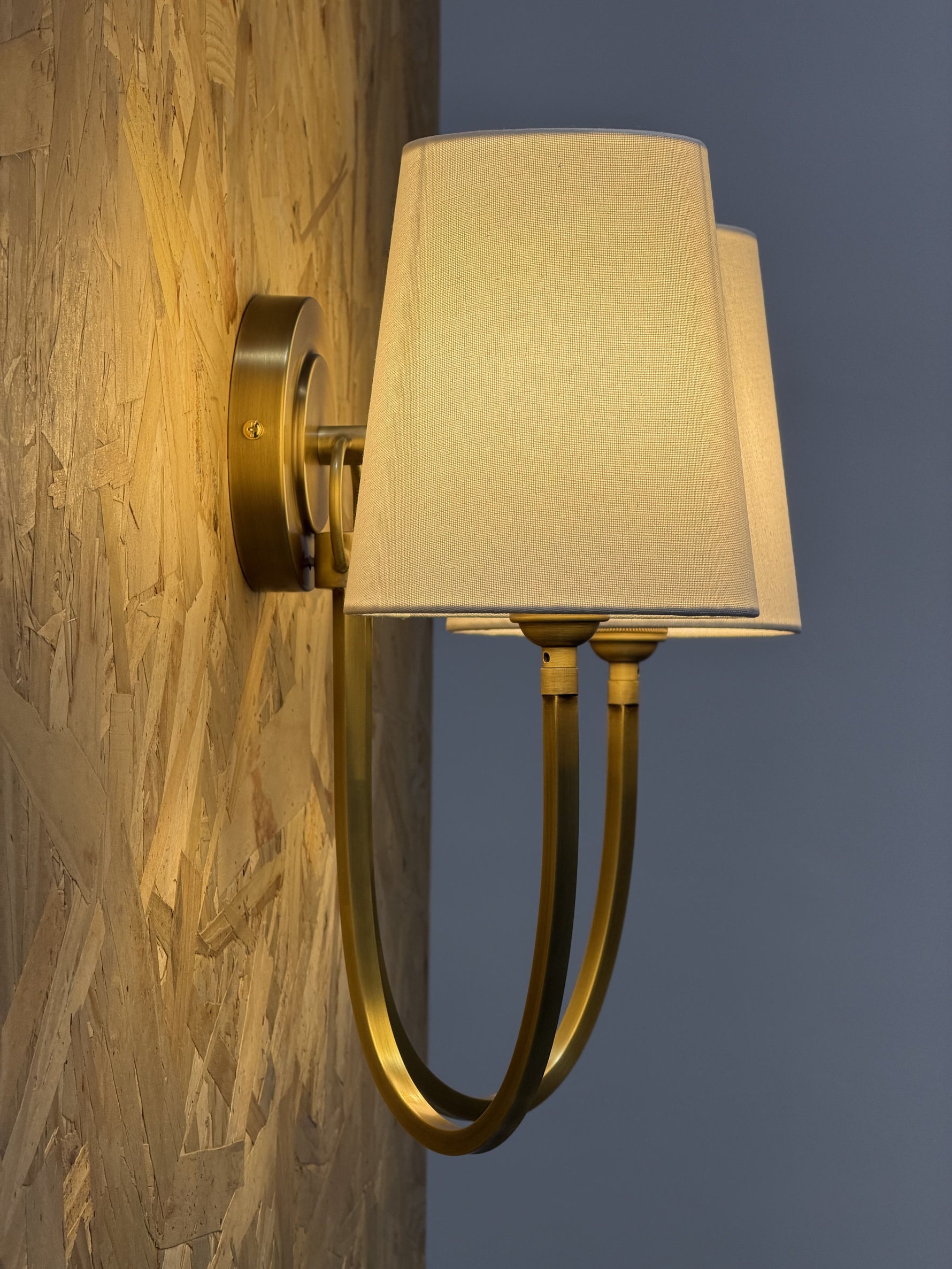 - The elegant brass arms are crowned with soft, neutral linen shades. These carefully selected shades work to gently diffuse light, eliminating harsh glares and casting a warm, inviting glow. Perfect for creating a tranquil and comfortable atmosphere where you can truly unwind after a long day.