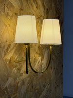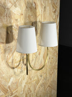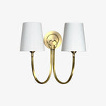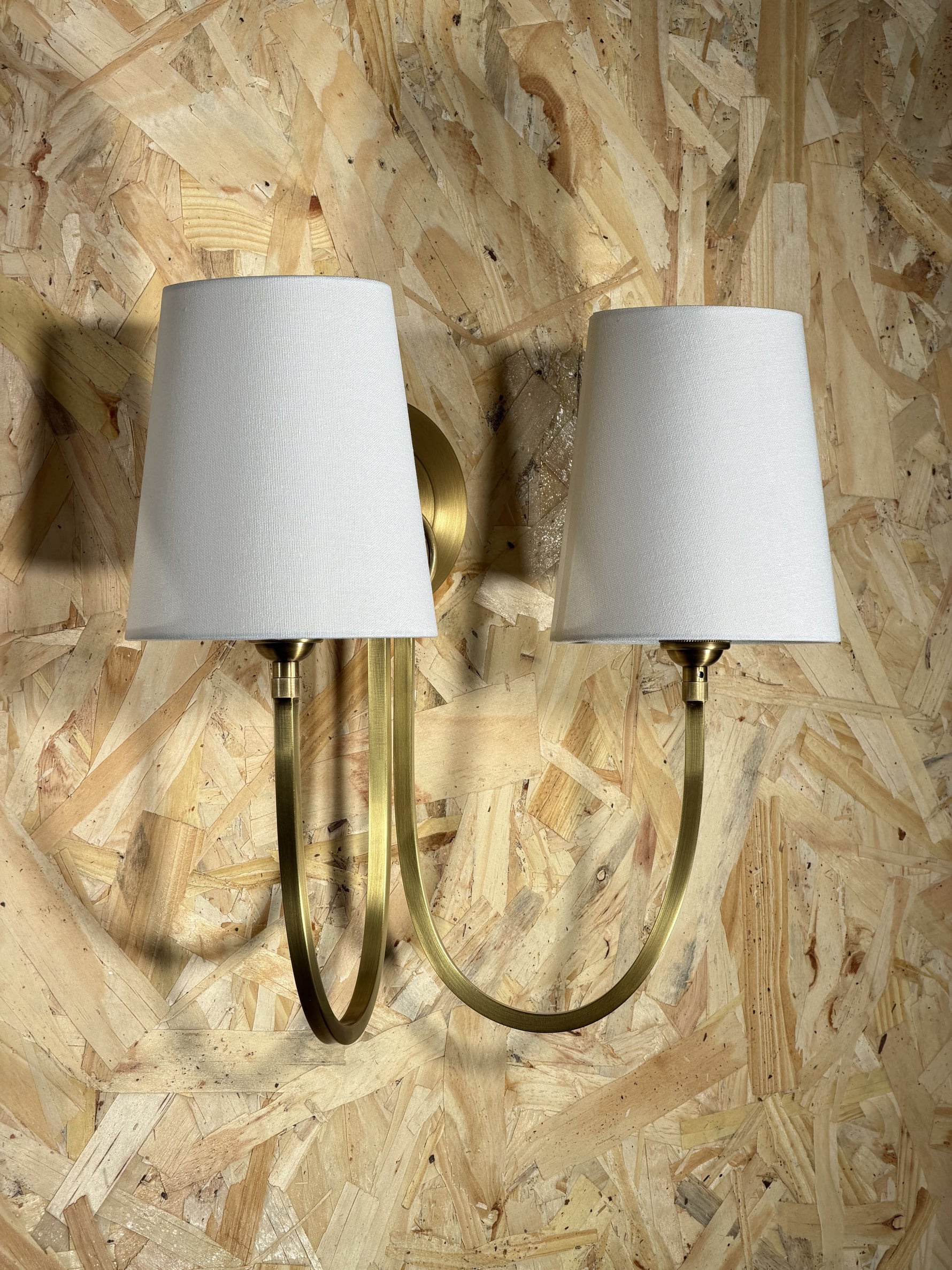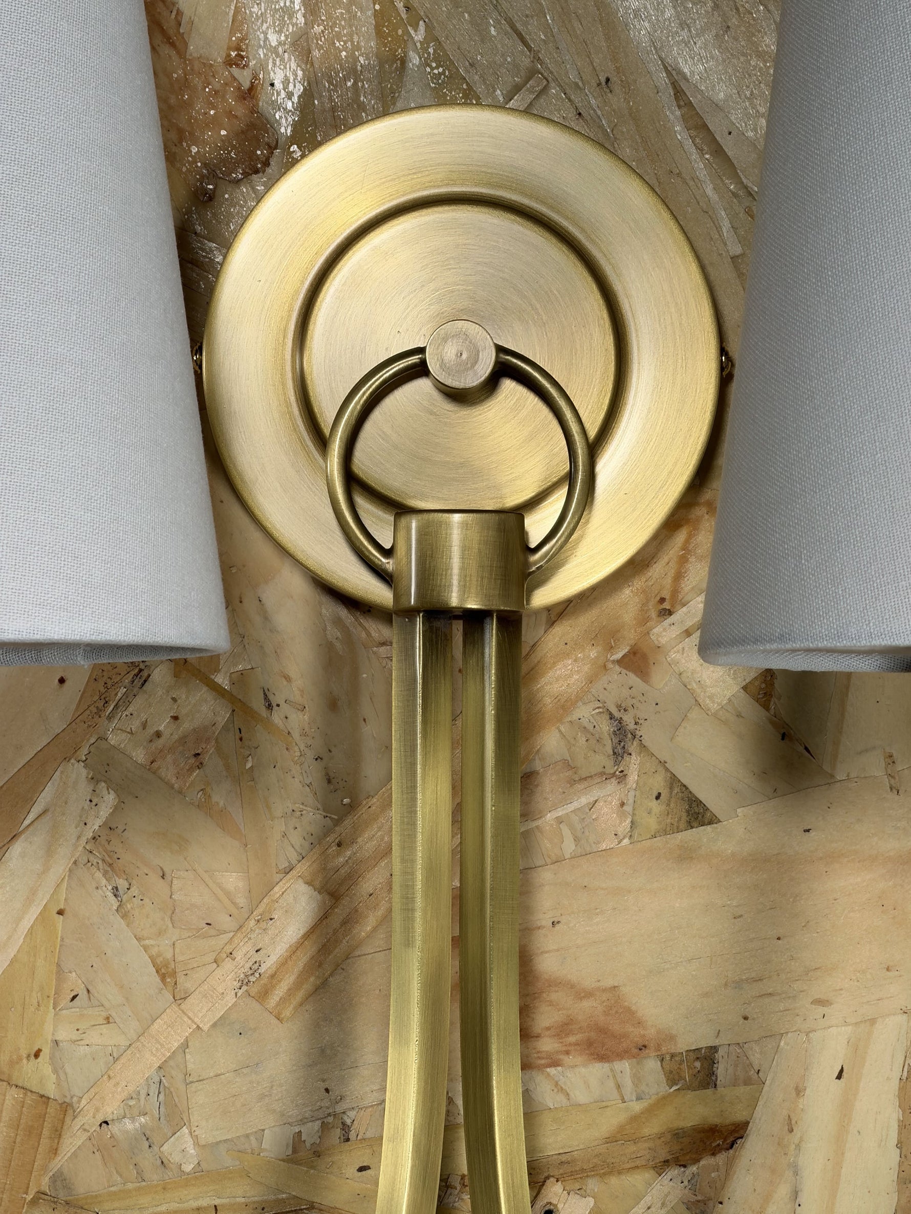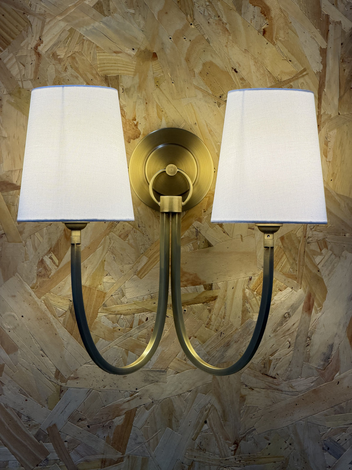 - The elegant brass arms are crowned with soft, neutral linen shades. These carefully selected shades work to gently diffuse light, eliminating harsh glares and casting a warm, inviting glow. Perfect for creating a tranquil and comfortable atmosphere where you can truly unwind after a long day.