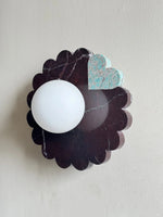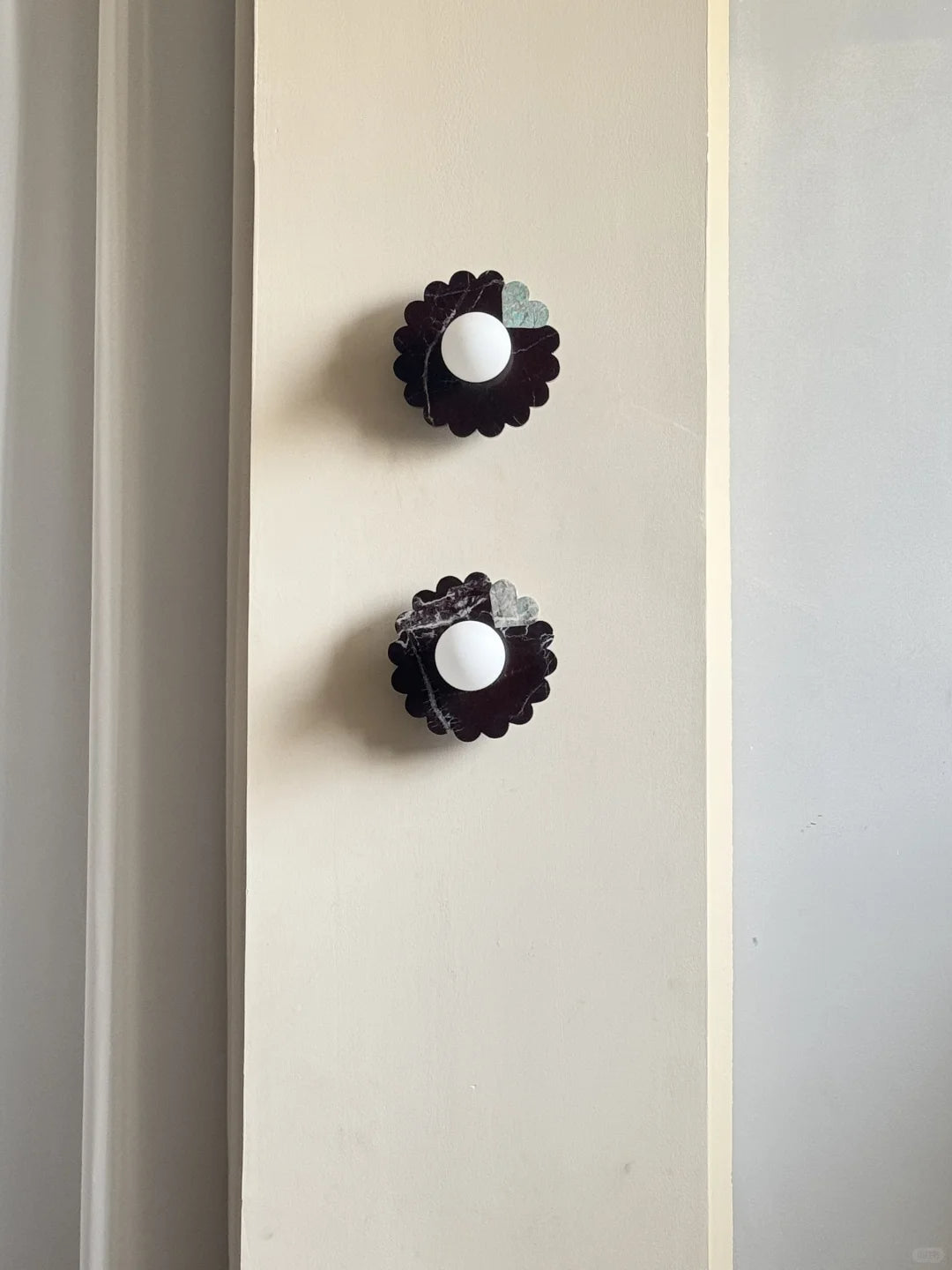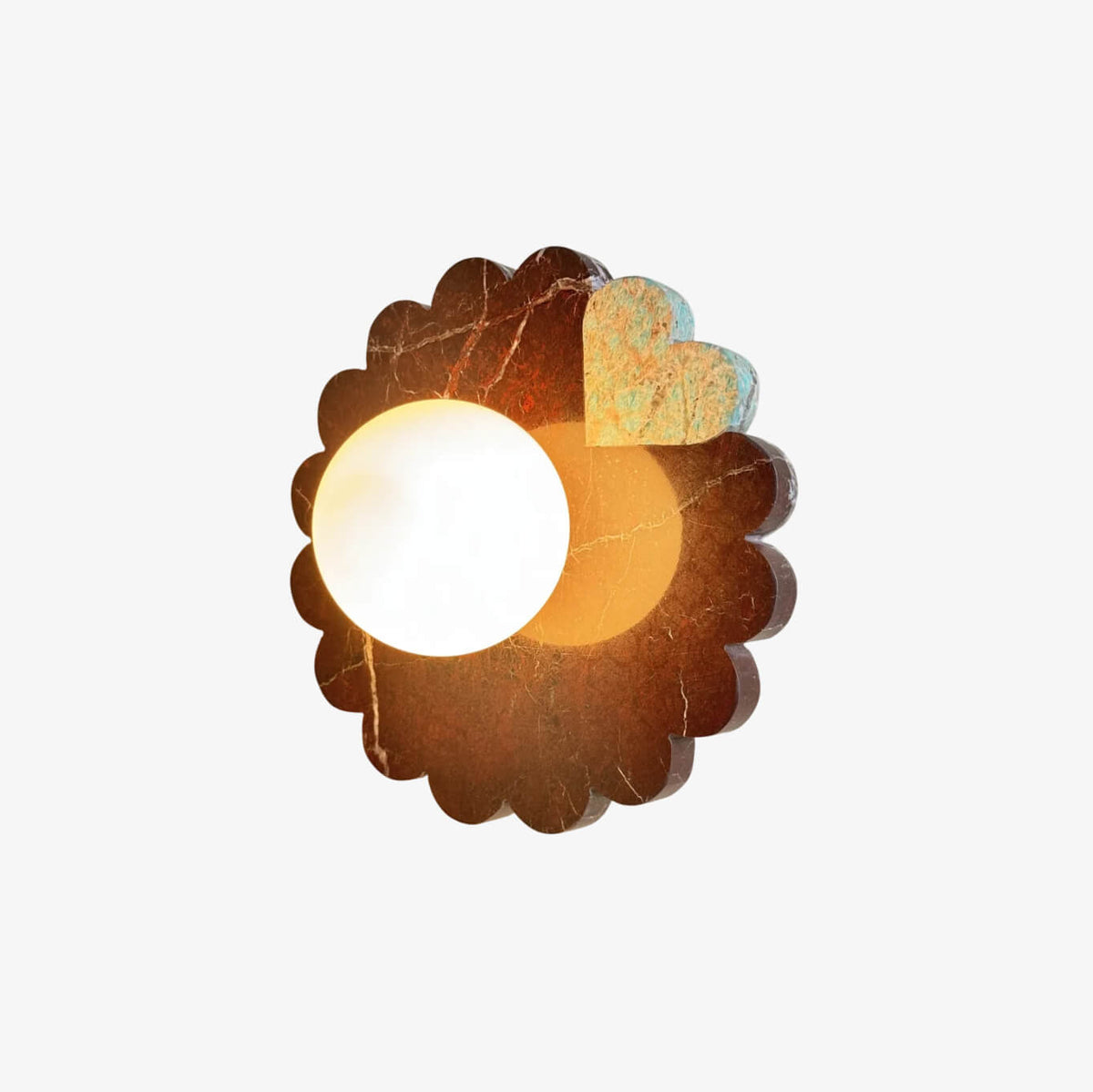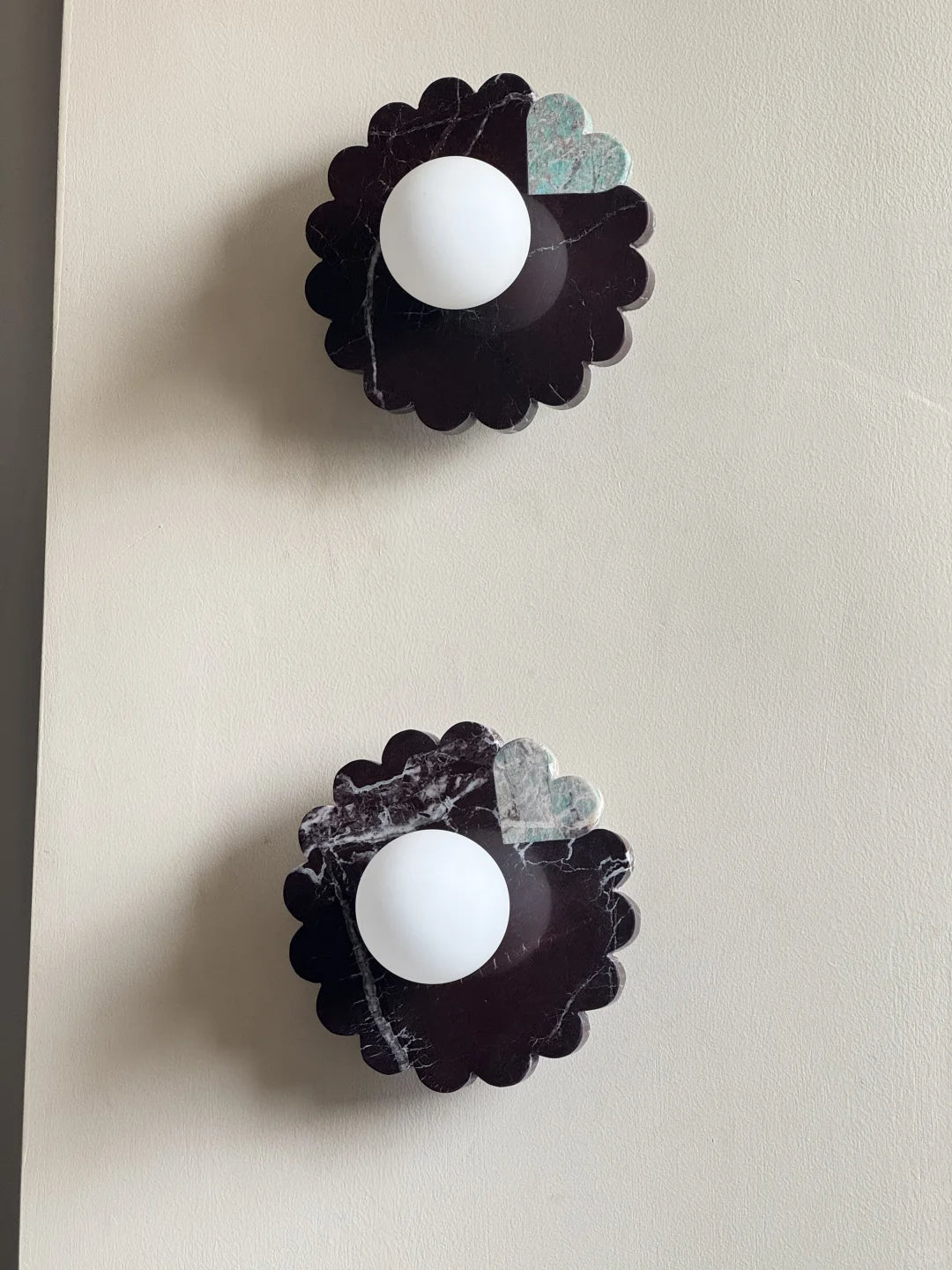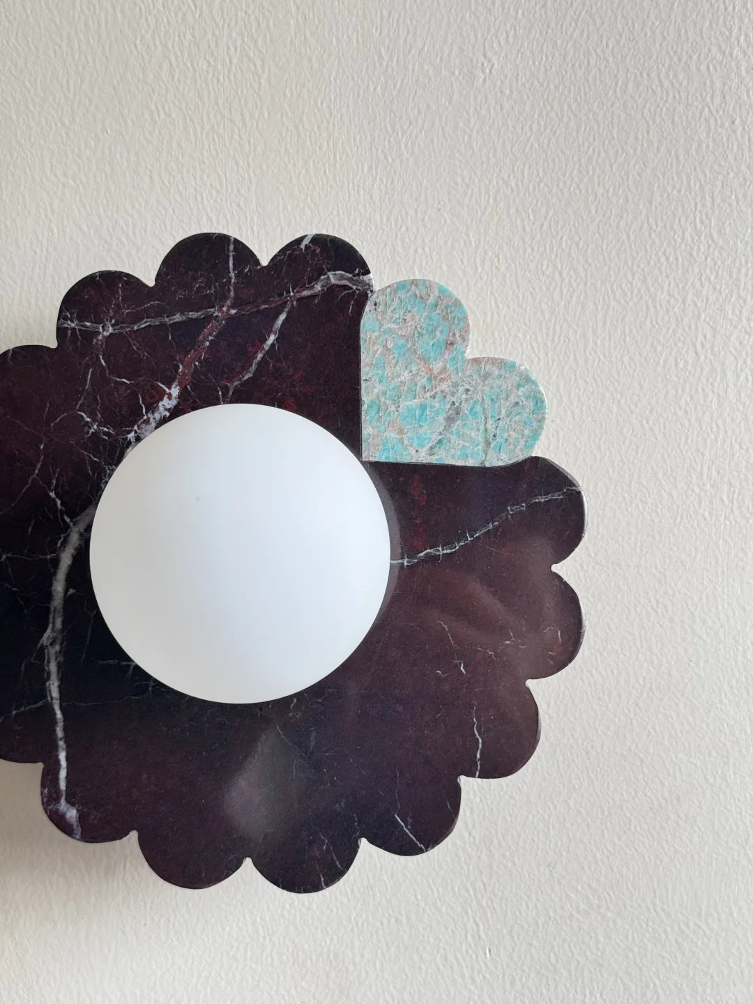 - A striking fusion of nature and artistry, the Spliced Wall Sconce blends Marquinhos marble and bold blue marble with an organic heart-shaped motif. Light dances across the contrasting textures—soft veining and deep, dramatic swirls—creating a mesmerizing play of color and shadow.