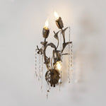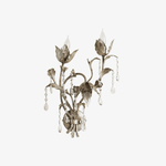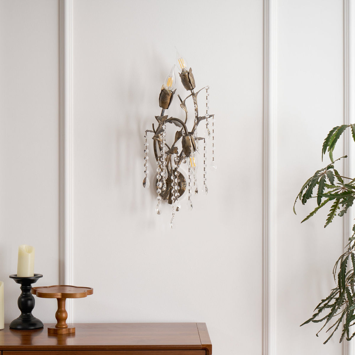 - The Stauch Wall Sconce is more than a light fixture—it's a piece of wall art. Meticulously crafted from iron with a distressed, aged finish, this sconce captures the beauty of a bygone era. Its intricate design mimics delicate floral forms, with detailed blossoms and foliage that appear to have naturally grown across your wall, preserved in a moment of perfect beauty.As light dances through the shimmering cascade of crystal embellishments, it creates a breathtaking display of refracted light, casting radiant patterns throughout your space.