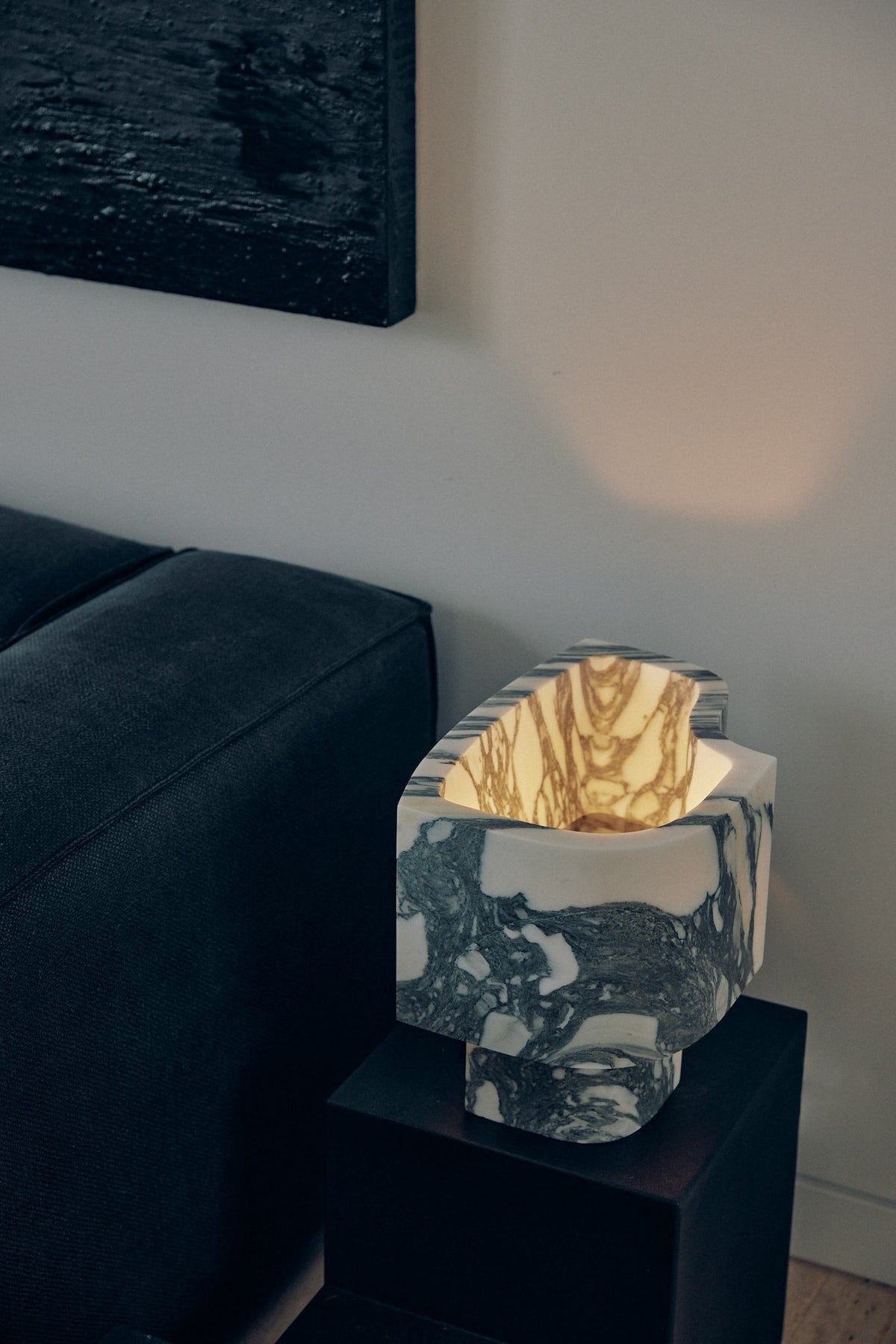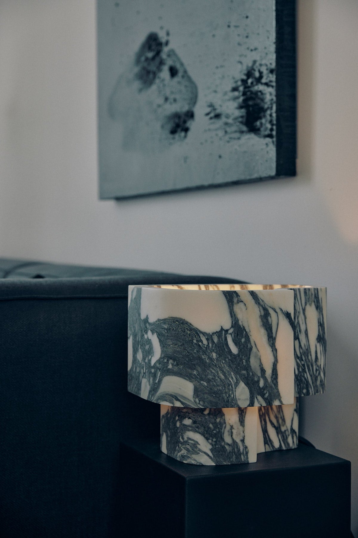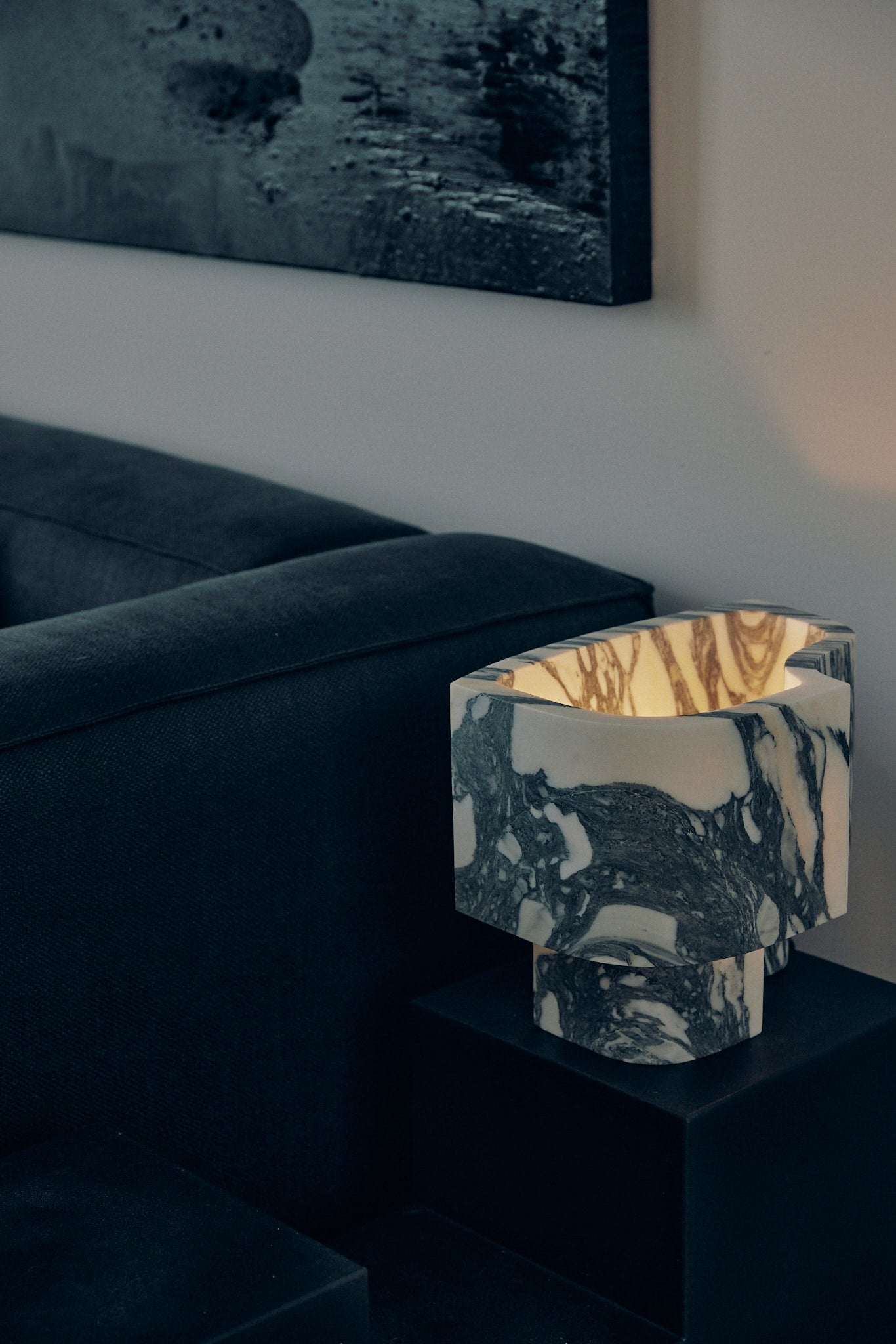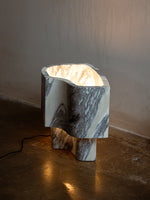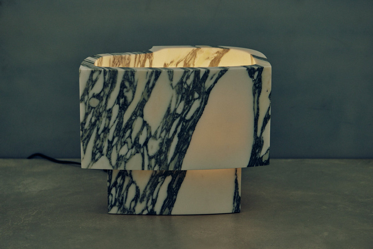 • Introducing the Offset Table Lamp, where dramatic art meets understated elegance. The defining feature is its gracefully offset shade, which appears as a dynamic extrusion from the solid marble base. This clever design allows a soft, subdued glow to escape, gently illuminating the lamp's own internal architecture and creating a captivating play of light and shadow.