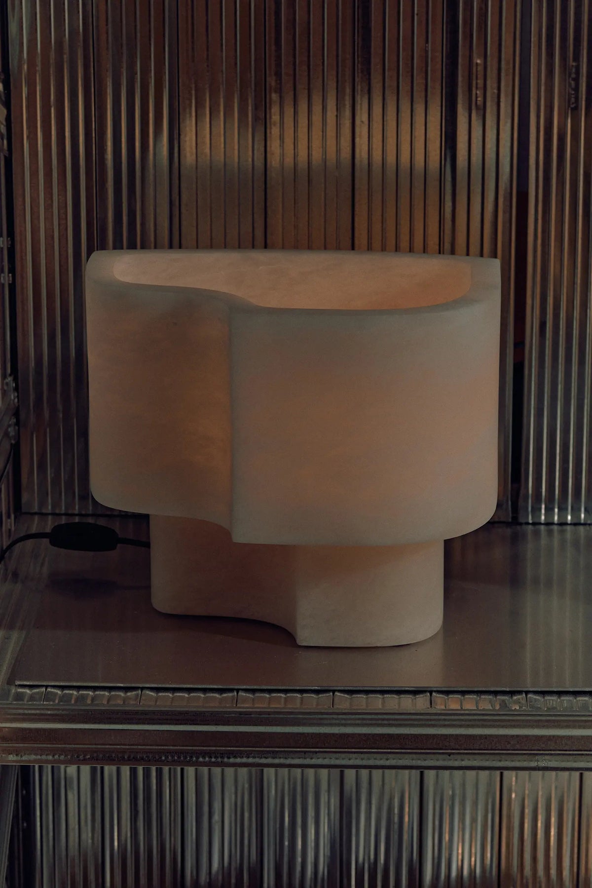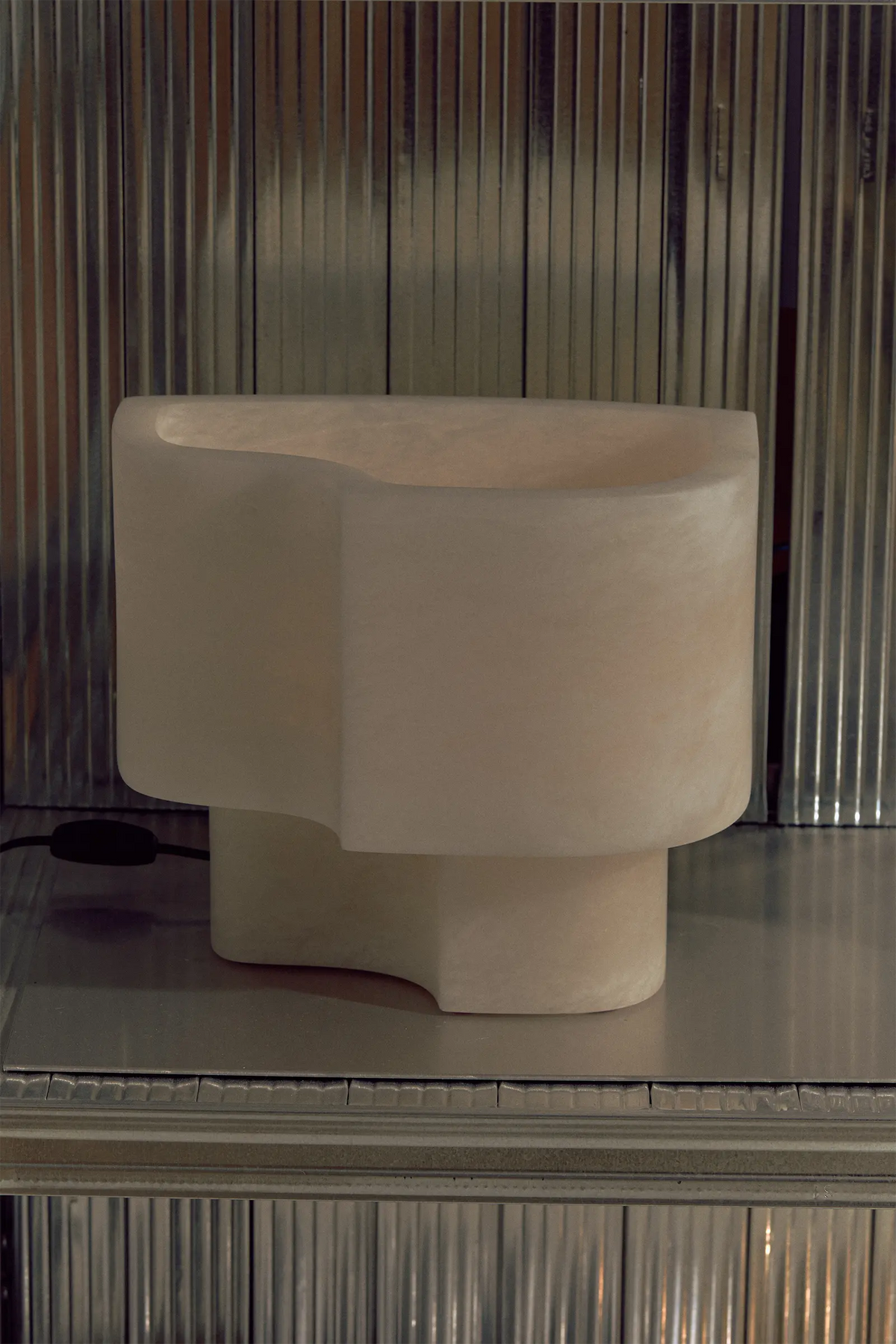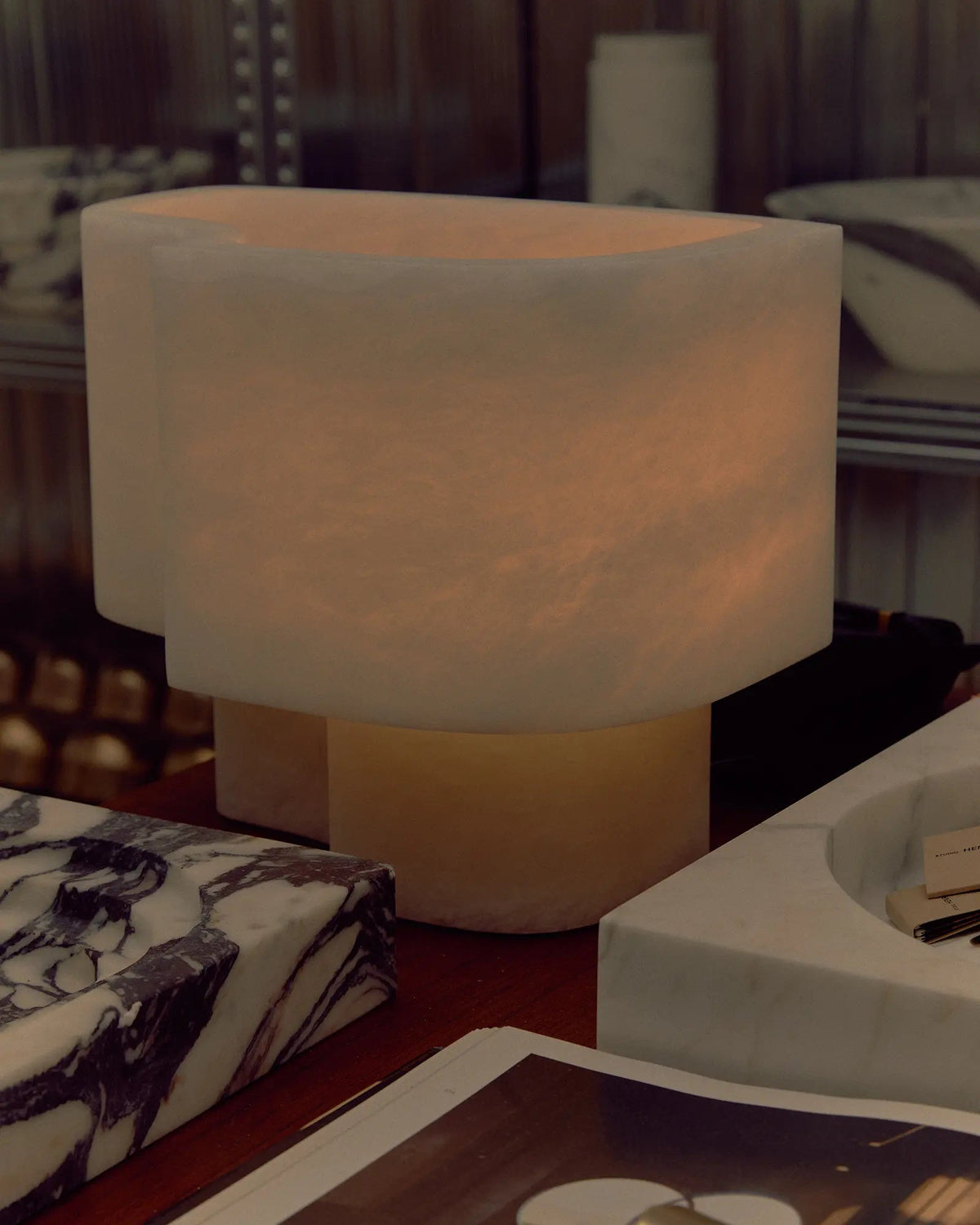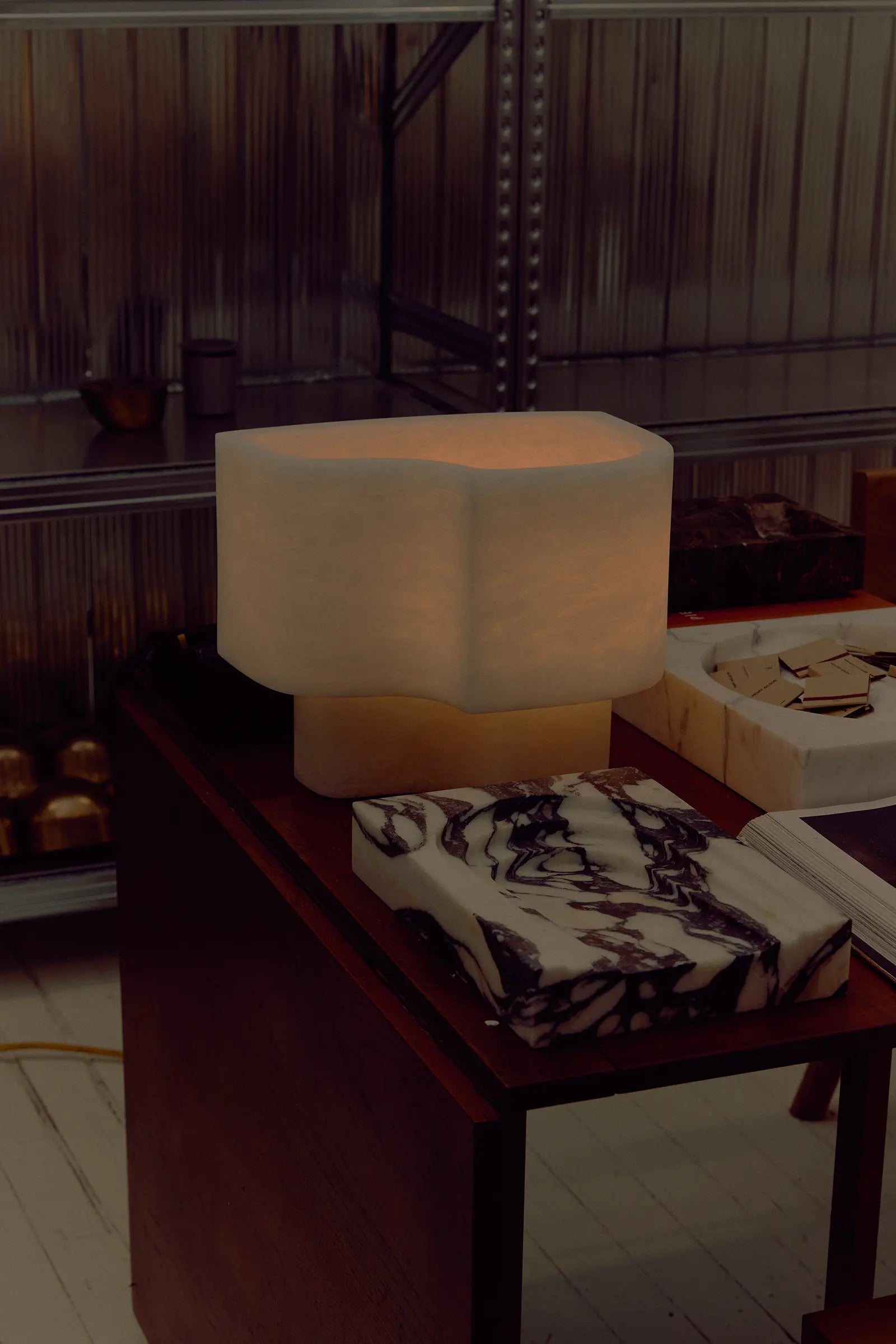 • Introducing the Offset Table Lamp, where dramatic art meets understated elegance. The defining feature is its gracefully offset shade, which appears as a dynamic extrusion from the solid marble base. This clever design allows a soft, subdued glow to escape, gently illuminating the lamp's own internal architecture and creating a captivating play of light and shadow.